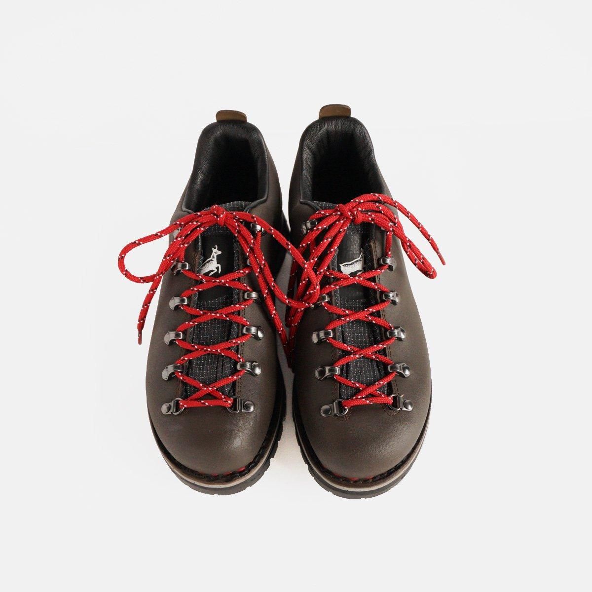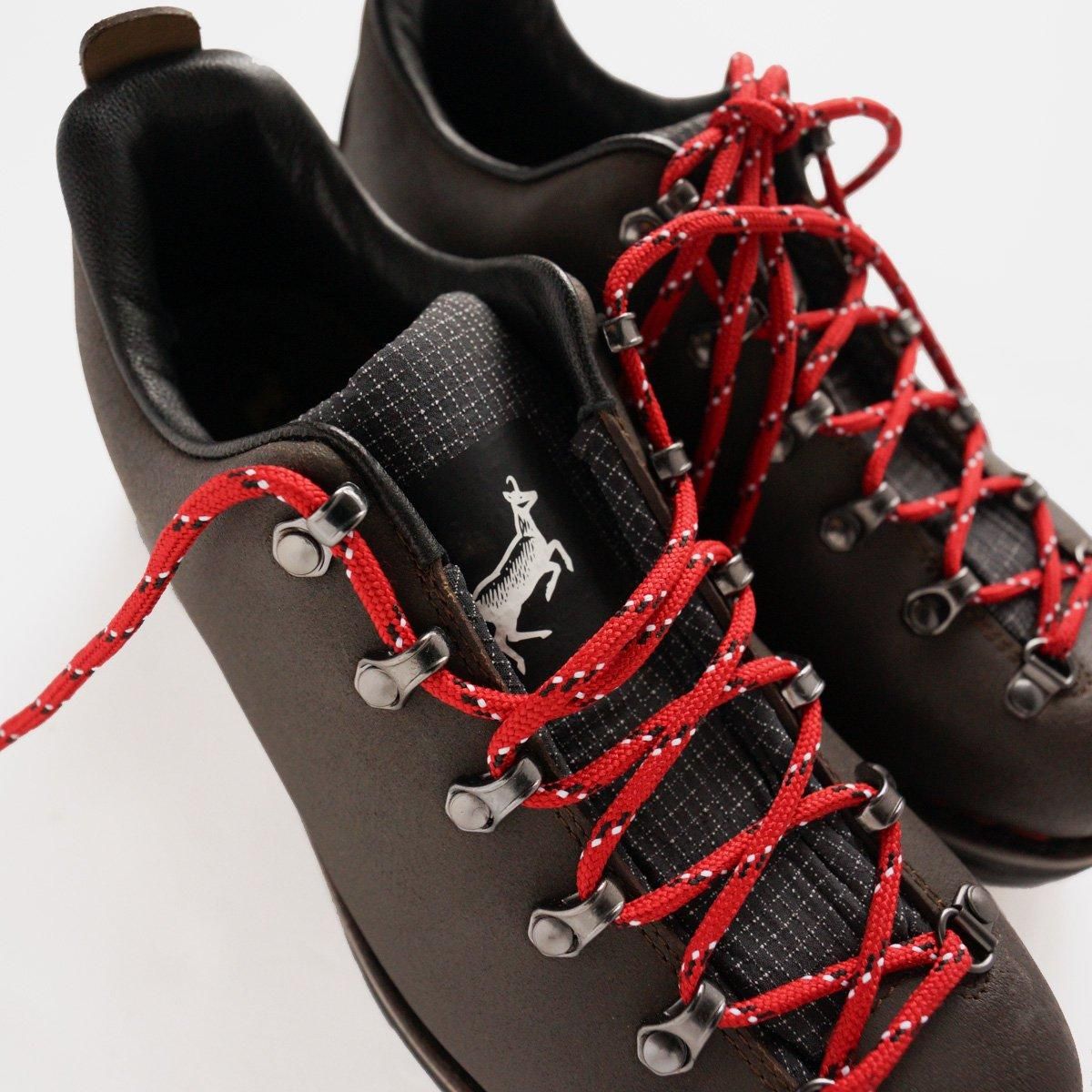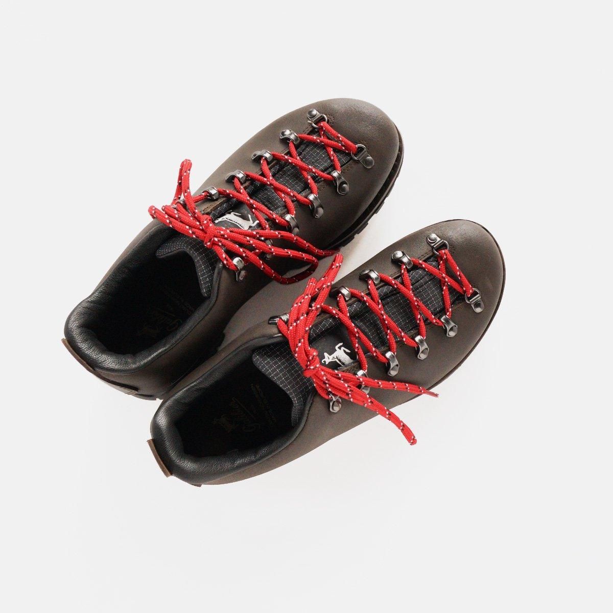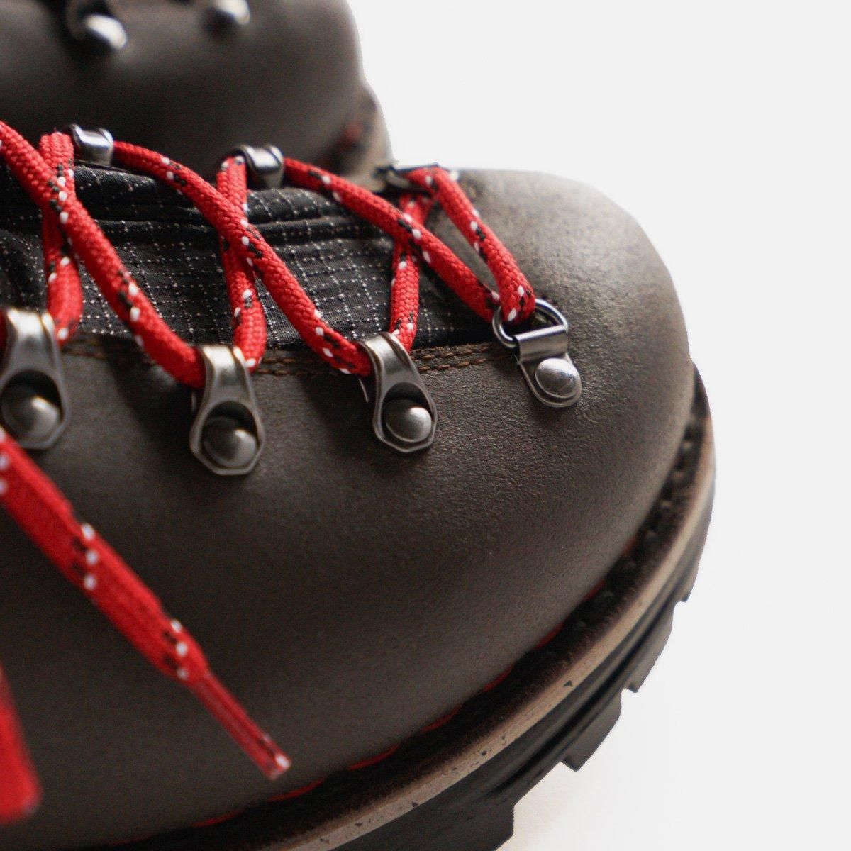 ・ノルヴェイジャン・ステッチの特徴は、アッパーとソールをつなぐ2本のステッチにあります。目に見える横の縫い目は、アッパーとインソールをつなぎ、「ノルヴェイジャン製法」として知られています。スモールステッチと呼ばれる縫い目は、アッパーとミッドソールをつなぎ、そこにビブラム社のアウトソールが圧着されています。この組み立てにより、堅牢性と密閉性が保証されています。