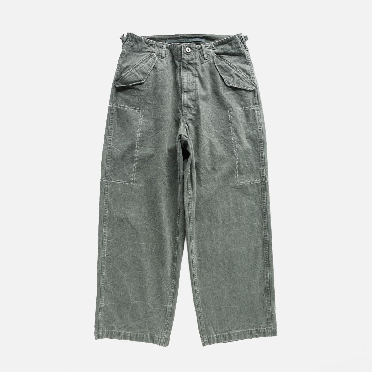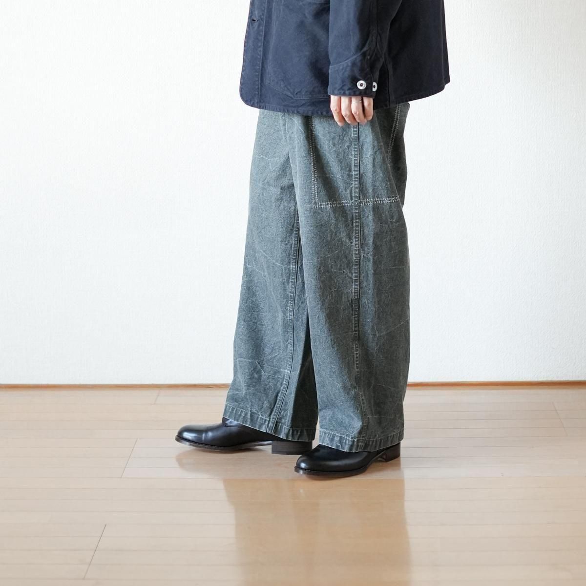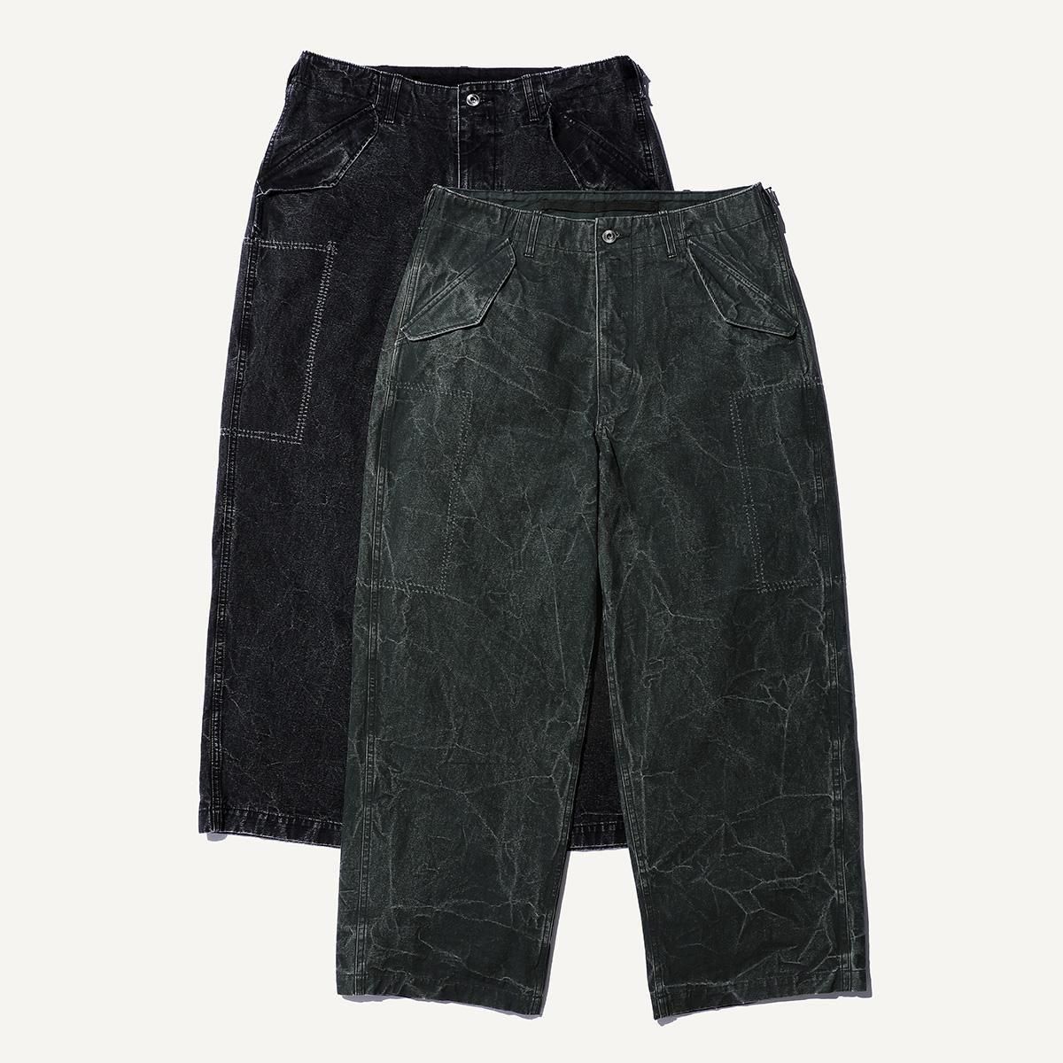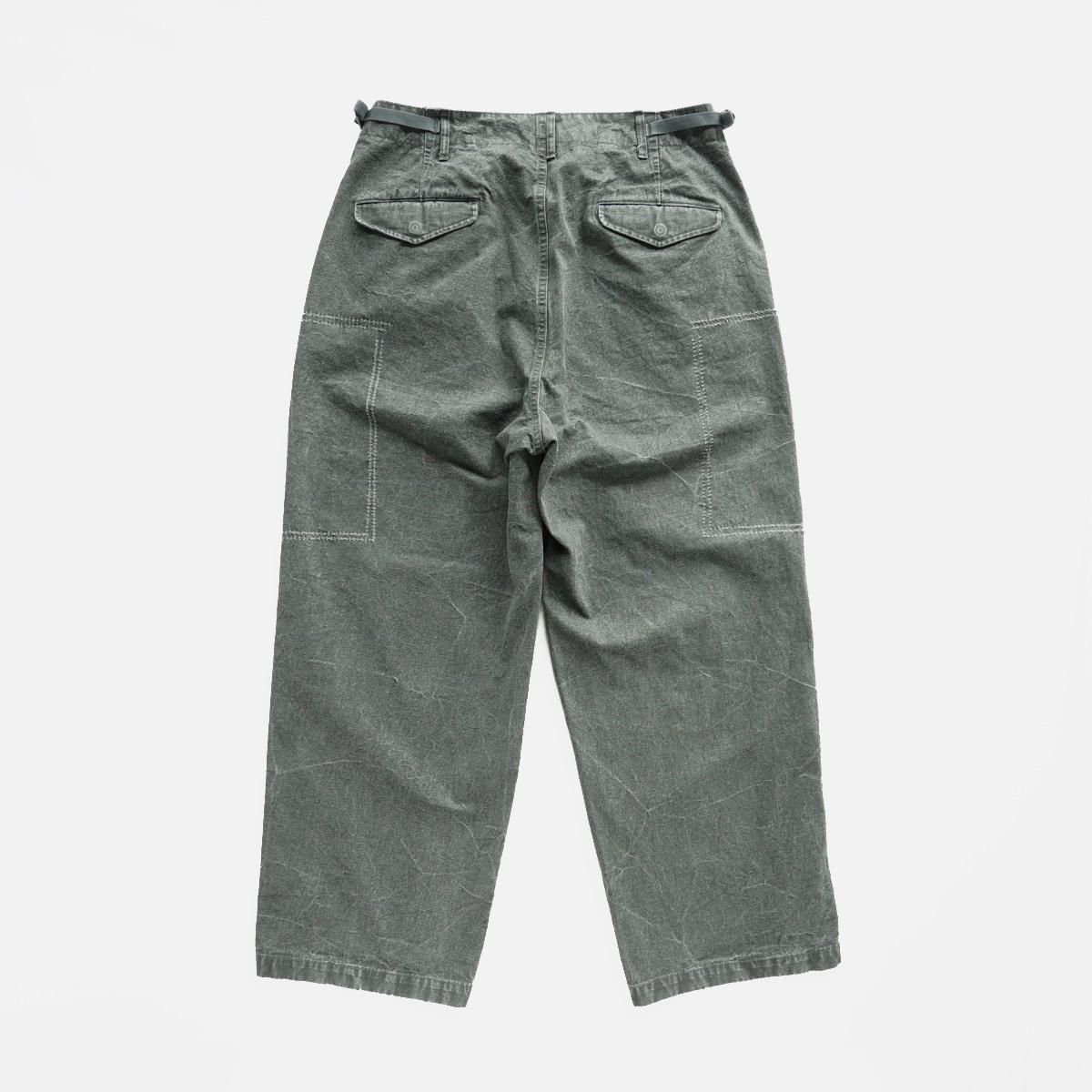 ワタリと膝幅を広げたボリュームのあるワイドテーパードシルエット。いわゆる米軍のオリーブではなく、アグレッサーカラーからインスピレーションを受けたグレー味のあるグリーンとなっております。表地は経緯共に強撚したオーガニックコットンの太番手の糸を使用したコットンキャンバ スに両面顔料コーティングを施した生地を使用しています。※製品加工を施しているので、1点1点、風合いや色、ダメージが異なります。