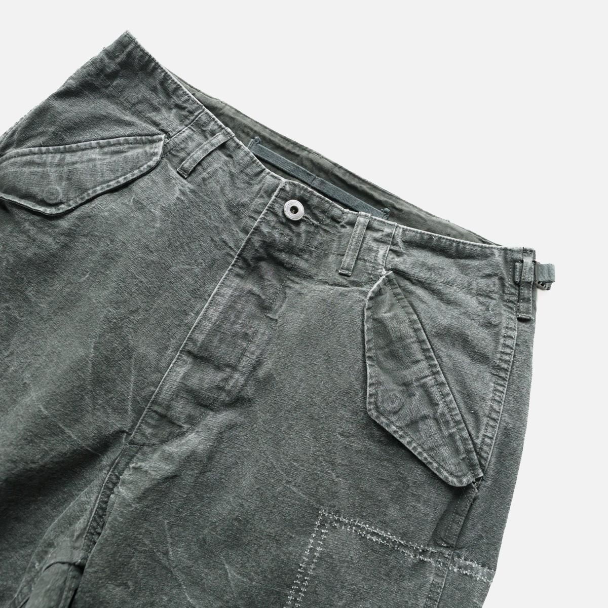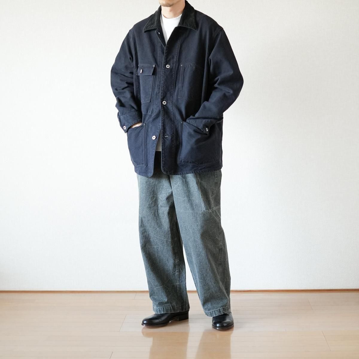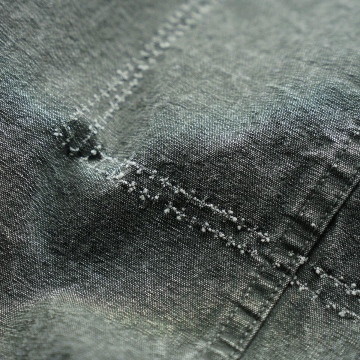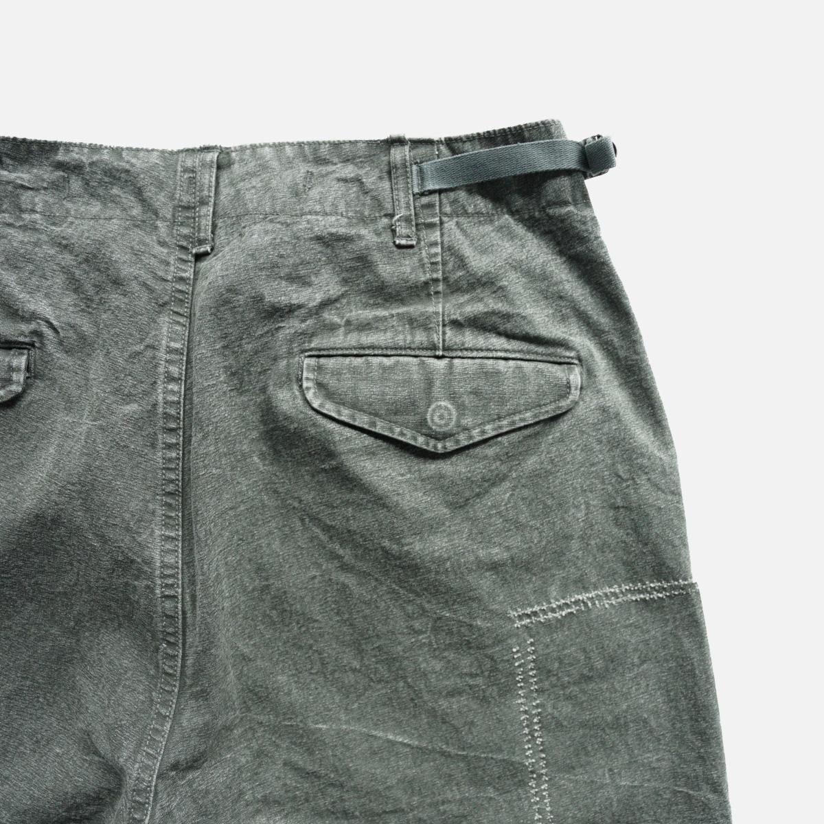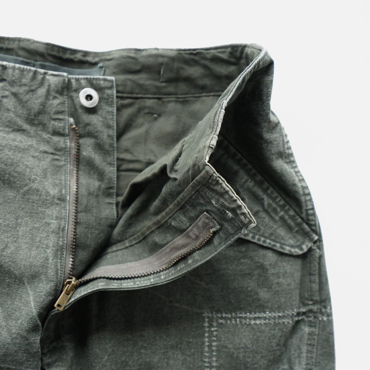 ワタリと膝幅を広げたボリュームのあるワイドテーパードシルエット。いわゆる米軍のオリーブではなく、アグレッサーカラーからインスピレーションを受けたグレー味のあるグリーンとなっております。表地は経緯共に強撚したオーガニックコットンの太番手の糸を使用したコットンキャンバ スに両面顔料コーティングを施した生地を使用しています。※製品加工を施しているので、1点1点、風合いや色、ダメージが異なります。