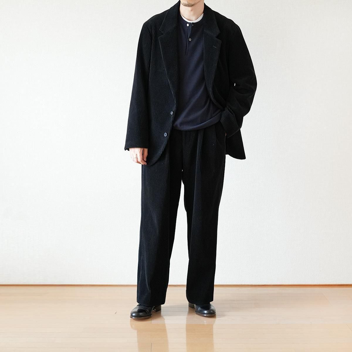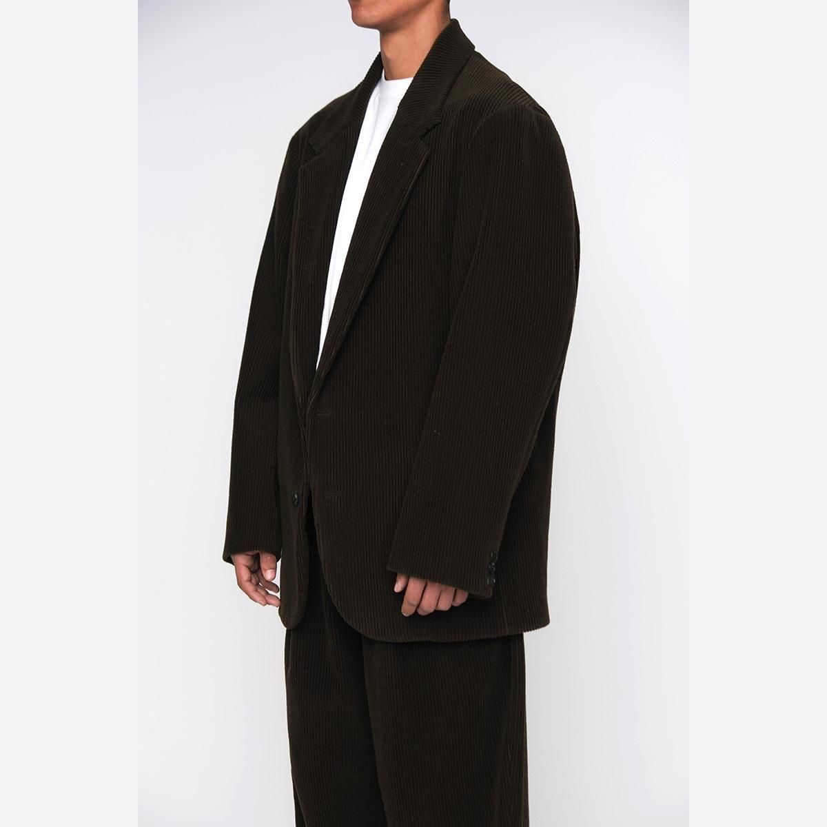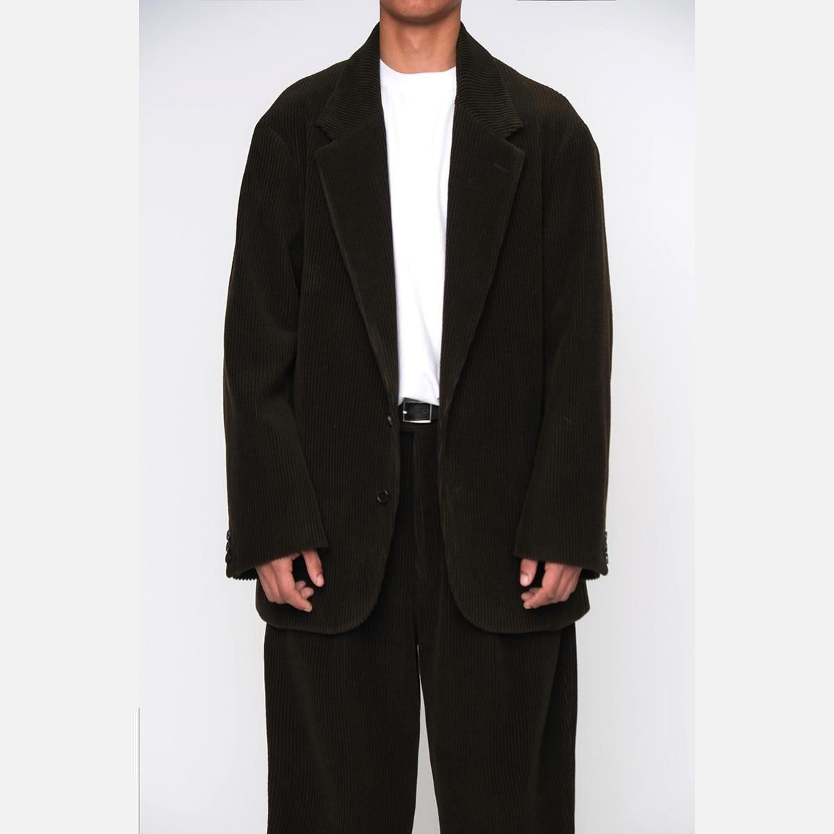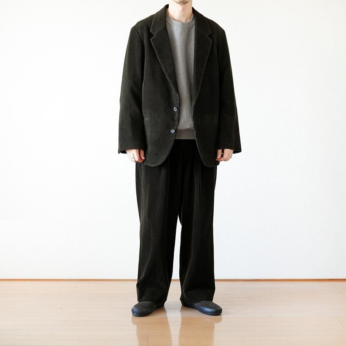 シングルブレステッド2Bジャケット。ややゆとりを持たせたシルエットで低めに設定したゴージラインのナチュラルショルダー。縫製は本格的なテーラード工場で丁寧に仕立てられています。表地は、経糸にスーピマコットン、緯糸にニュージーランド産のsuper160'sエクストラファインメリ ノウールを使用したウールコーデュロイ。太畝の山が綺麗な丸に仕上がる様に起毛されているのが特徴で、経糸のコットンの密度がしっかりとしている為、一般的なウールコーデュロイより毛抜けも少ないのが特徴です。裏地は、シルク/コットンのタフタシルクの光沢を、仕上げ工程でフィブリルさせることで落ち着かせたもの。滑りも良くとても軽い仕上がりです。