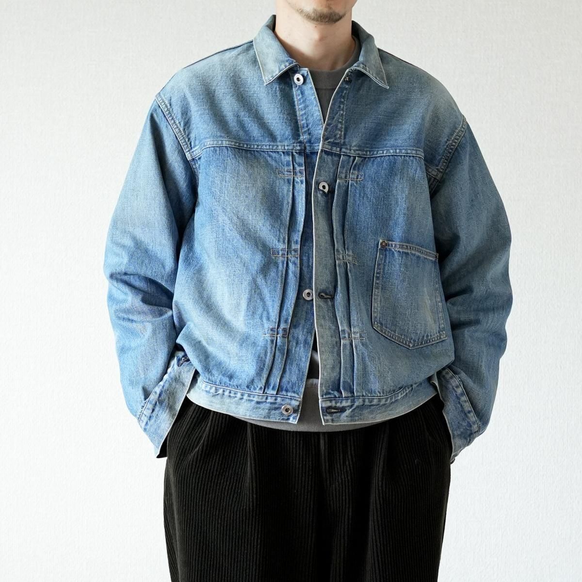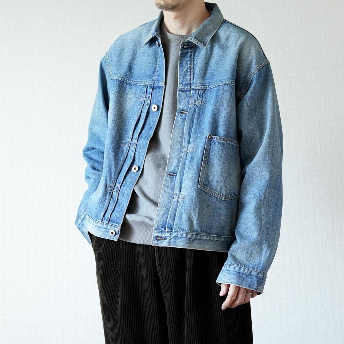 S213がベース→大戦型より前後のヨーク位置が少し低めの設定のデニムジャケット。左胸ポケットの位置が低めの設定です。表地は不均一なムラ形状を、複数種の異形状の糸をミキシングして織ることで表現しています。幾度となく研究して導きだしたインディゴの糸染め回数と時間の調整により、この絶妙な色を作り出しています。自然な経年変化を、手作業により再現 ヴィンテージを再現した加工感は、耳の色落ちまでこだわり、経年変化での退色したグレーカラー のセルビッチも特徴です。