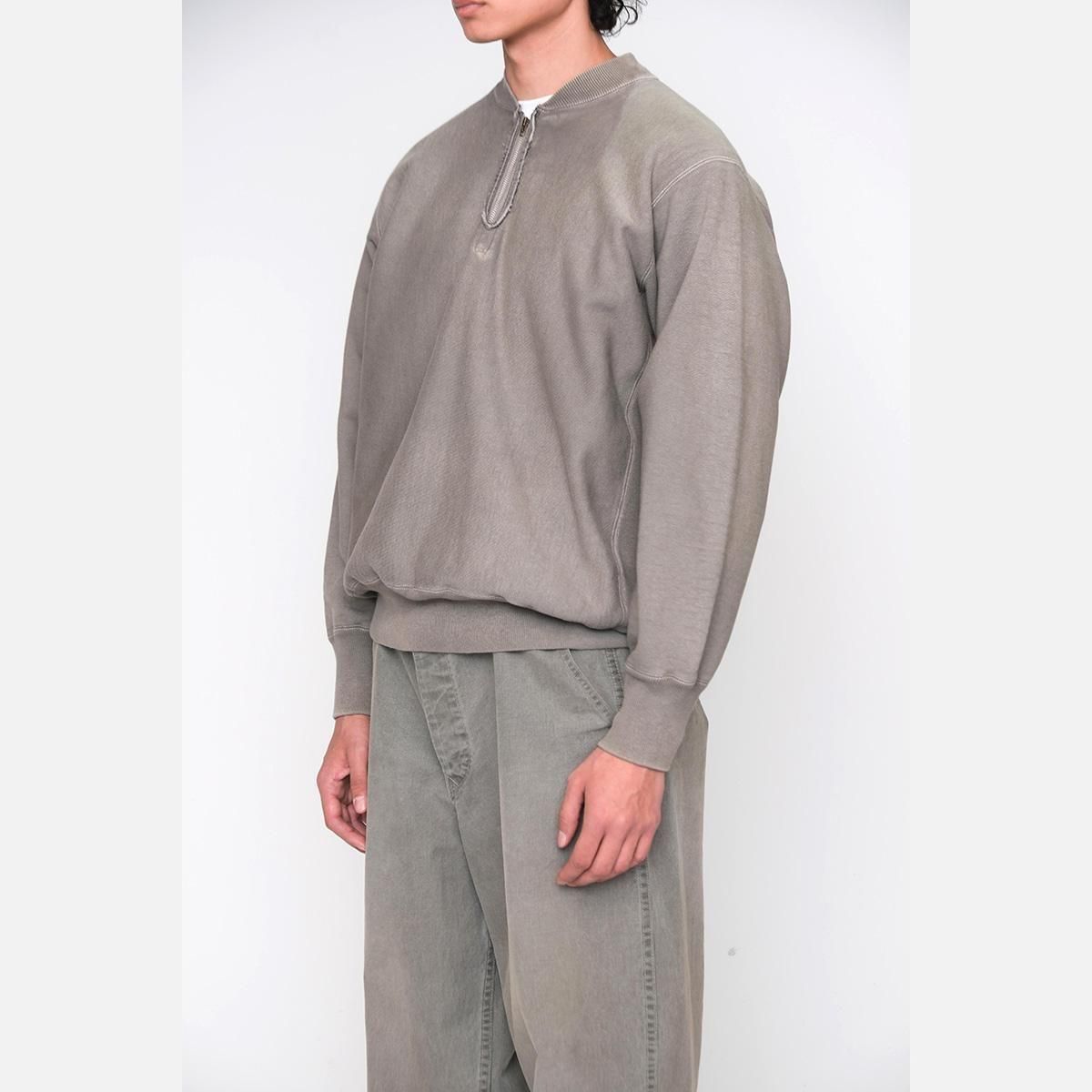 ヴィンテージを踏襲し、縫製仕様も忠実に再現した襟にリブがついているハーフジップスエット。ヴィンテージ感のある短丈で、袖は太くせず適度な太さに設定。インナーにも使いやすいちょうど良いゆとり感です。肩ハギがないヴィンテージのディティールを忠実に再現し、丸みのあるシルエットに仕上げています。裏起毛生地はベースアイテムの糸を解析し作成。表糸が少し太番手で、裏糸の起毛具合もヴィンテージの経年変化した半起毛が特徴です。ヴィンテージを踏襲し職人による手作業で色むらやダメージの経年変化を表現。※職人による手作業での加工のため、1点、1点、加工感は異なります。擦れ、小傷などの個体差もデザインの一部としてご了承ください。※ヴィンテージ感を追求することで、色によっては耐光堅牢度が悪く、変色の恐れがありますがご了 承ください。※モデル着用画像は色違いです。