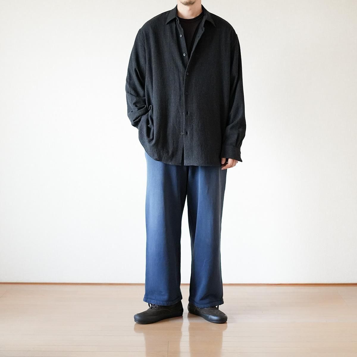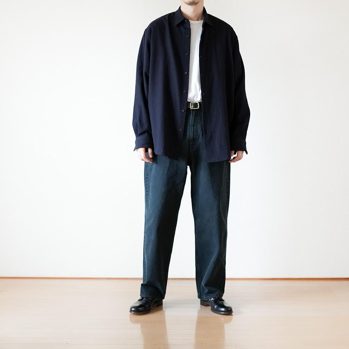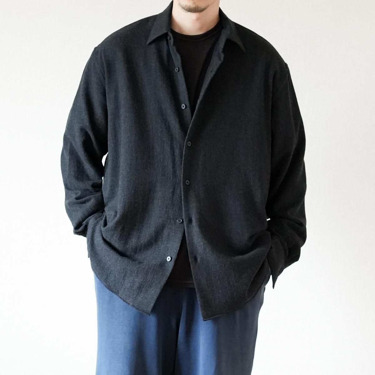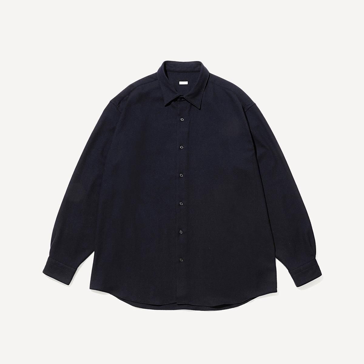 フレンチフロントのレギュラーカラーシャツ。ゆったりとしたオーバーサイズシルエットで、身頃のボリュームに対してやや小ぶりな襟のバランスが特徴。生地は、カシミアに匹敵する繊維の細さのsuper180'sメリノ梳毛糸を使用して織り上げたライトフランネル。軽めの縮絨で原料の柔らかさを最大限に活かしたシャツウエイトの上質素材です。原料のもつ自然な光沢と、一切痒みの無い滑らかな肌当たりが特徴。