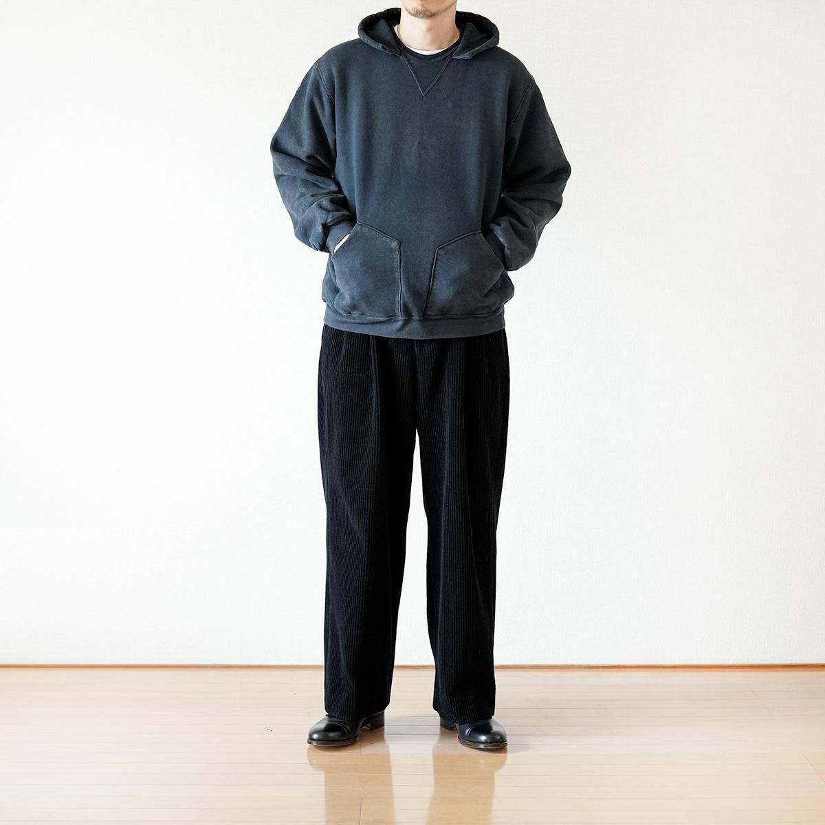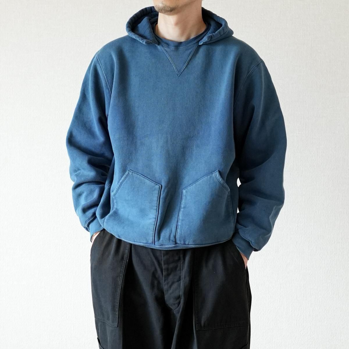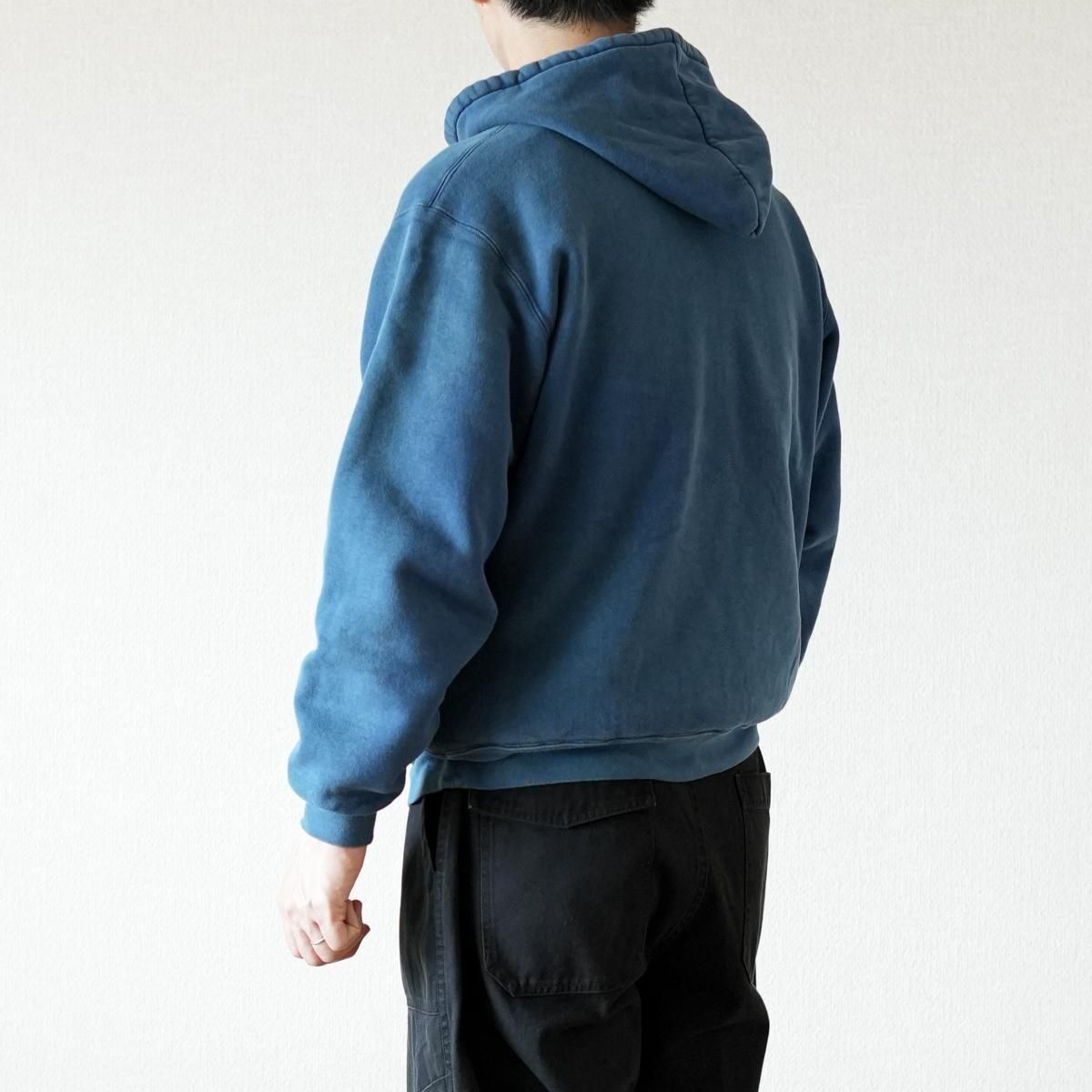 クロップド後付けフーディ。ヴィンテージの薄く伸びきって緩くなったリブや、ポケットやVガゼットの歪み、被れない小さなフードをあえて再現し、崩れたシルエットに設計しています。表地はヴィンテージを解析して作った吊り裏毛を使用。1時間に1メートルという、ゆっくりとしたス ピードでしか編み立てられないが、糸に余計な負荷を掛けないで編み上げることで、肉厚ながら固くならず、ふっくらとした風合いで仕上がっています。裏サーマルもヴィンテージを解析し作成。ヴィンテージを踏襲し職人による手作業で色むらやダメージの経年変化を表現しています。※職人による手作業での加工なので1点、1点、加工感は異なります。擦れ、小傷などの個体差もデ ザインの一部としてご了承ください。※ヴィンテージ感を追求することで、色によっては耐光堅牢度が悪く、変色の恐れがありますがご了承ください。