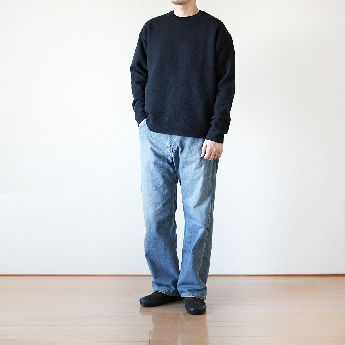 少し色の浅いピュアインディゴでロープ染色した米綿のナチュラルなムラ糸を使用して織り上げた9.5ozデニム。ヨコ糸をグレーで打ち込みインディゴブルーの色味に深みを持たせています。毛焼きをあえて省いた生機のような表情が特徴です。