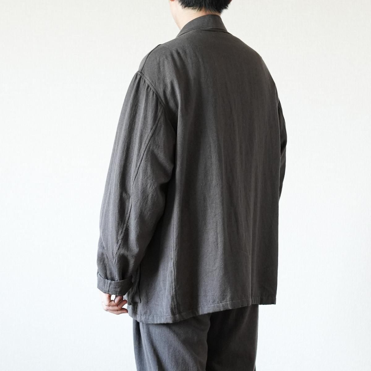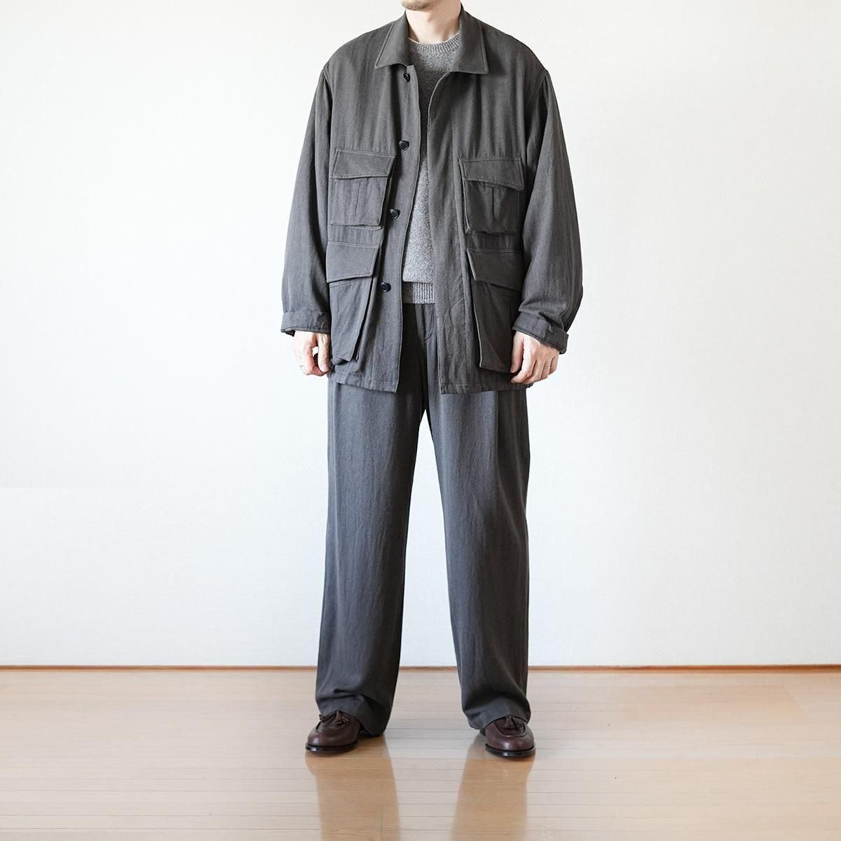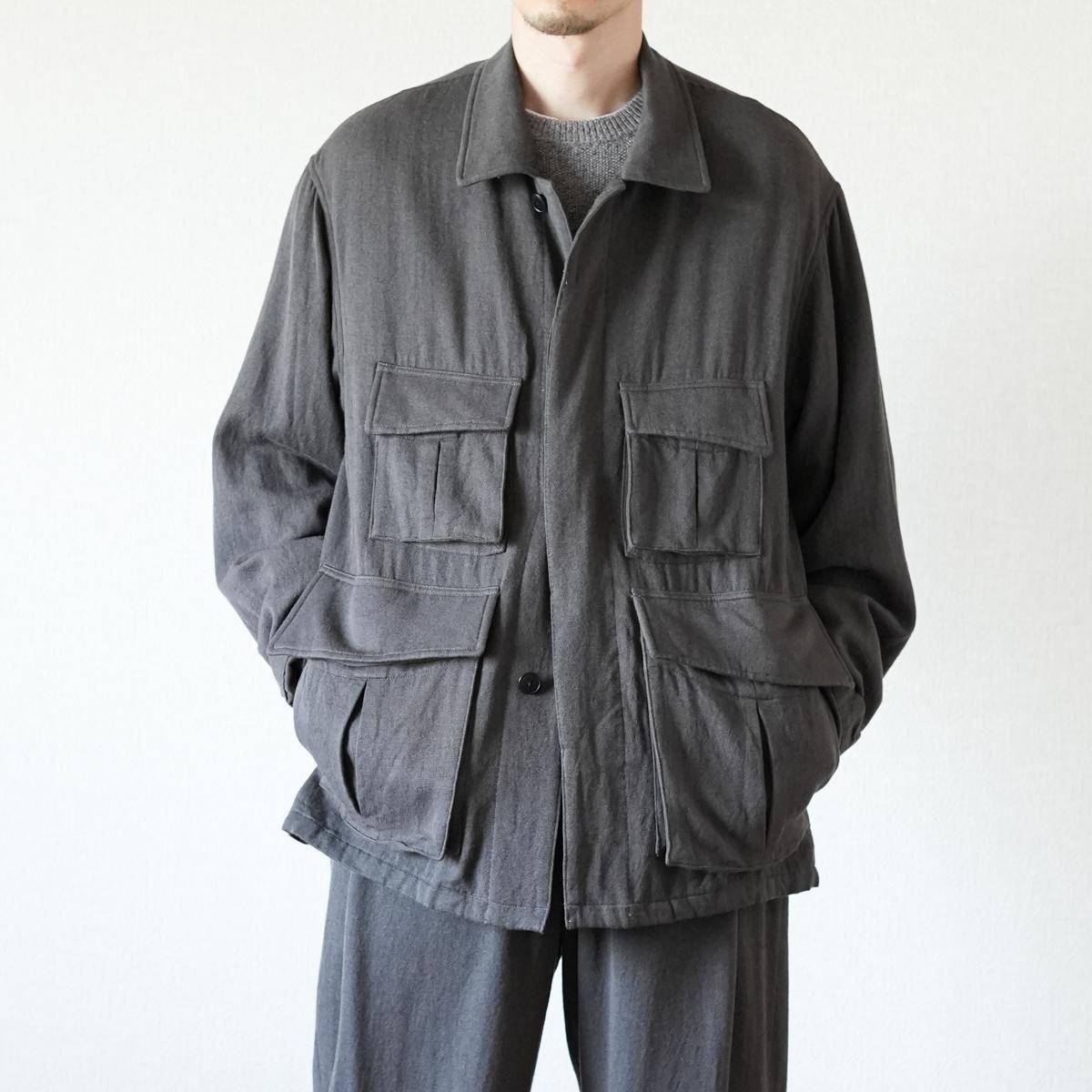 粗野でクラシックなムードとソフトな印象の共存を目指し、いくつかのミリタリーやハンティングの要素をバランス良くを崩しながら仕上げたジャケット。身幅やアームホー ムにゆとりを持たせた一重仕立て、製品洗いによる抜け感が特徴です。上質でソフトな素材感と相まった心地良い着用感を感じられる1枚です。