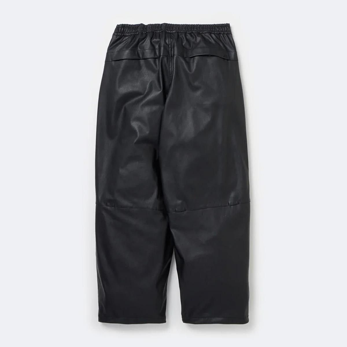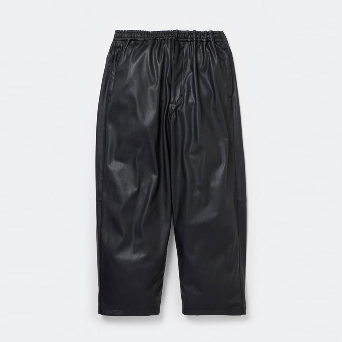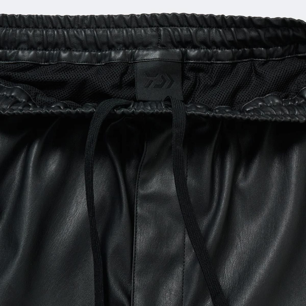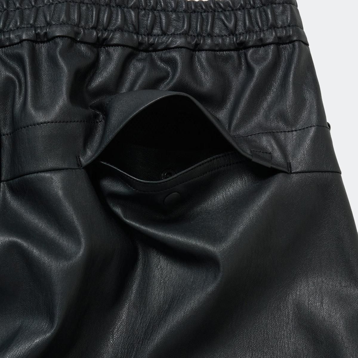 どこか懐かしいウィンドブレーカーパンツをシンセティックレザーにてアレンジした意欲作。 ウィンドブレーカージャケットとセットアップで着用できるトラックパンツです。サイドポケット、裾に調整用のジッパーを配し、着脱が容易にできる仕様となっております。バックはベンチレーション機能を持つバックポケットをデザイン。メッシュライニング仕様のため、ドライな着用感もポイントです。