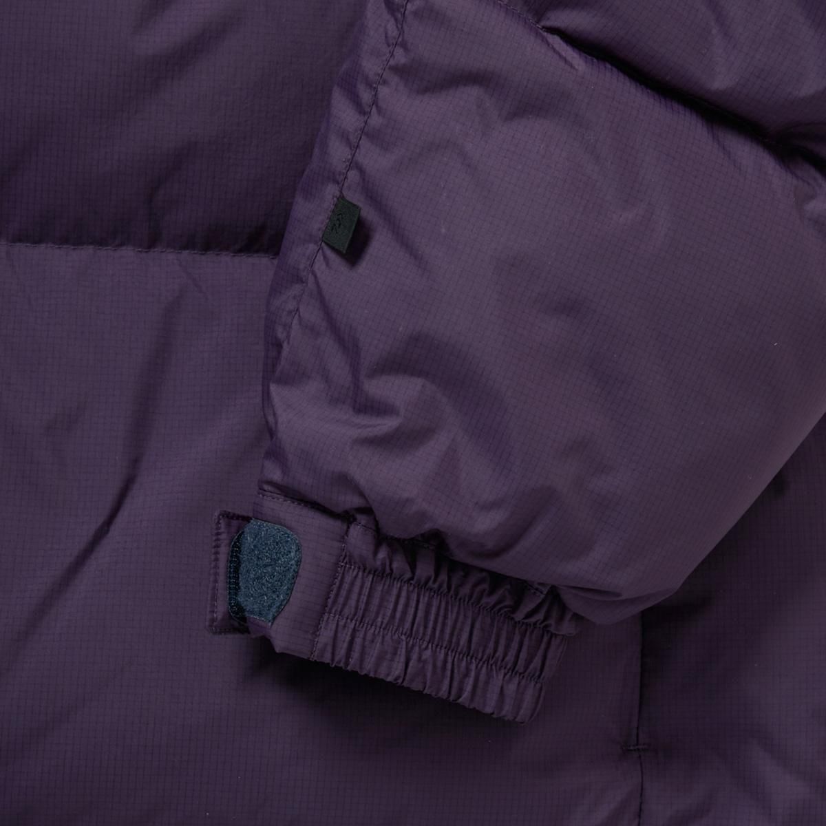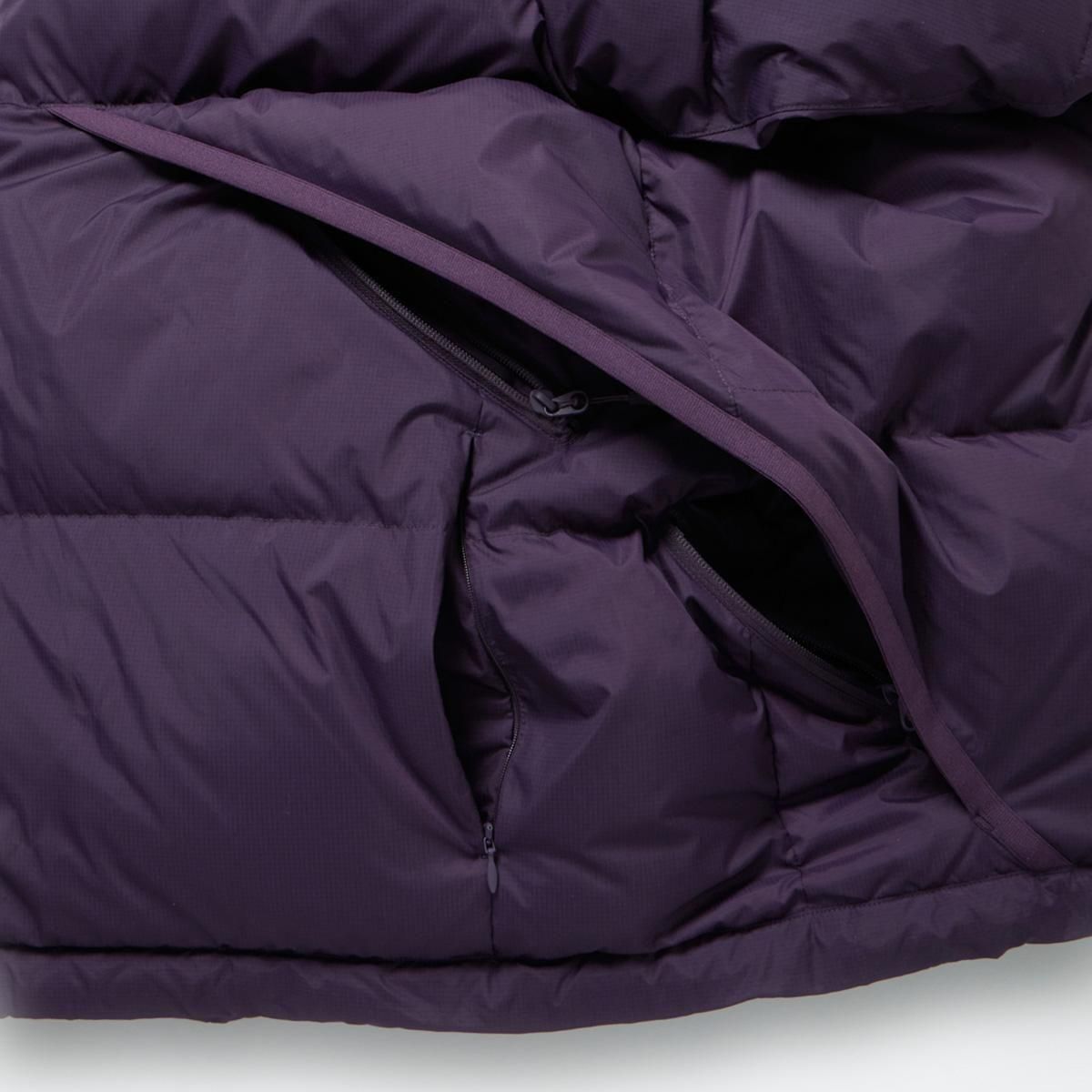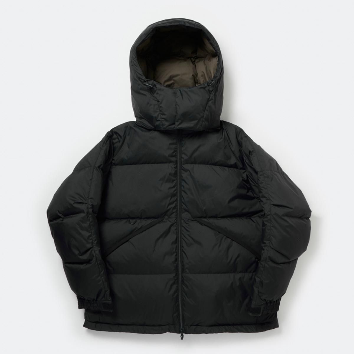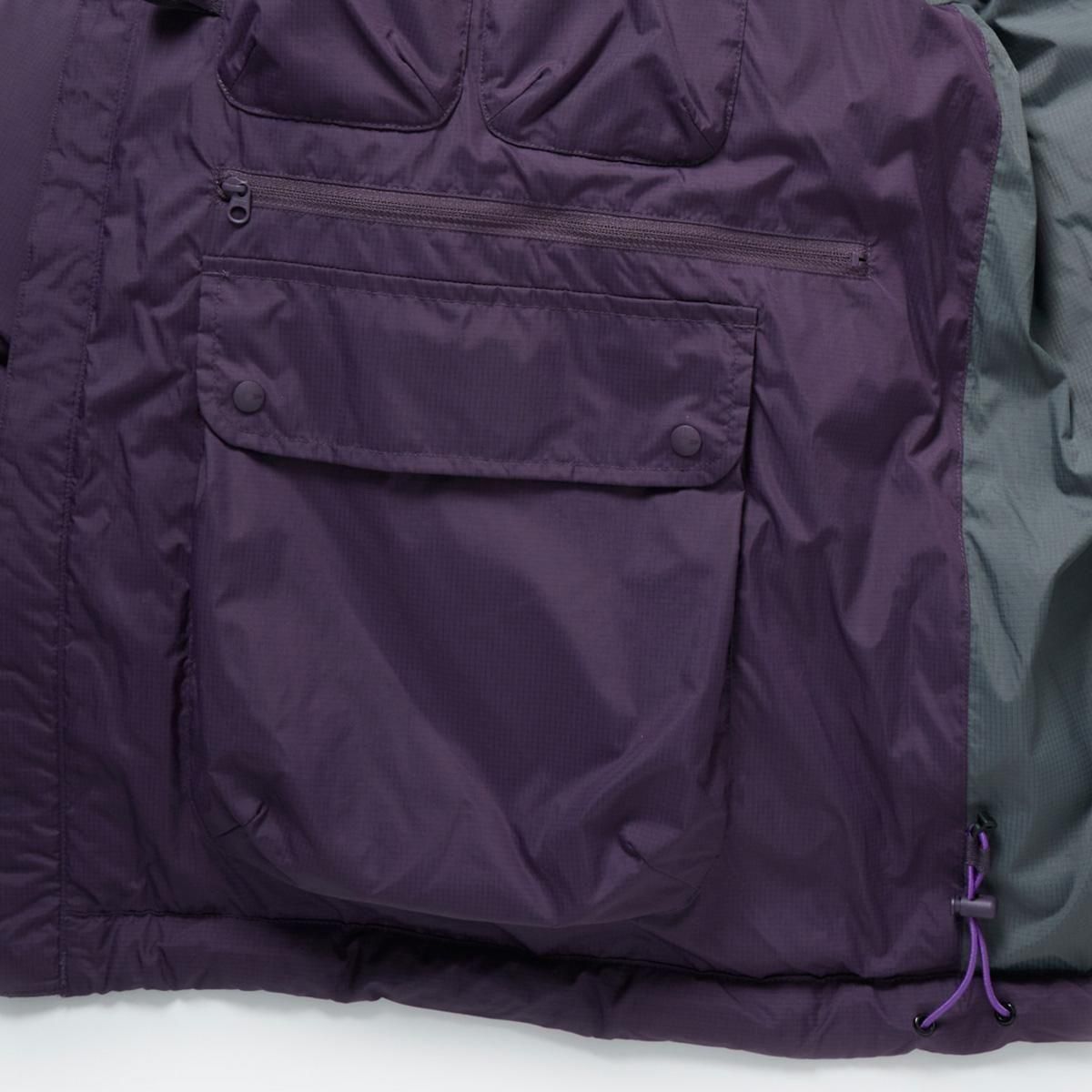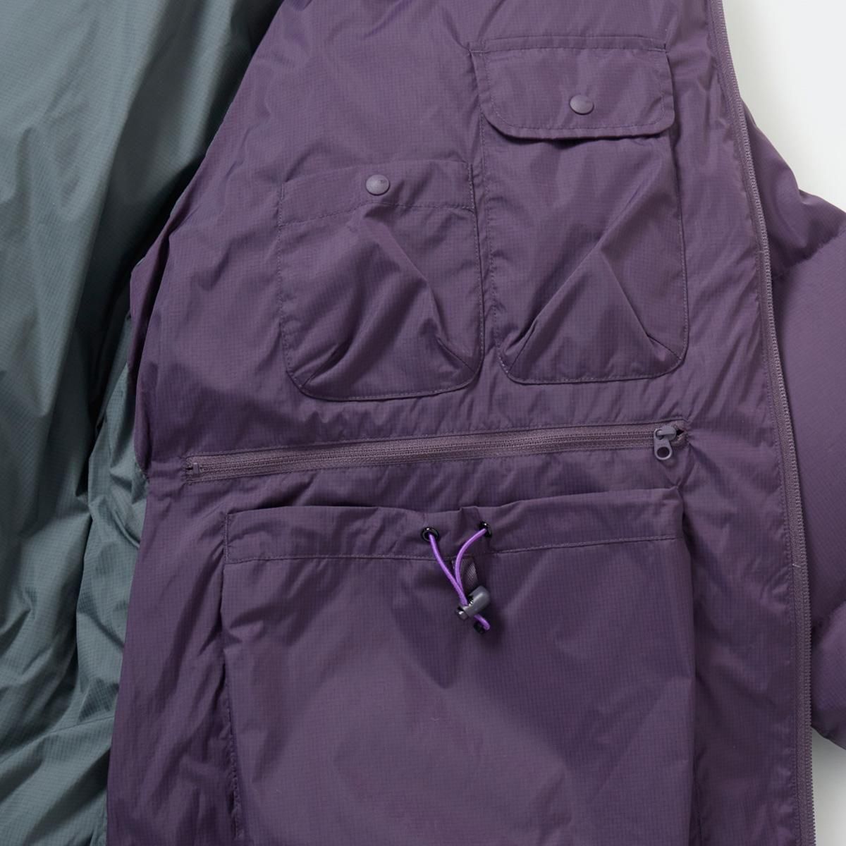 寝袋のような膨らみが特徴のダウンジャケット。シンプルに横ステッチで表現されたベーシックなデザインですが、ハンティングジャケットからインスピレーションを受けたフロントからサイドにわたる大きなフラップポケットが最大の特徴。中には仕切られた2つのポケットが配されます。また内側に大小様々なポケットワークを施し、タックルケース、ルアーケース、モバイルなどが収納可能。見た目以上に収納力の高いダウンドジャケットです。ミリタリーのディテールでもある前振りの袖がデザインアクセント、アクションプリーツを加え、袖口も調整出来るます。釣りの際の可動域を広げ、袖口のもたつきも解消したデザイン。取り外し可能なフードも加えております。