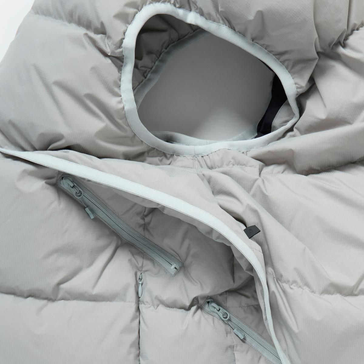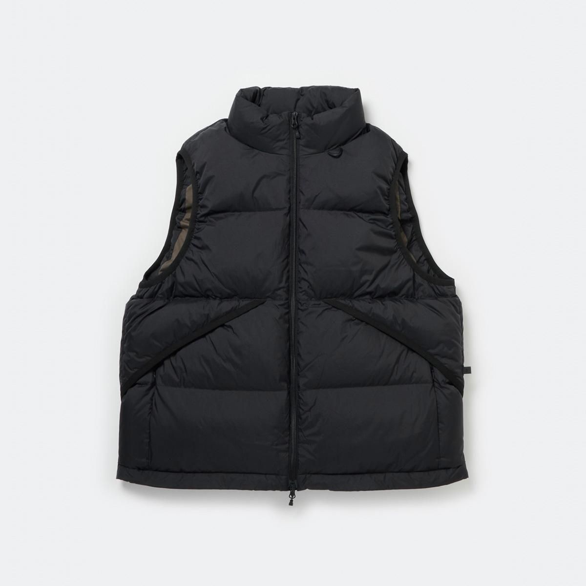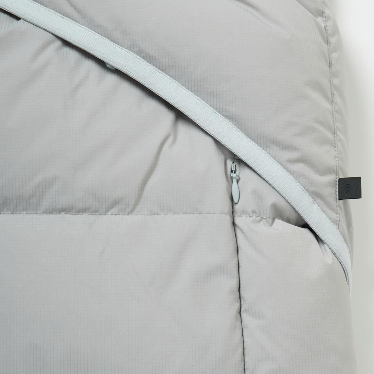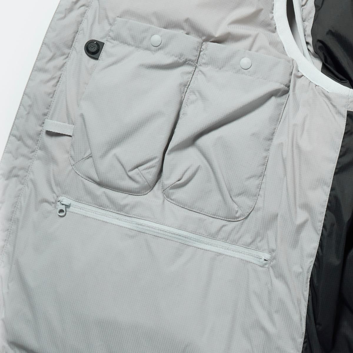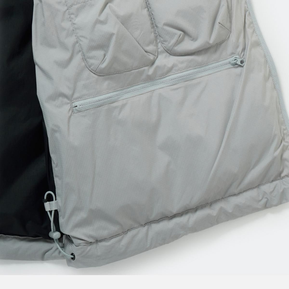 寝袋のような膨らみが特徴のダウンベスト。シンプルに横ステッチで表現されたベーシックなデザインですが、ハンティングジャケットからインスピレーションを受けたフロントからサイドにわたる大きなフラップポケットが最大の特徴。中には仕切られた2つのポケットが配されます。また内側に大小様々なポケットワークを施し、タックルケース、ルアーケース、モバイルなどが収納可能。見た目以上に収納力の高いダウンドベストです。
