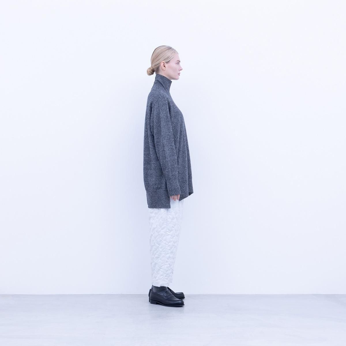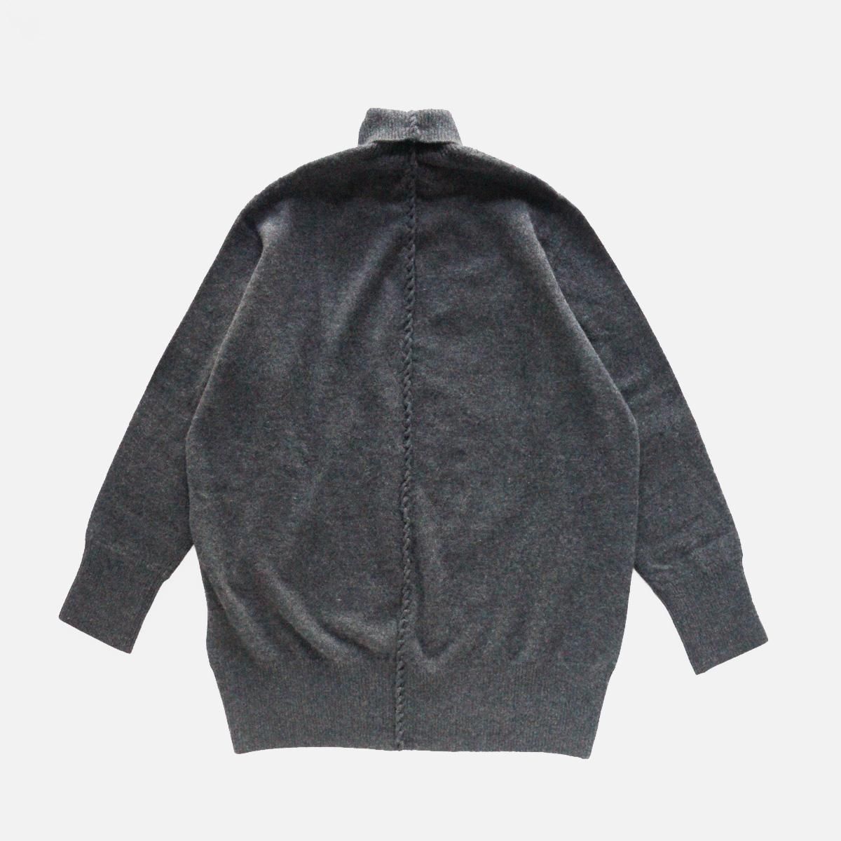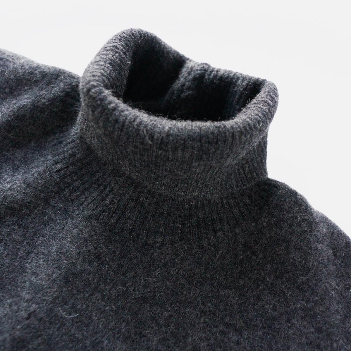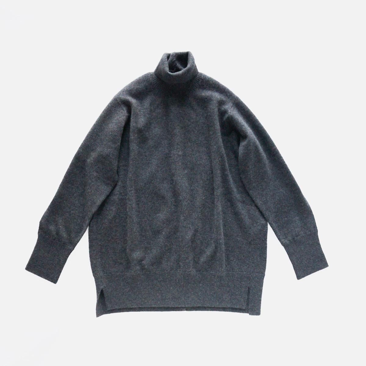 カシミヤ100%の26/2の糸を12ゲージの編機で編んだ横編みタートルネックニット。ホワイトカシミヤはカシミヤの中でも繊維長が長く細い素材です。かなり軽量で非常に軽い着心地。着用していくほどにカシミア同士が絡み合い、良い風合いへと進化していきます。肩ジャストサイズデザイン。