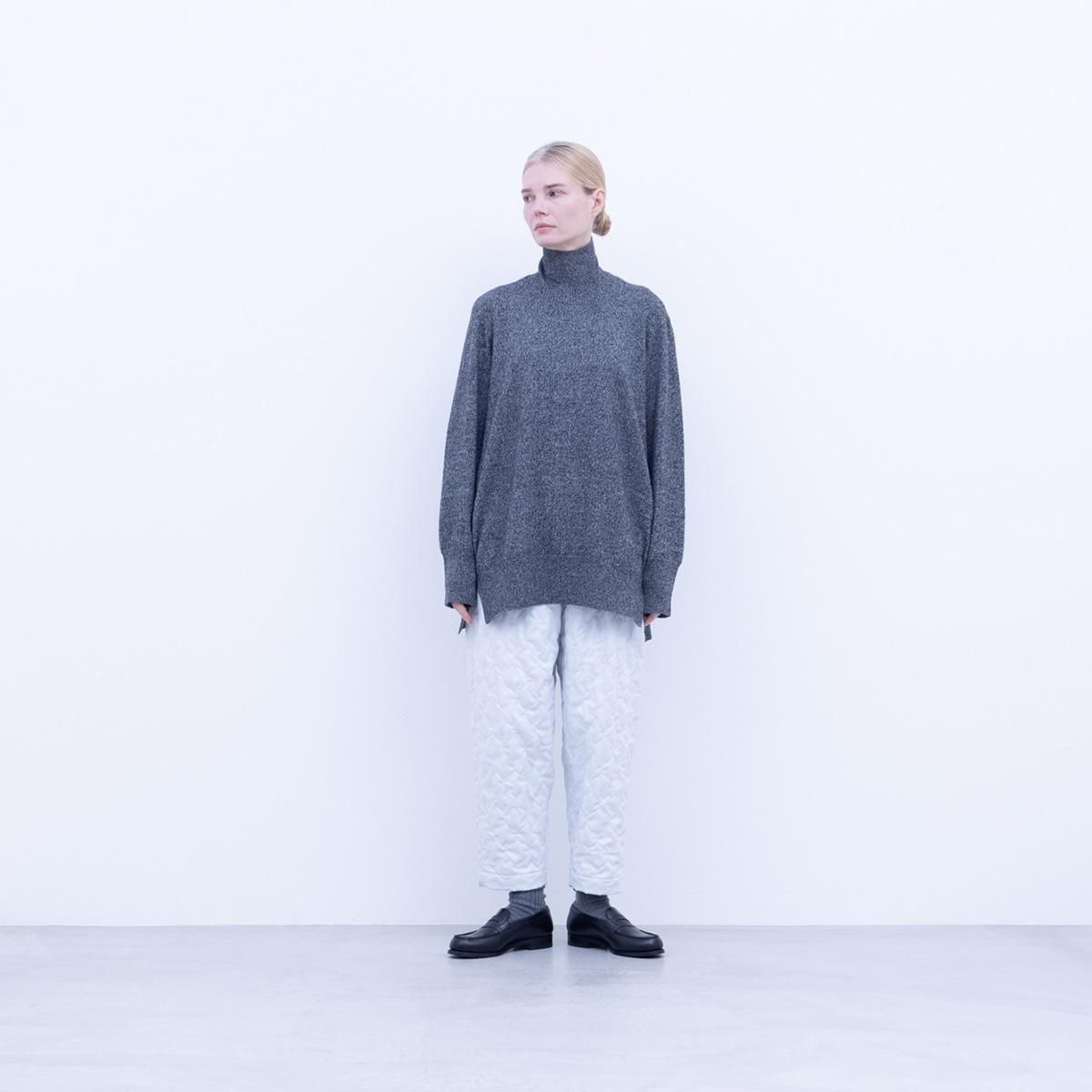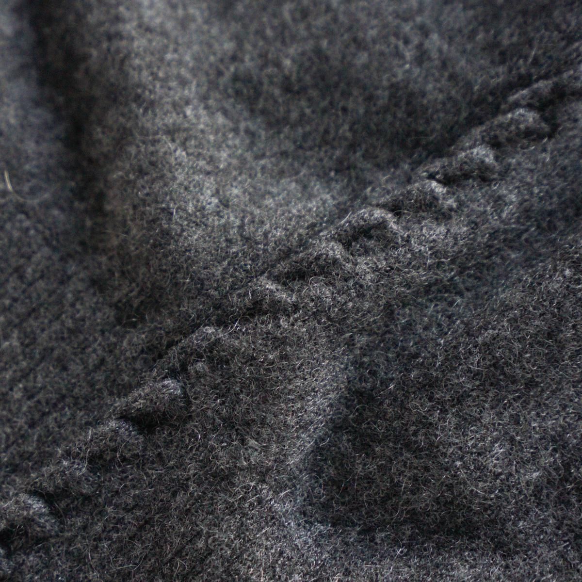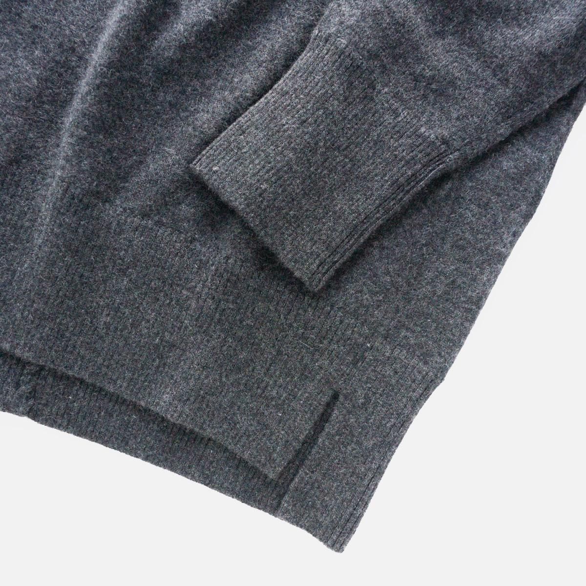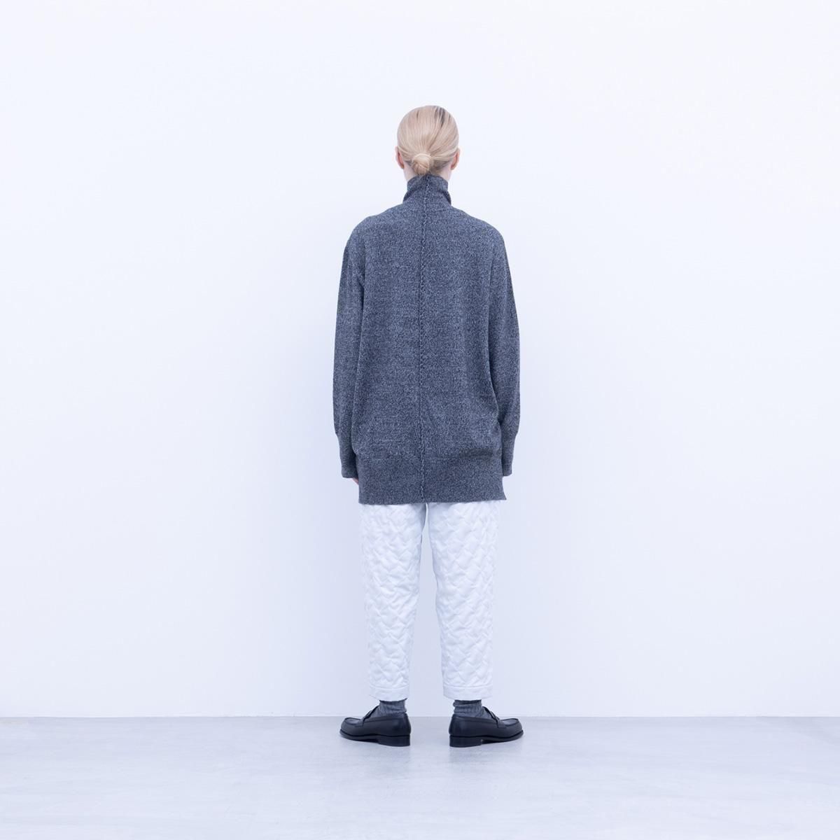 カシミヤ100%の26/2の糸を12ゲージの編機で編んだ横編みタートルネックニット。ホワイトカシミヤはカシミヤの中でも繊維長が長く細い素材です。かなり軽量で非常に軽い着心地。着用していくほどにカシミア同士が絡み合い、良い風合いへと進化していきます。肩ジャストサイズデザイン。