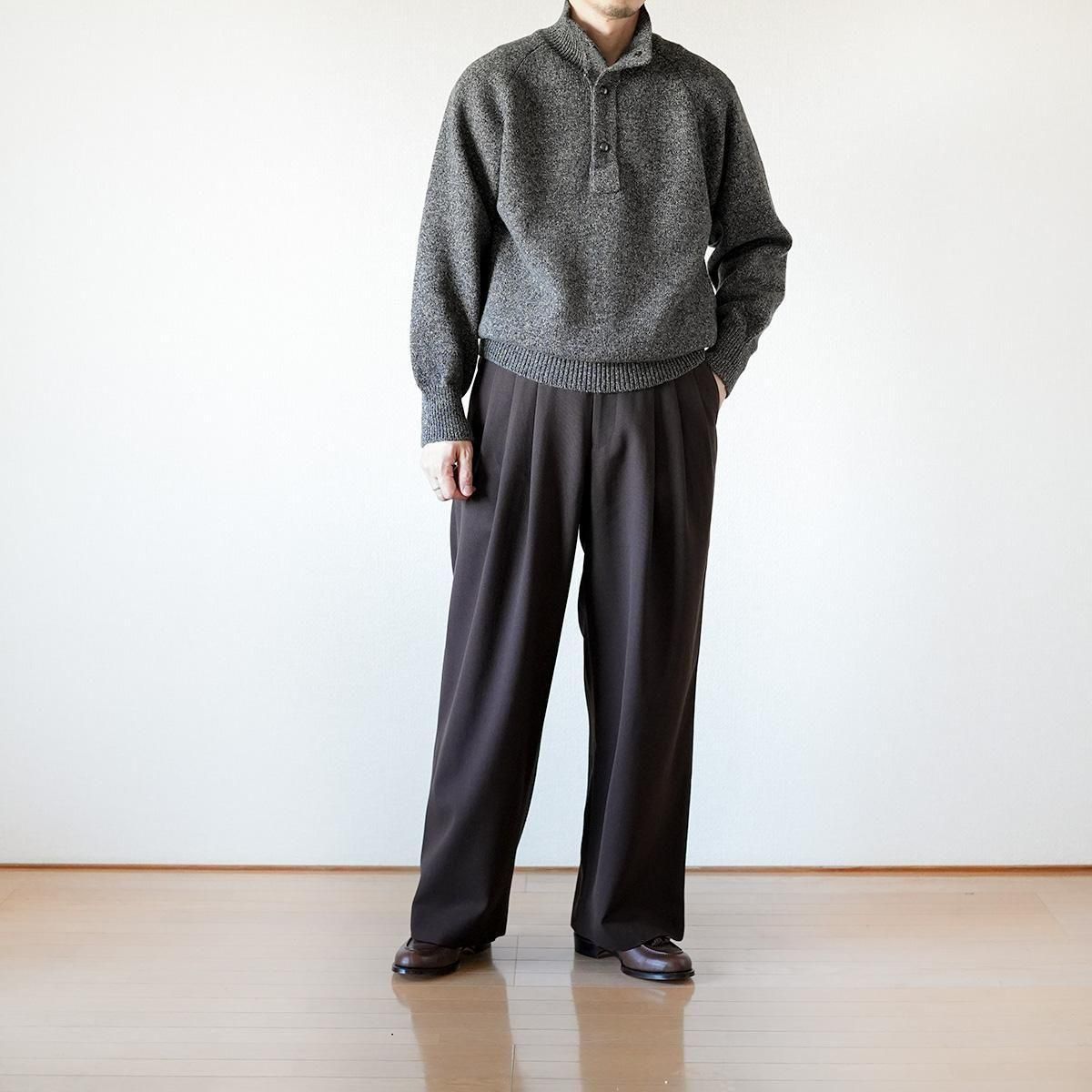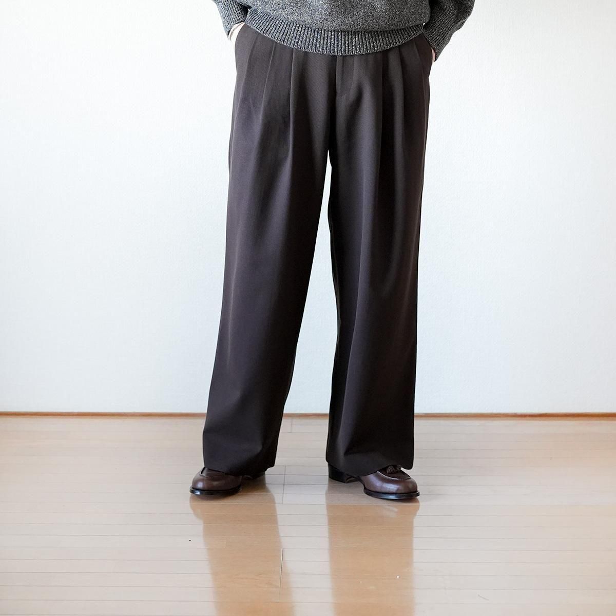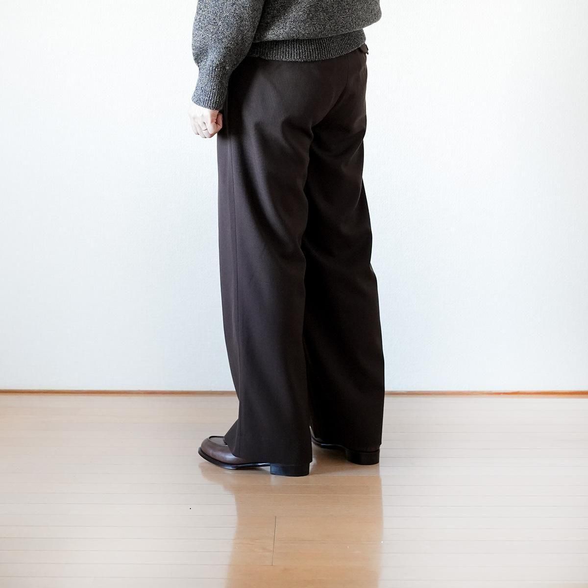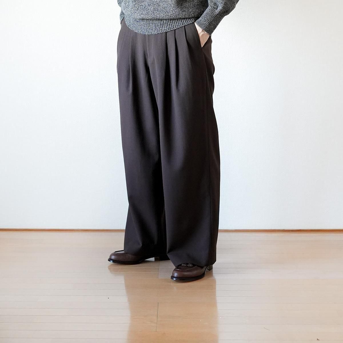 迫力のあるシルエットと快適な穿き心地を両立した、「Triple Pleated Wide Trousers」。ブランド最大のワイドシルエットを持ち、ウエストに施した3本のプリーツが腰まわりに自然なゆとりを生み出します。裾に向かってストレートに落ちるラインが、力強く美しいシルエットを形成。さらに、後ろウエストに配したゴムが動きやすさをサポートし、日常使いにも適した一本です。