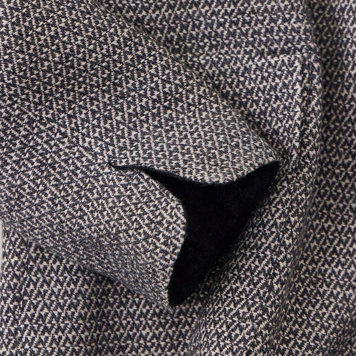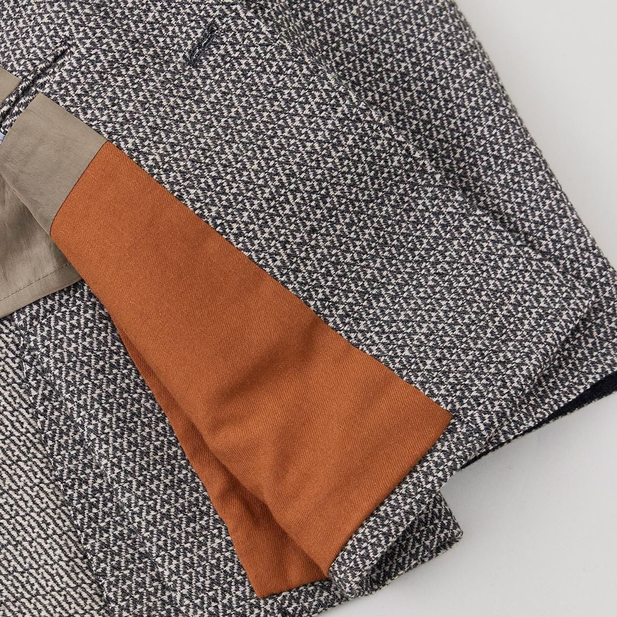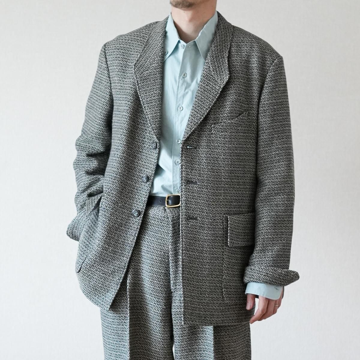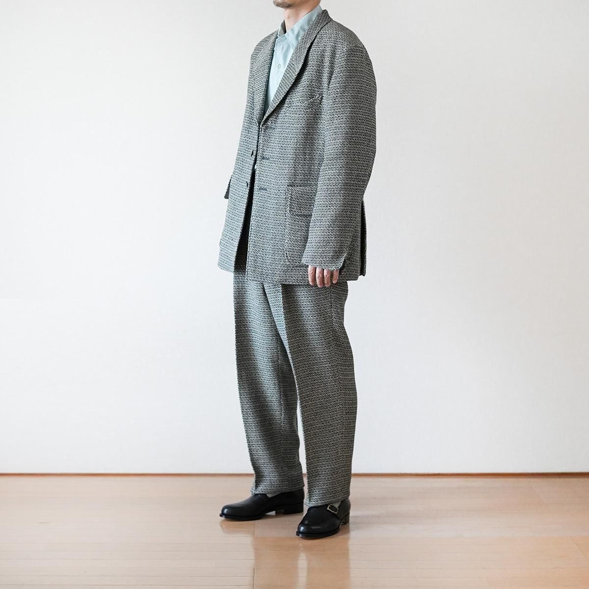 コットンとリネンの杢糸にメリノ混シェットランド糸で製織したビスポークのツイードを使用したハンティングテバジャケット。従来のヘリンボーン柄と違いドビー織機 で「N」を表現しています。目指したのは1990年代のハリウッドスターが着用してい たレザージャケット。当時のヨーロッパを源流とするクラシックなアイテムをアメリカ流にアレンジしたアプローチを参考にしました。イギリスとスペインのスタイルにアメリカのムードを融合させ、エレガントさとエフォートレスなムードを演出しています。生地は仕上げに軽く縮絨を入れ、従来のヘリンボーン柄と違いドビー織機で「N」を表現。オールド感漂う素材感とクラシカルなハイウエスト設定のトラウザーが1990年代のムードを演出しています。