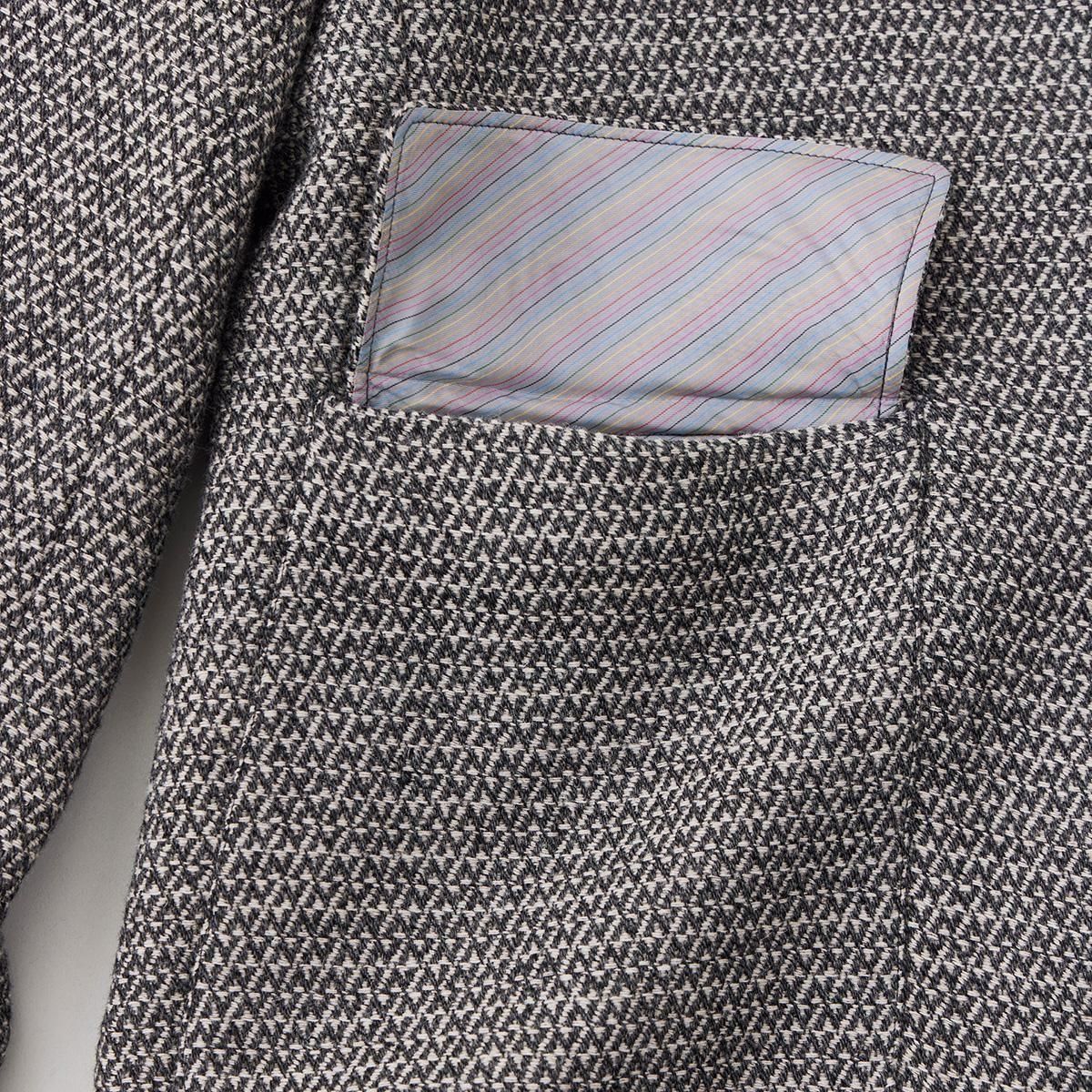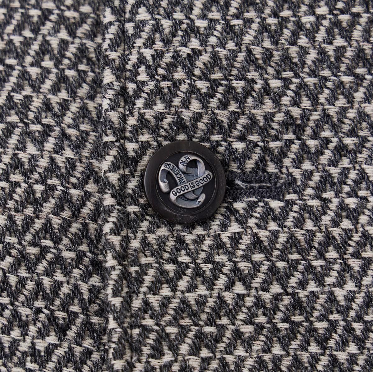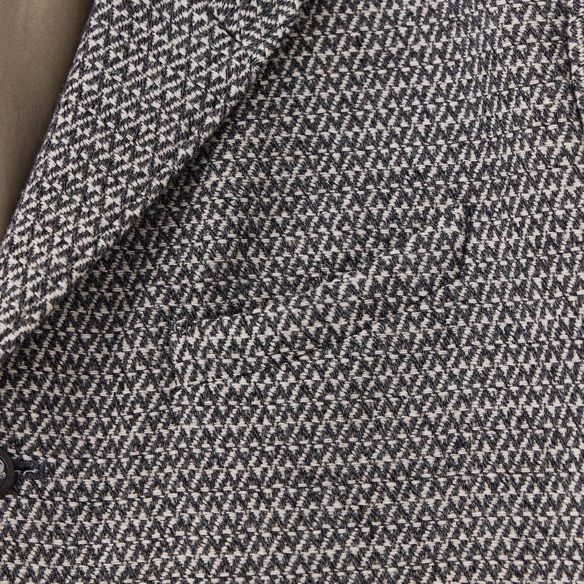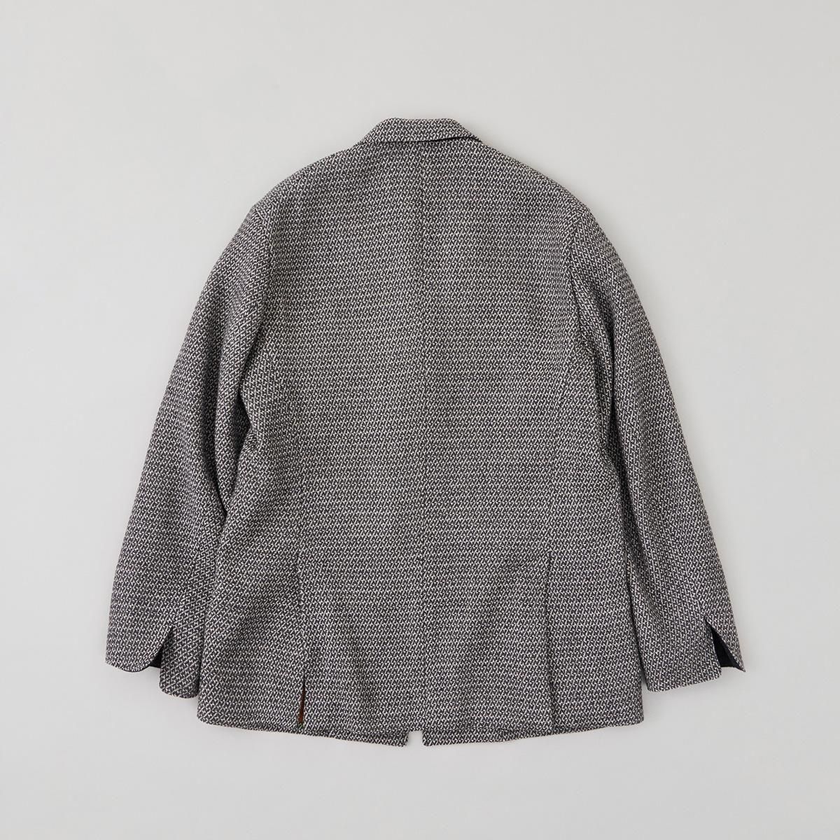 コットンとリネンの杢糸にメリノ混シェットランド糸で製織したビスポークのツイードを使用したハンティングテバジャケット。従来のヘリンボーン柄と違いドビー織機 で「N」を表現しています。目指したのは1990年代のハリウッドスターが着用してい たレザージャケット。当時のヨーロッパを源流とするクラシックなアイテムをアメリカ流にアレンジしたアプローチを参考にしました。イギリスとスペインのスタイルにアメリカのムードを融合させ、エレガントさとエフォートレスなムードを演出しています。生地は仕上げに軽く縮絨を入れ、従来のヘリンボーン柄と違いドビー織機で「N」を表現。オールド感漂う素材感とクラシカルなハイウエスト設定のトラウザーが1990年代のムードを演出しています。