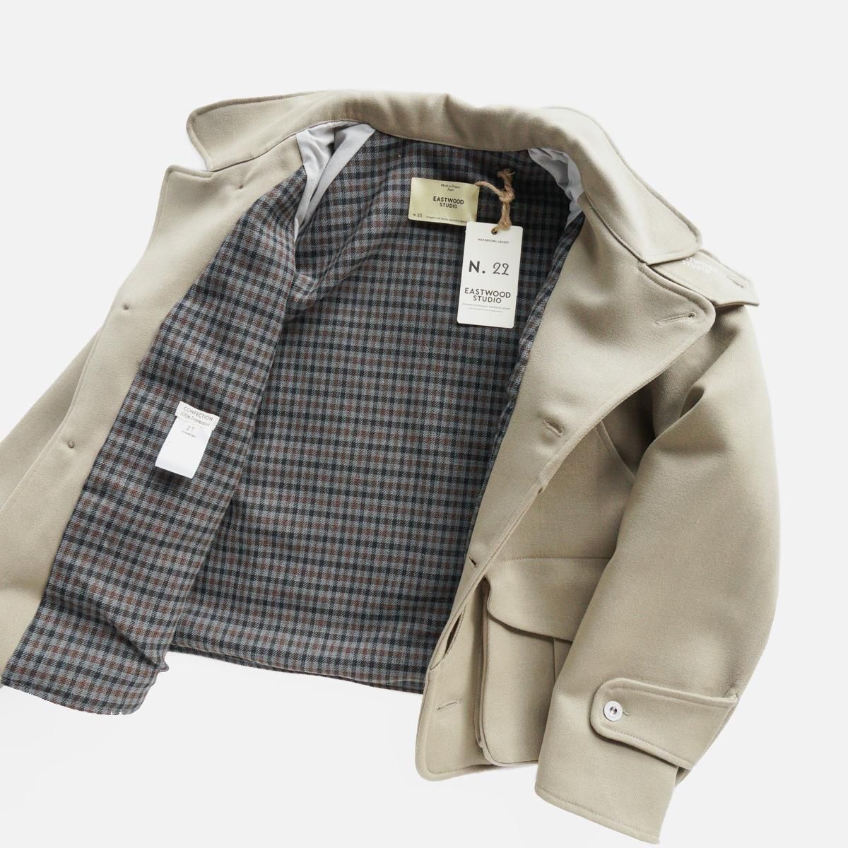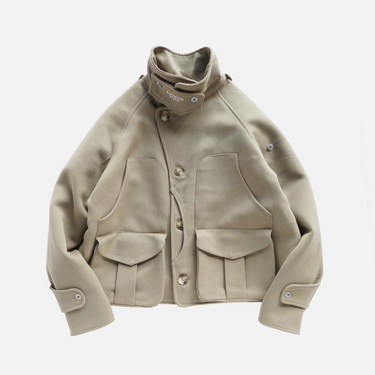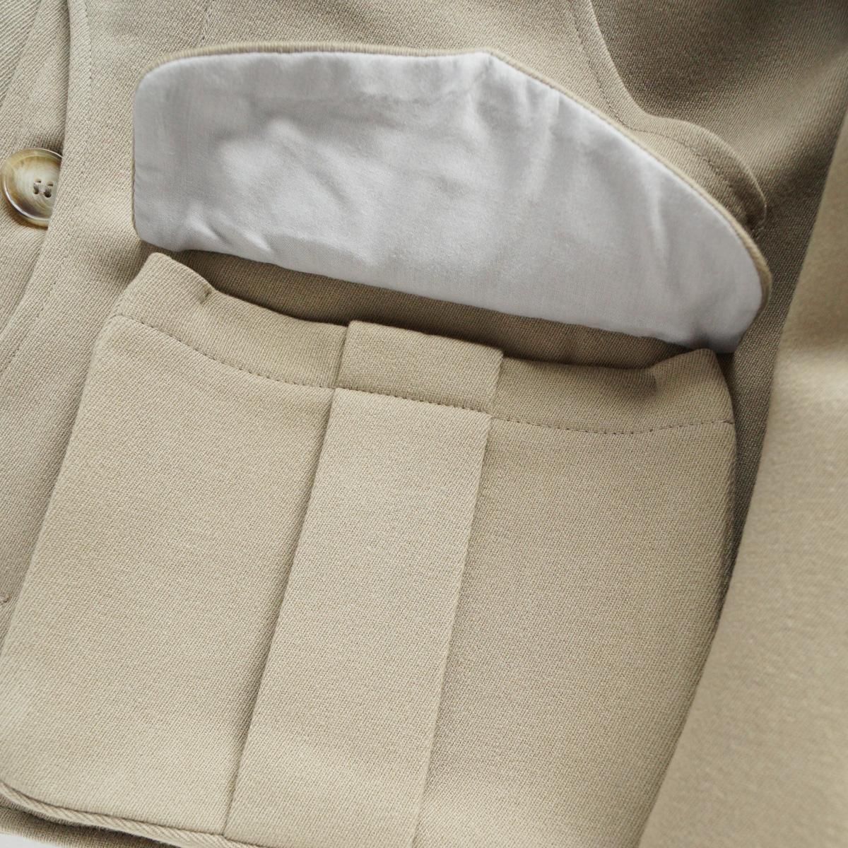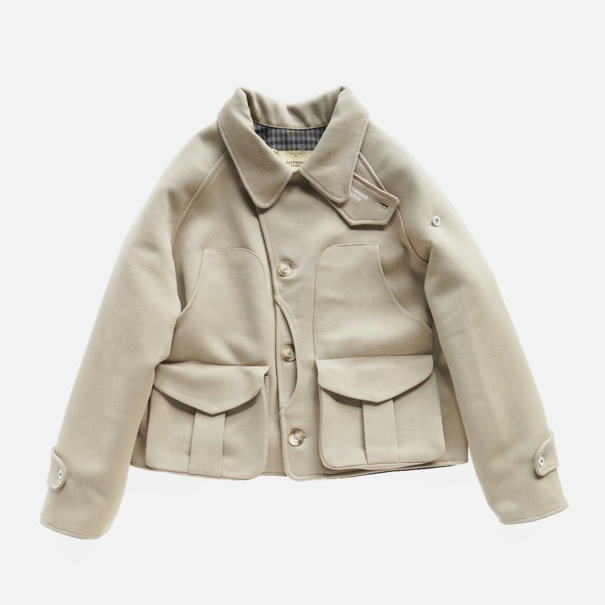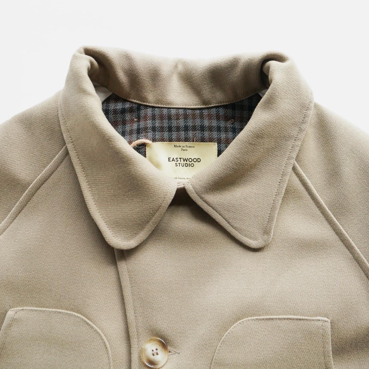 フランスはパリにあるブランド”EASTWOOD STUDIO”。フランスの卓越性と優雅さを体現したブランドです。伝統的な漁業や狩猟用の衣服の伝統から主なインスピレーションを得て作られた一作目の作品のジャケット。1950年代のヴィンテージのウィップコード ウールで作られています。ジャケットのショートカットは、1940 年代のフライフィッシングの衣服から、バックポケットは、狩猟の際に動物を運ぶために伝統的に使用されていたハンティングポケットからインスピレーションを得ています。この機能的な特徴は、日常生活に馴染むよう再考されています。ジャケットに使用されている金属ボタンは、1870年から1950年まで使用されていたオリジナルのフランス軍ボタン。衣服の歴史に関する広範な調査とアーカイブ化の成果といえる唯一無二の一着です。