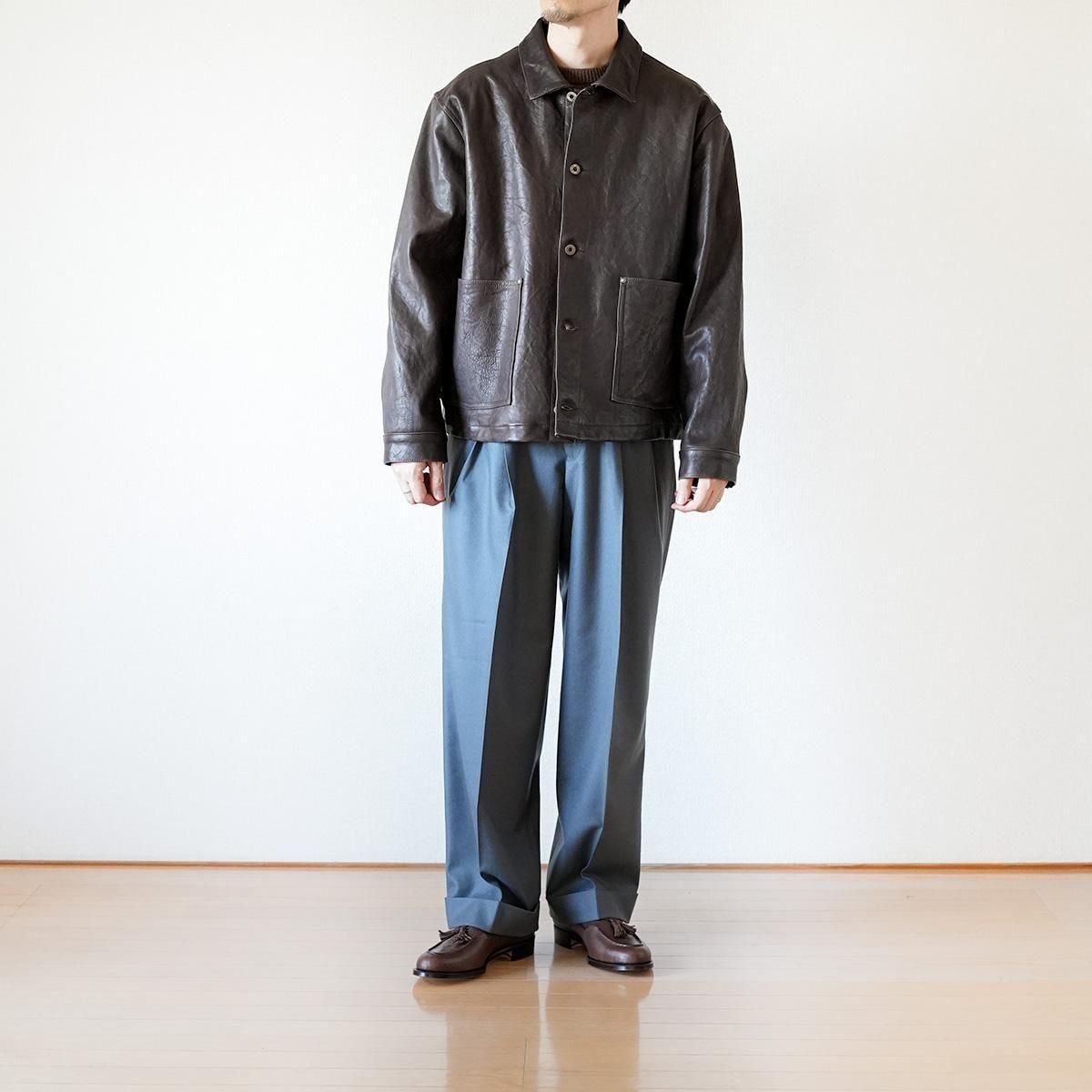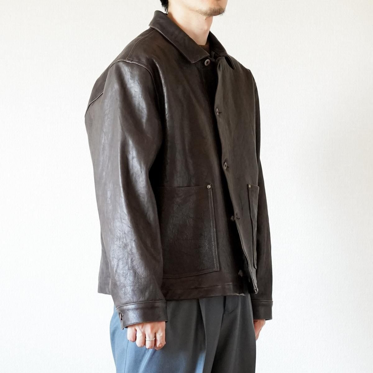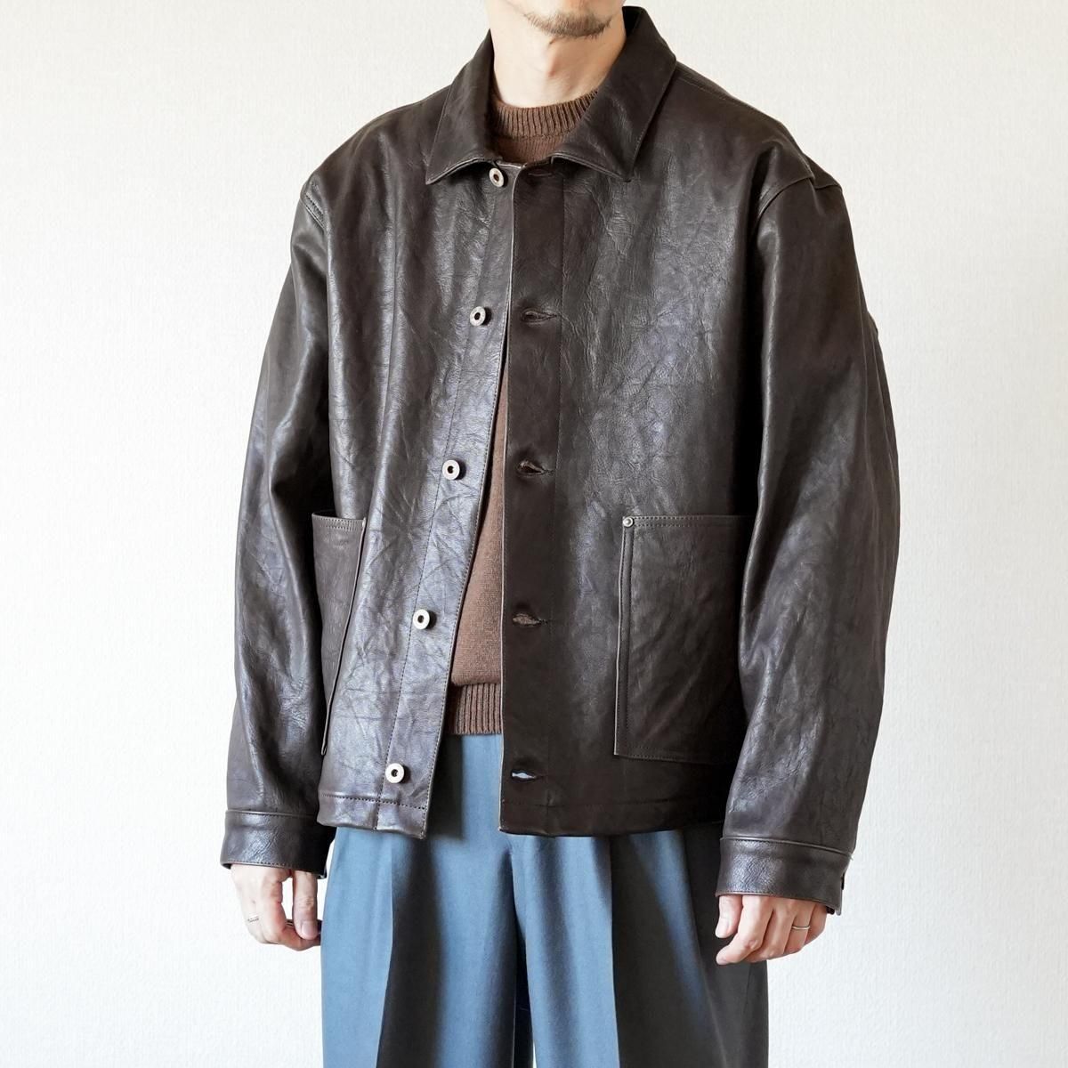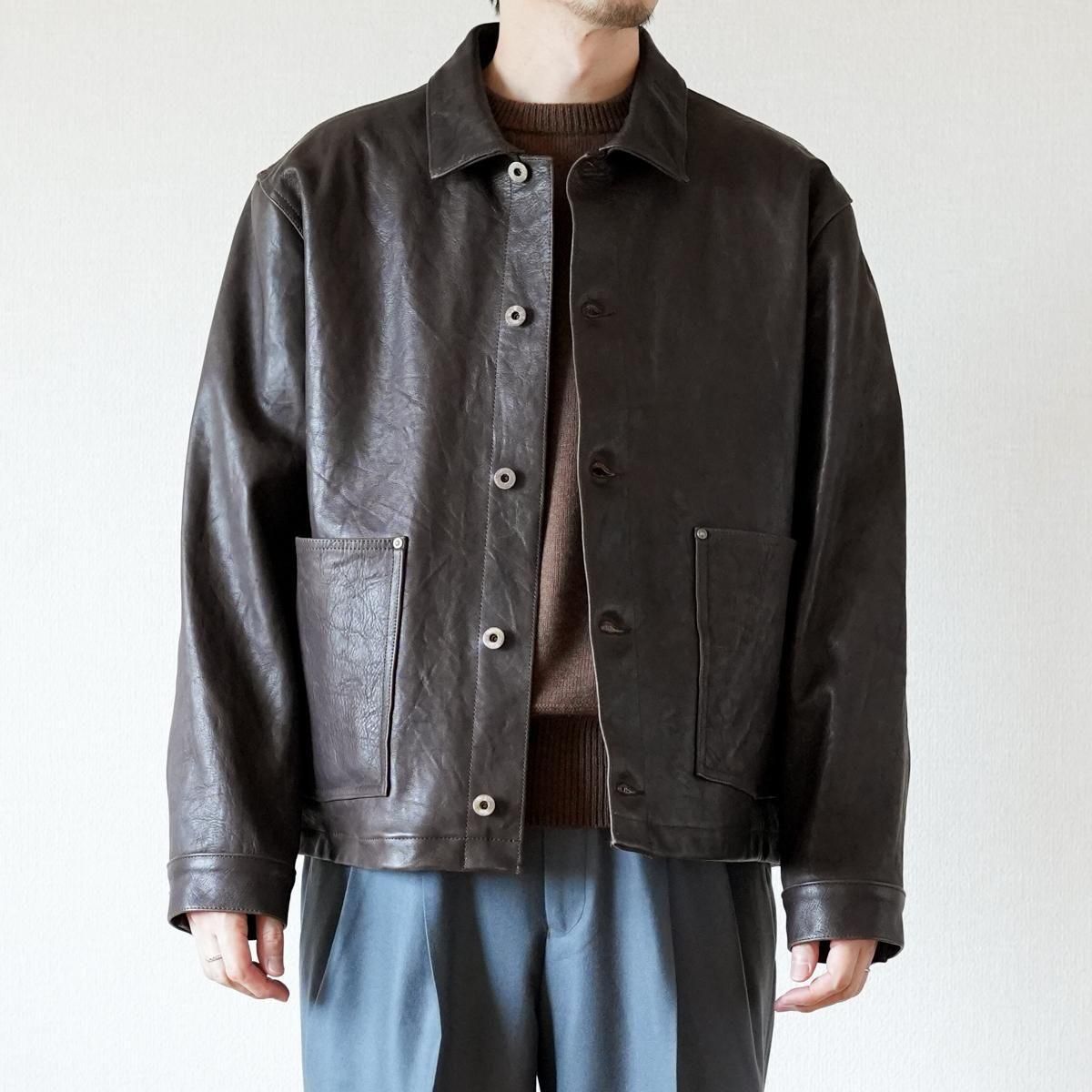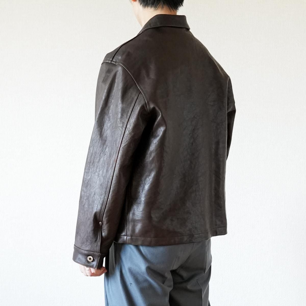 Lot.303 を馬革で作成したレザージャケット。AW25では、軽量な一枚仕立てから秋冬向けに裏地付き に仕様を変更している。裏地にはLot.116 Long-Point Collar Sports Shirtsに使用しているウール / リネン生地を使用。