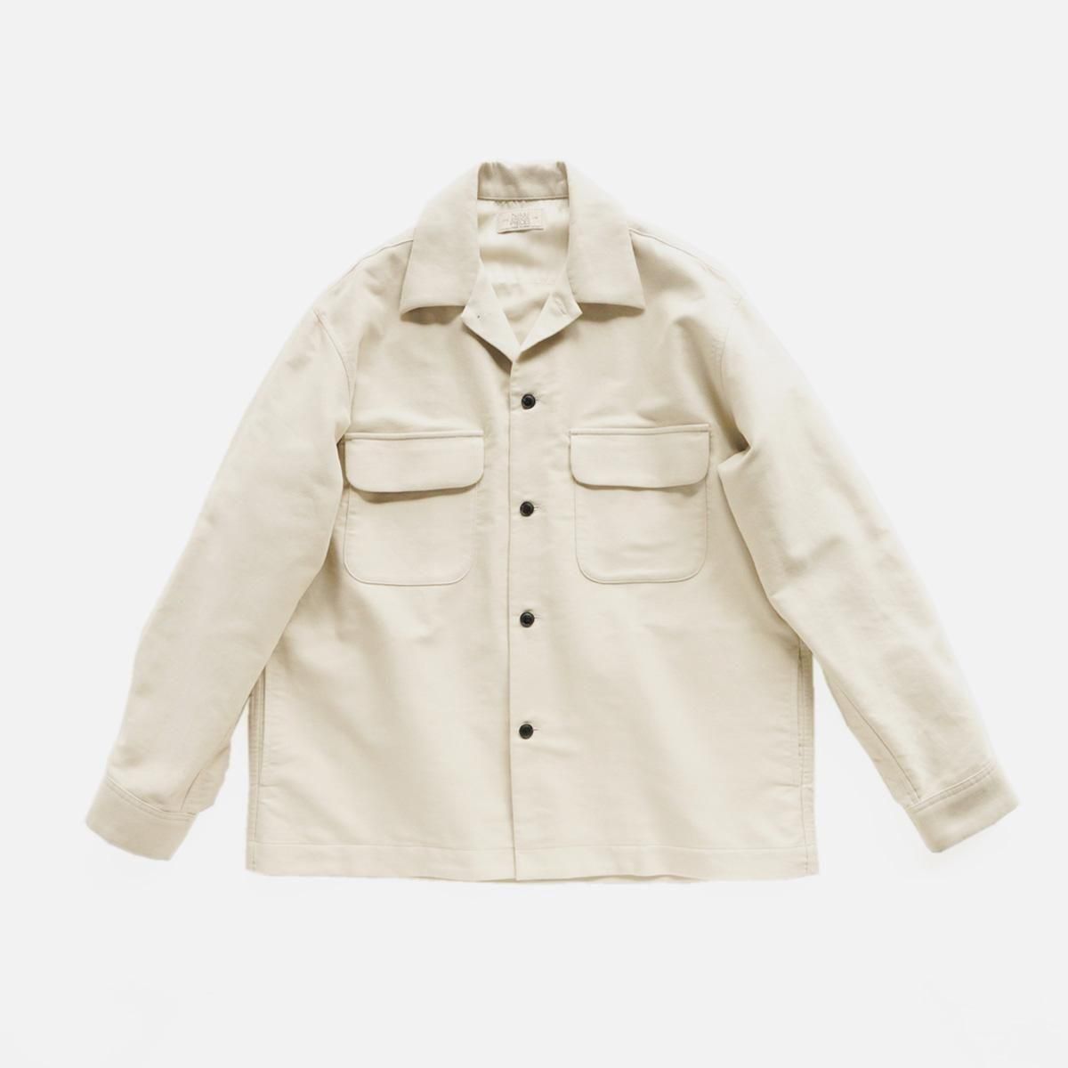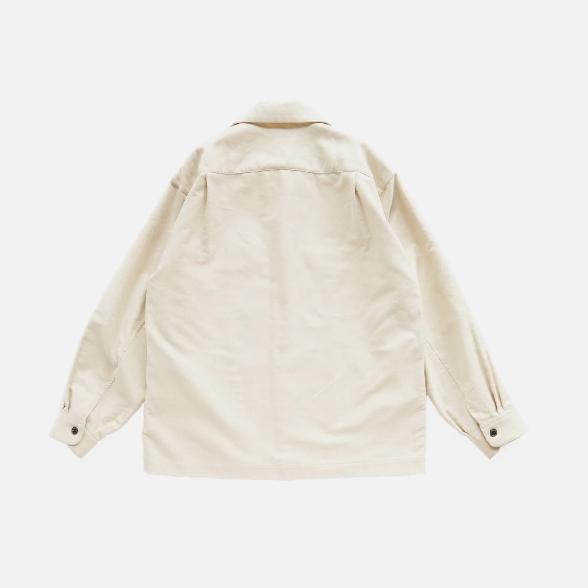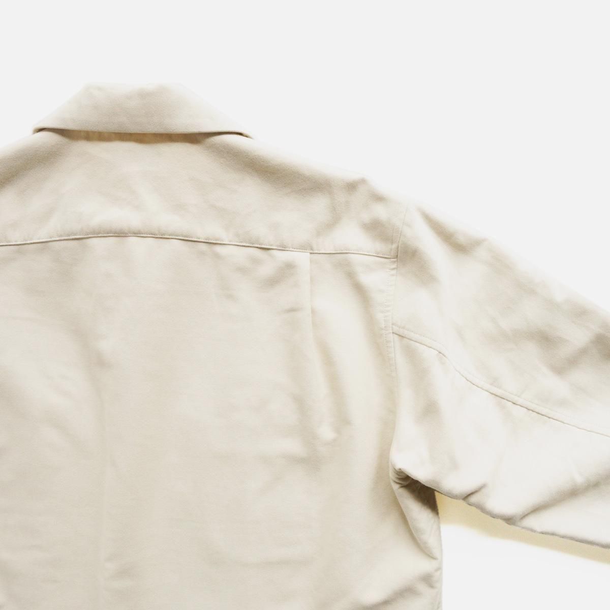 アメリカの50〜60年代の開襟シャツをベースに、ラフなパターンを2枚袖にして立体感を整えたシャツジャケット。素材は高密度過ぎないモールスキンをベースに、繊細な起毛スエード加工を施した生地を採用。コットン100%の程よい厚みの素材感なので、この季節の変わり目に活躍してくれること間違いなしです。一枚でも羽織としても、長くご着用いただけます。フラップ裏側などに、細コールの素材を採用し異素材のコントラストを取り入れ細部にまでこだわった一着。また背裏にキュプラ素材を使い、中にタートルやニットなどを着込んで羽織りとしても使いやすようにしています。