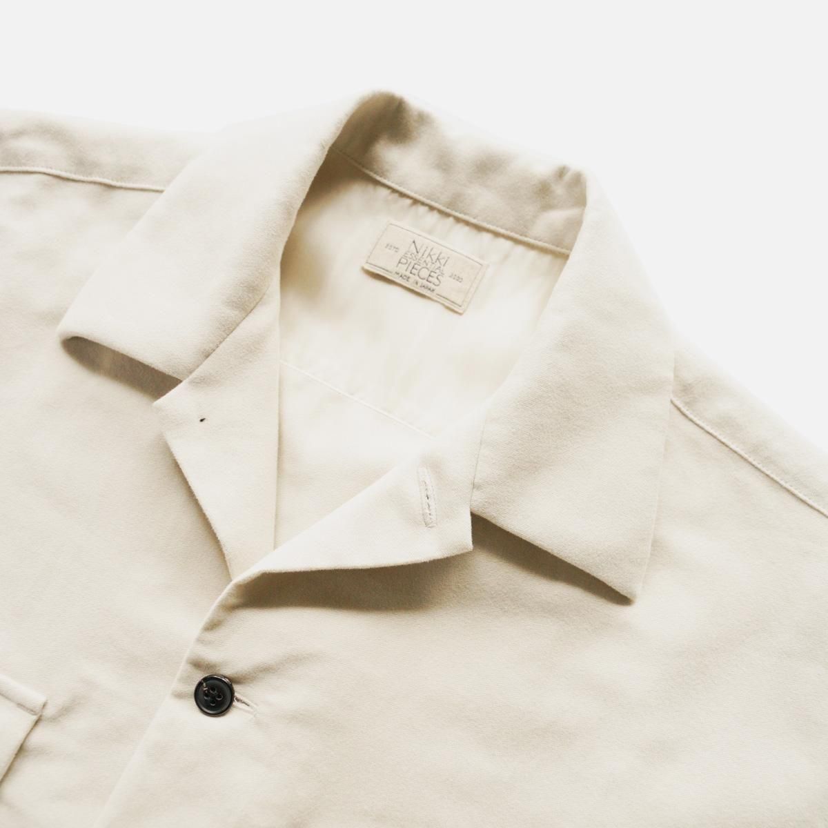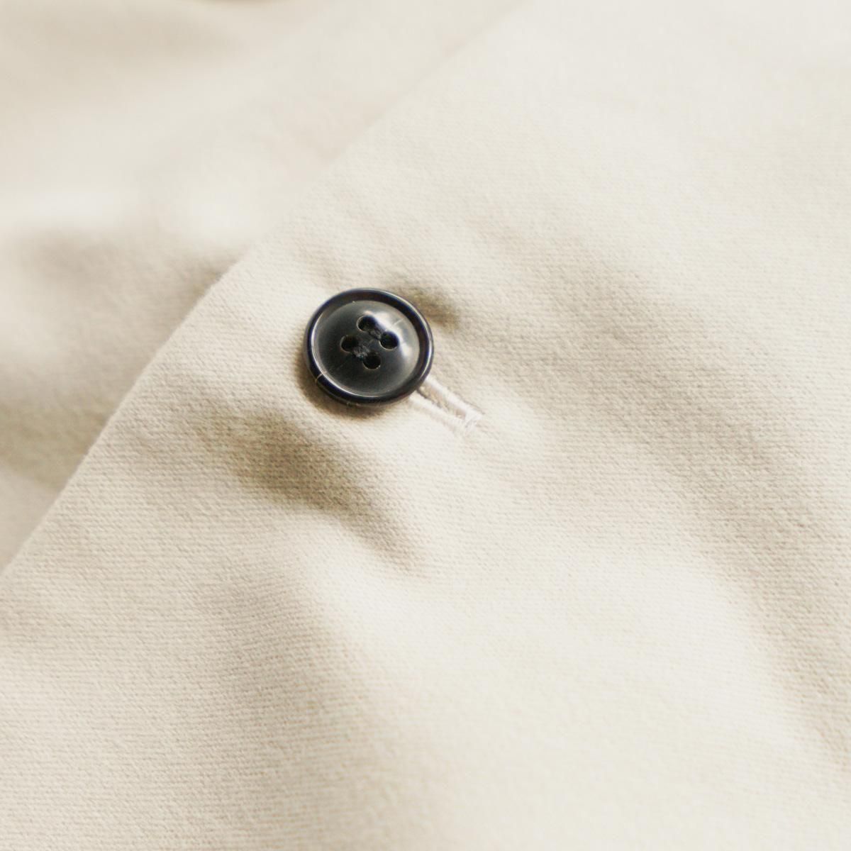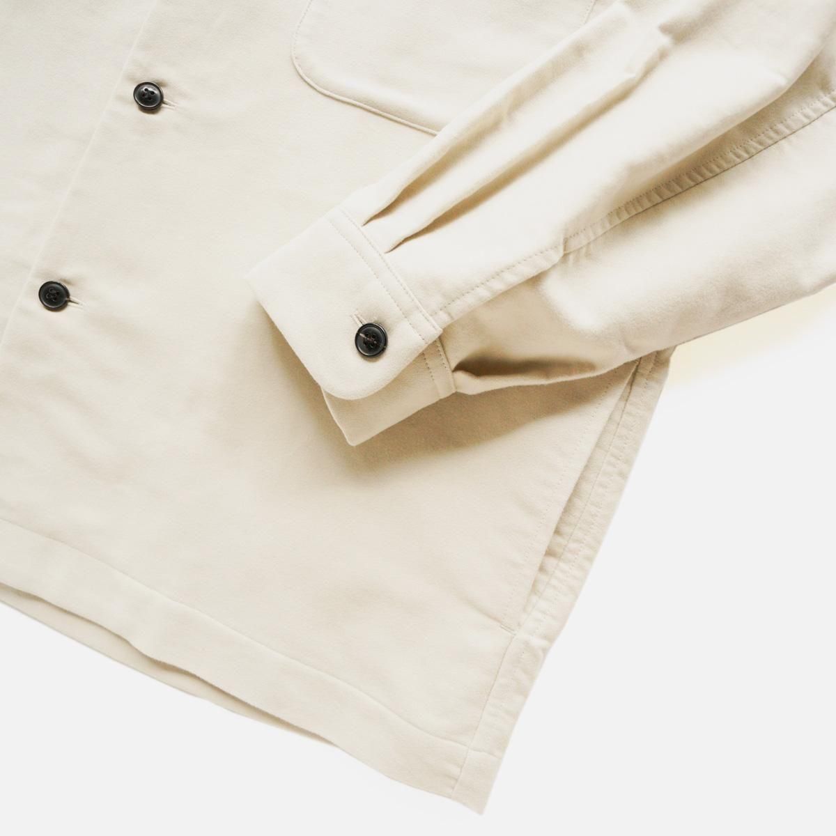 アメリカの50〜60年代の開襟シャツをベースに、ラフなパターンを2枚袖にして立体感を整えたシャツジャケット。素材は高密度過ぎないモールスキンをベースに、繊細な起毛スエード加工を施した生地を採用。コットン100%の程よい厚みの素材感なので、この季節の変わり目に活躍してくれること間違いなしです。一枚でも羽織としても、長くご着用いただけます。フラップ裏側などに、細コールの素材を採用し異素材のコントラストを取り入れ細部にまでこだわった一着。また背裏にキュプラ素材を使い、中にタートルやニットなどを着込んで羽織りとしても使いやすようにしています。