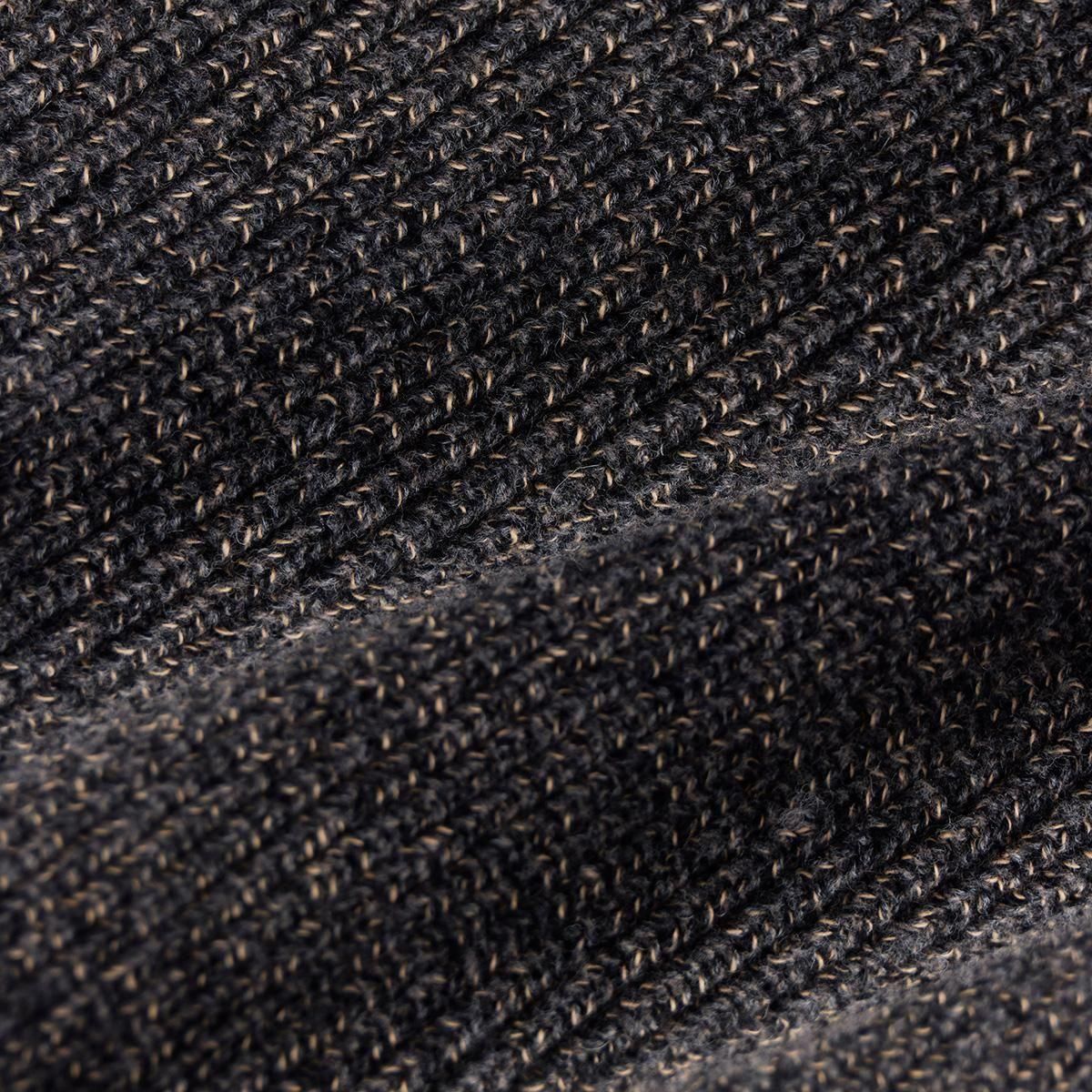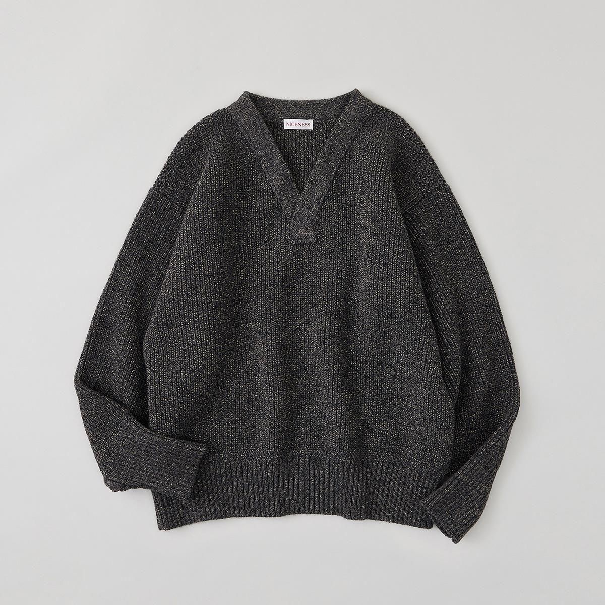 英国羊毛と南米ウールをブレンドした糸で編み立てたシャンブレーメカニカルビーチ セーター。1930〜1960年代のUSビーチジャケットにインスピレーションを受け、現 代の生活に合わせラフに着用できるようデザイン。U.S.ARMY AIR FORCEのa-1セー ターをリファレンスにアップデートさせています。バルキー性とハリ感のある糸を ベースに甘撚り糸をアクセントにし、細かな杢の見え方になるよう設計しています。