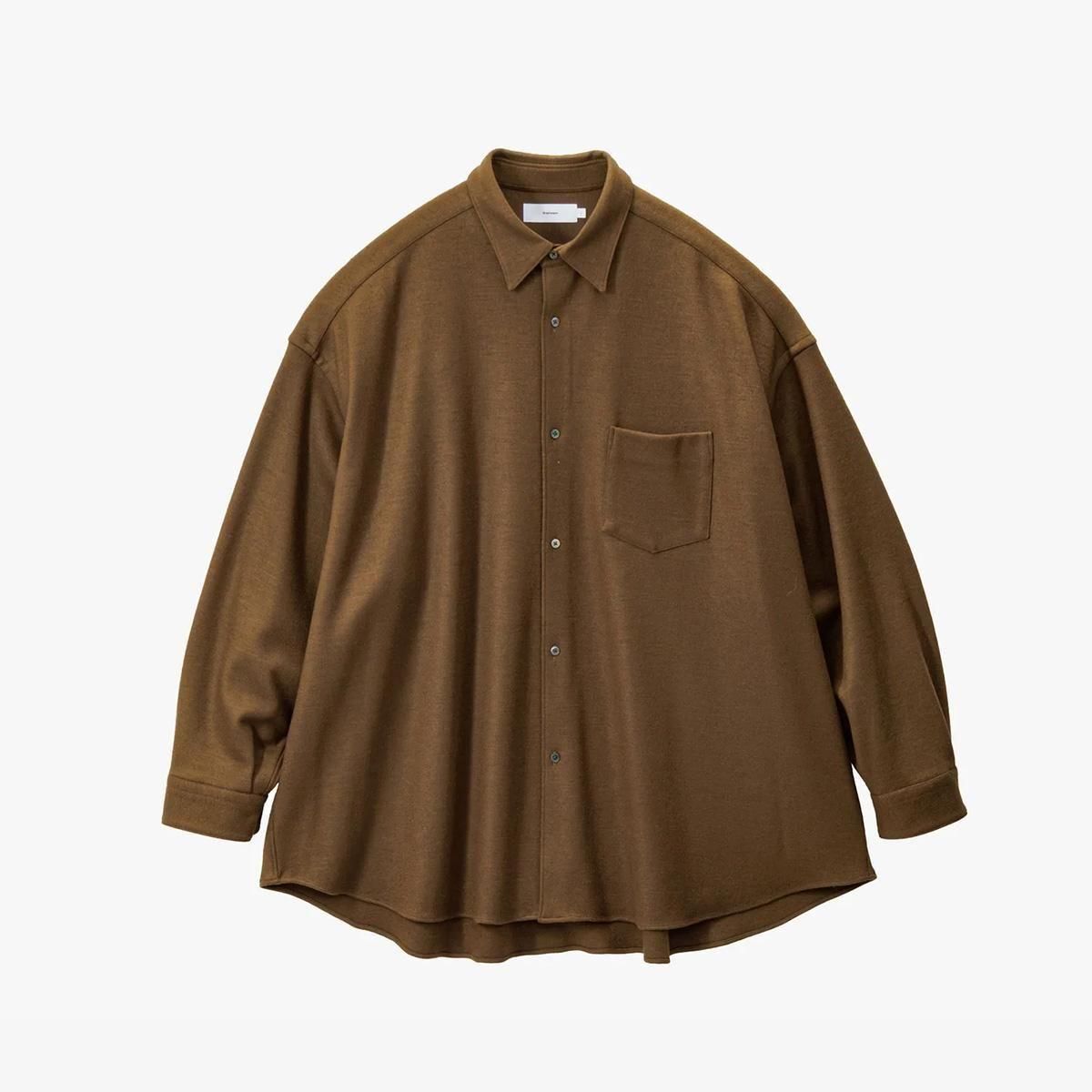 上質なウールスムースを高圧でミルド加工し、フランネルのような表情に仕上げたレギュラーカラーシャツ。圧縮による適度なハリと柔らかさを備え、スケールオフ加工でハンドウォッシャブルも可能。上品な光沢としなやかなドレープが魅力。冬に最適なウォーム感のあるオーバーサイズフィットで、日常から上質を感じられる一着に。