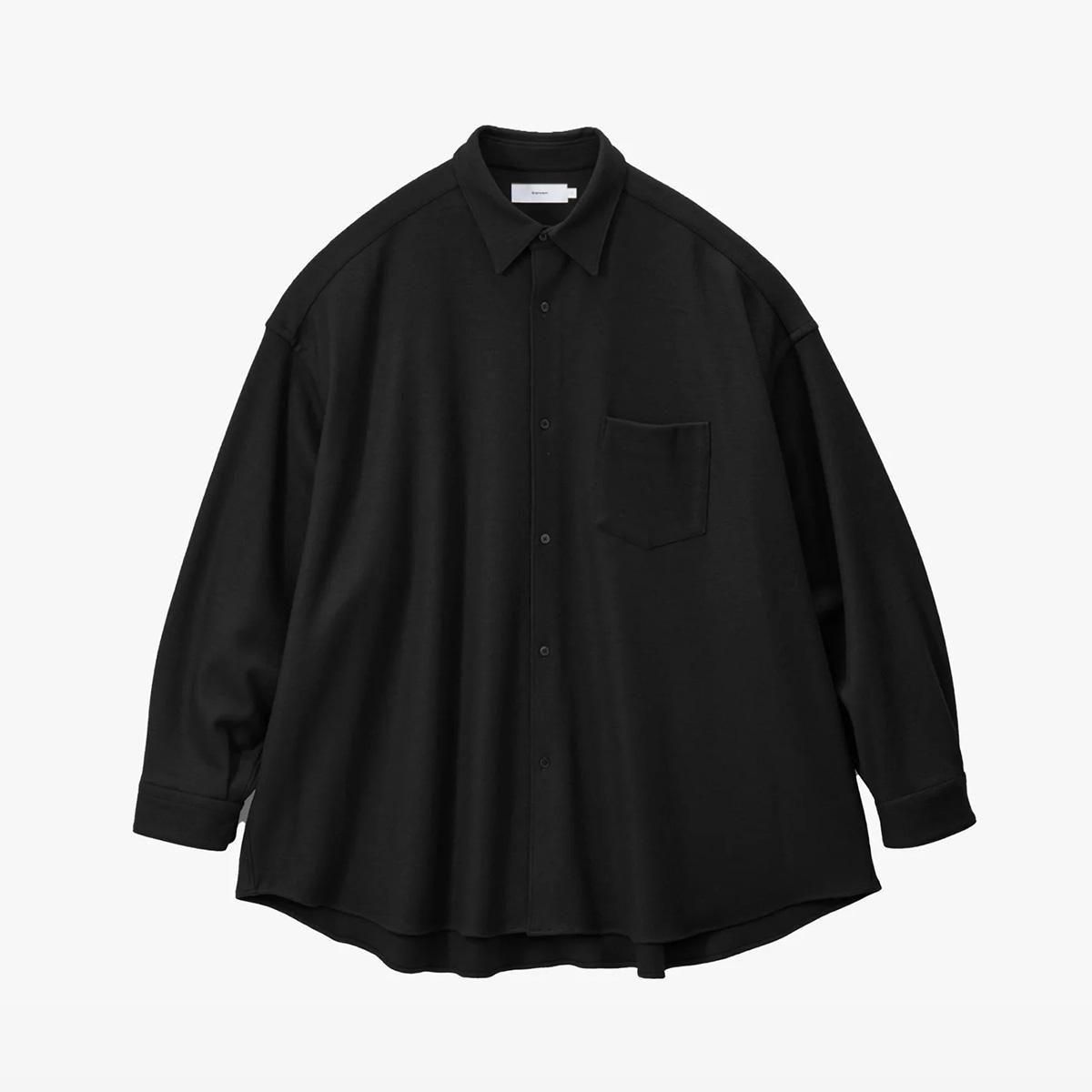 上質なウールスムースを高圧でミルド加工し、フランネルのような表情に仕上げたレギュラーカラーシャツ。圧縮による適度なハリと柔らかさを備え、スケールオフ加工でハンドウォッシャブルも可能。上品な光沢としなやかなドレープが魅力。冬に最適なウォーム感のあるオーバーサイズフィットで、日常から上質を感じられる一着に。