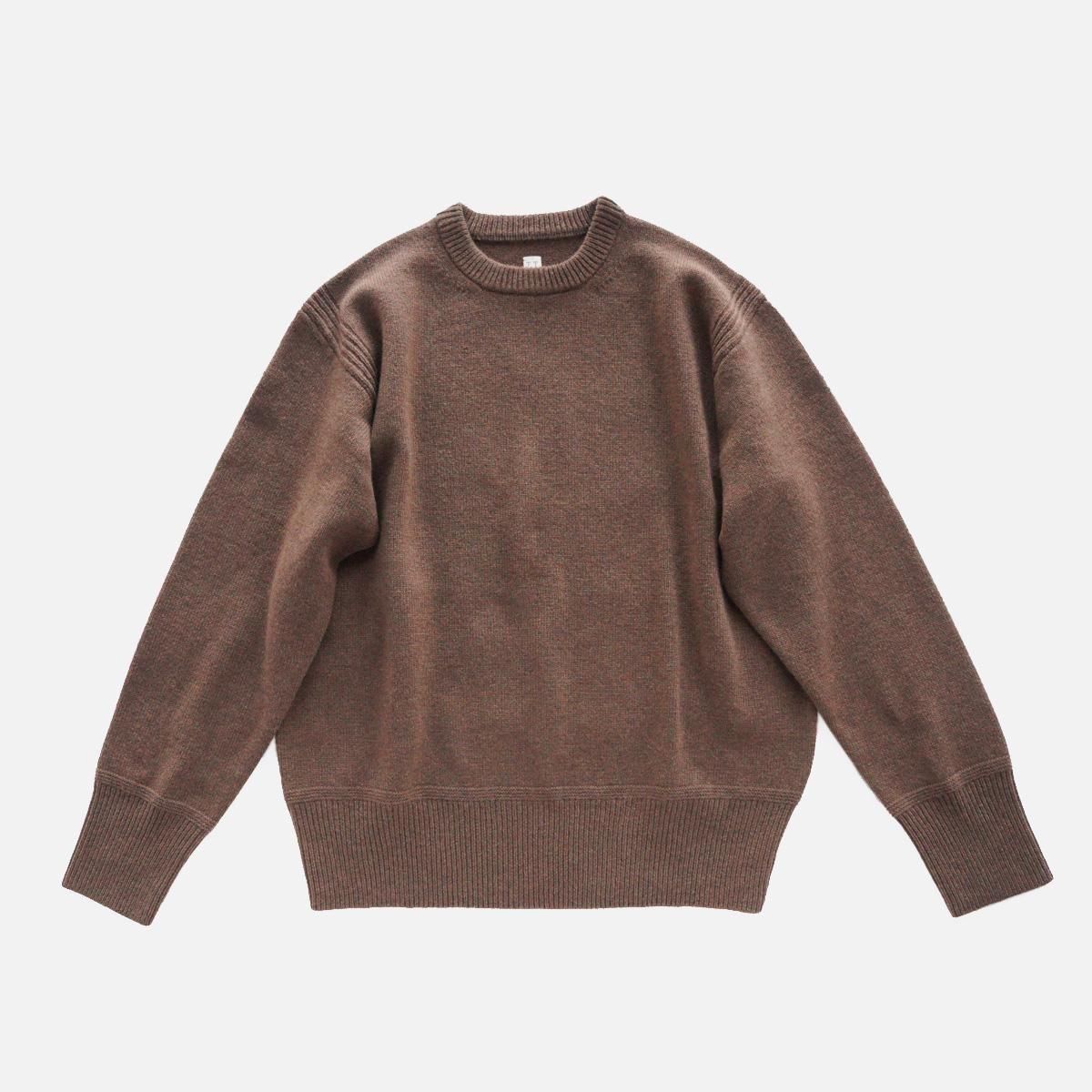1940年代にスポーツウェアとしてアメリカで作られていたセーターがベースのクルーネックプルオー バーニット。肩に入ったリブ、長めのウエストと袖口のリブが特徴。 貴重なホワイトカシミヤとエクストラファインラムウールを混紡した糸を使用。カシミヤのぬめり感・柔 軟性と、ウールの膨らみと弾力性を兼ね備えた、軽くて暖かく、肌に優しい編み地に仕上がっています。