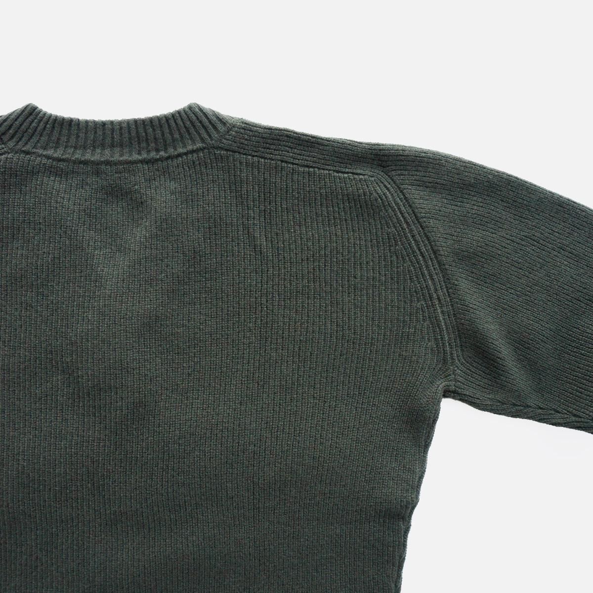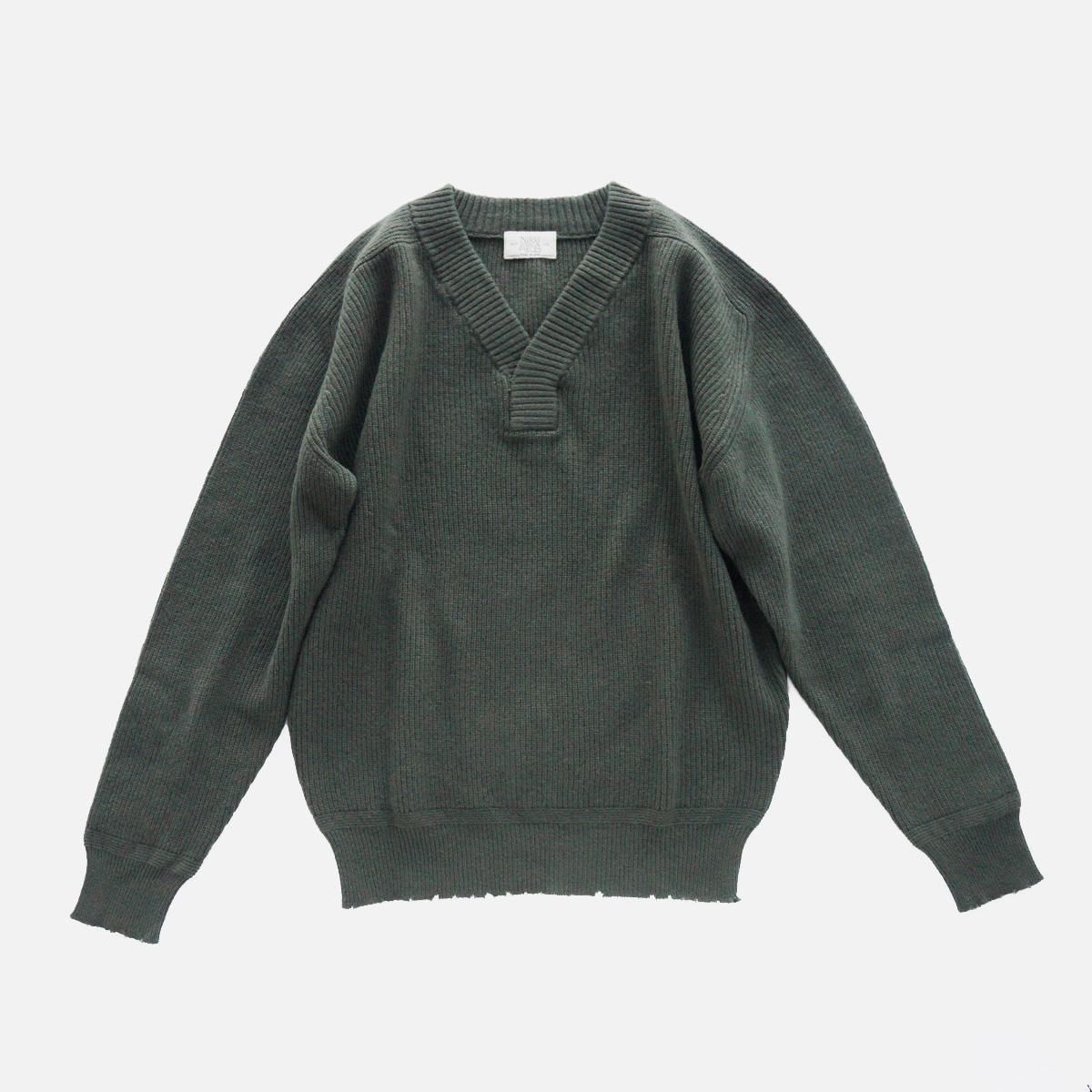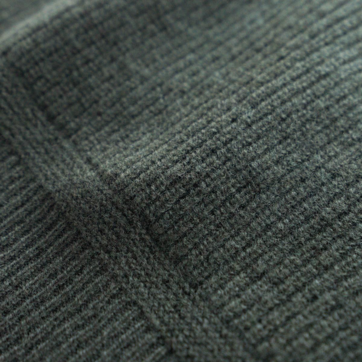 冬に着やすく厚すぎない編地で表情のある編地を作成。デザインはアメリカ空軍の整備士用ニットA1をベースにデザインアレンジしたVネックプルオーバー。肩で切り替え、肩章を袖まで続けることでサーマルを彷彿とさせるデザインに。袖口、裾に裁ち切り風のデティールを入れています。オーストラリア産メリノ種のエクストラファインラムズウール(18.5〜19/マイクロン)を厳選し用いた糸で、保温性・保湿性に優れ、非常に繊細で柔らかく軽量であり、かつ弾力性のある膨らみがポイント。