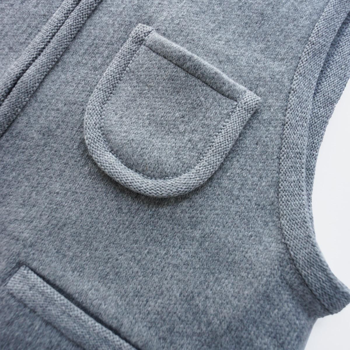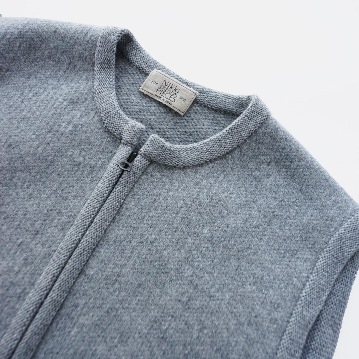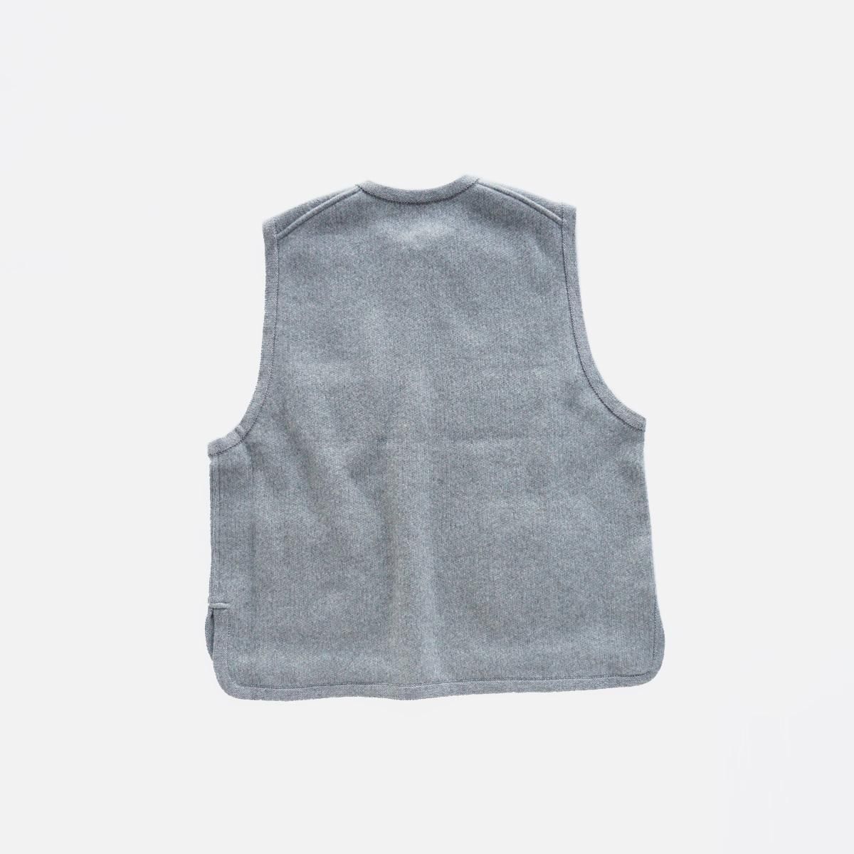 作業をする際に袖のないベストは体を温めてくれながらも邪魔をしない、道具のような便利なアイテム。ナイロンのインナーダウンが苦手な方へもおすすめの機能性をもちながら、シャツ等を重ねて装うこともできます。オーバーサイズですが、縮絨されたウールが立体的なシルエットを出してくれるため、ワンピースと合わせて女性にもおすすめのベスト。素材は、中国内蒙古産の貴重なホワイトカシミヤとオーストラリア産メリノ種のファインラムズウールを混紡した糸2本とカムバック種のラムズウール1本を組み合わせ編み、縮絨加工することで、しなやかさがありながらも軽くスポンディッシュで布帛の柔らかいメルトンをイメージして作成。