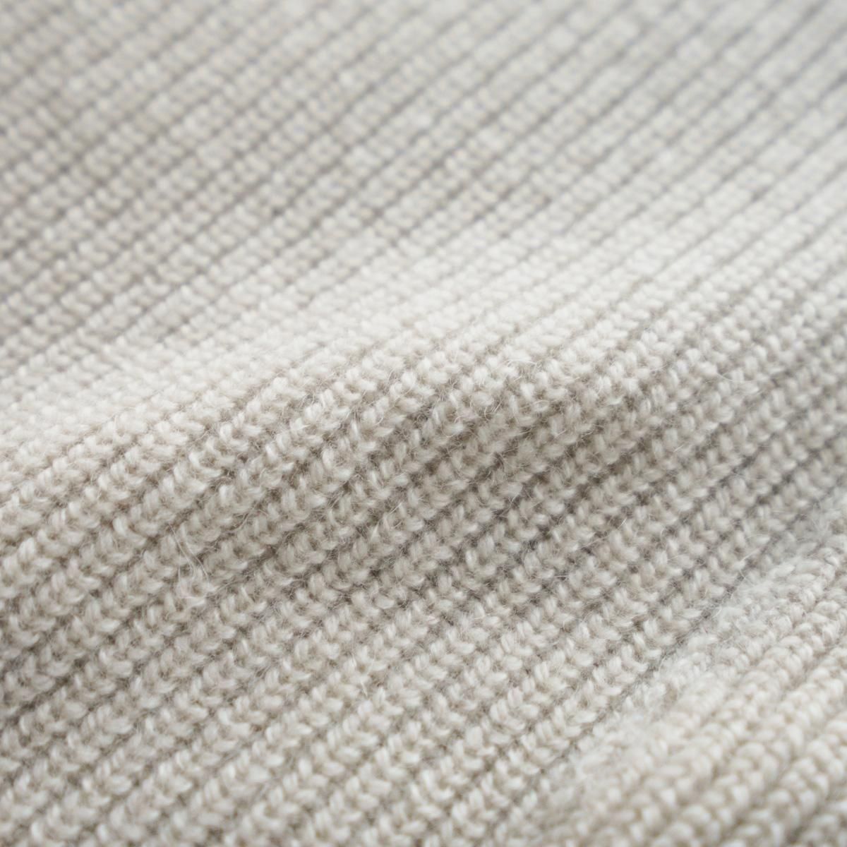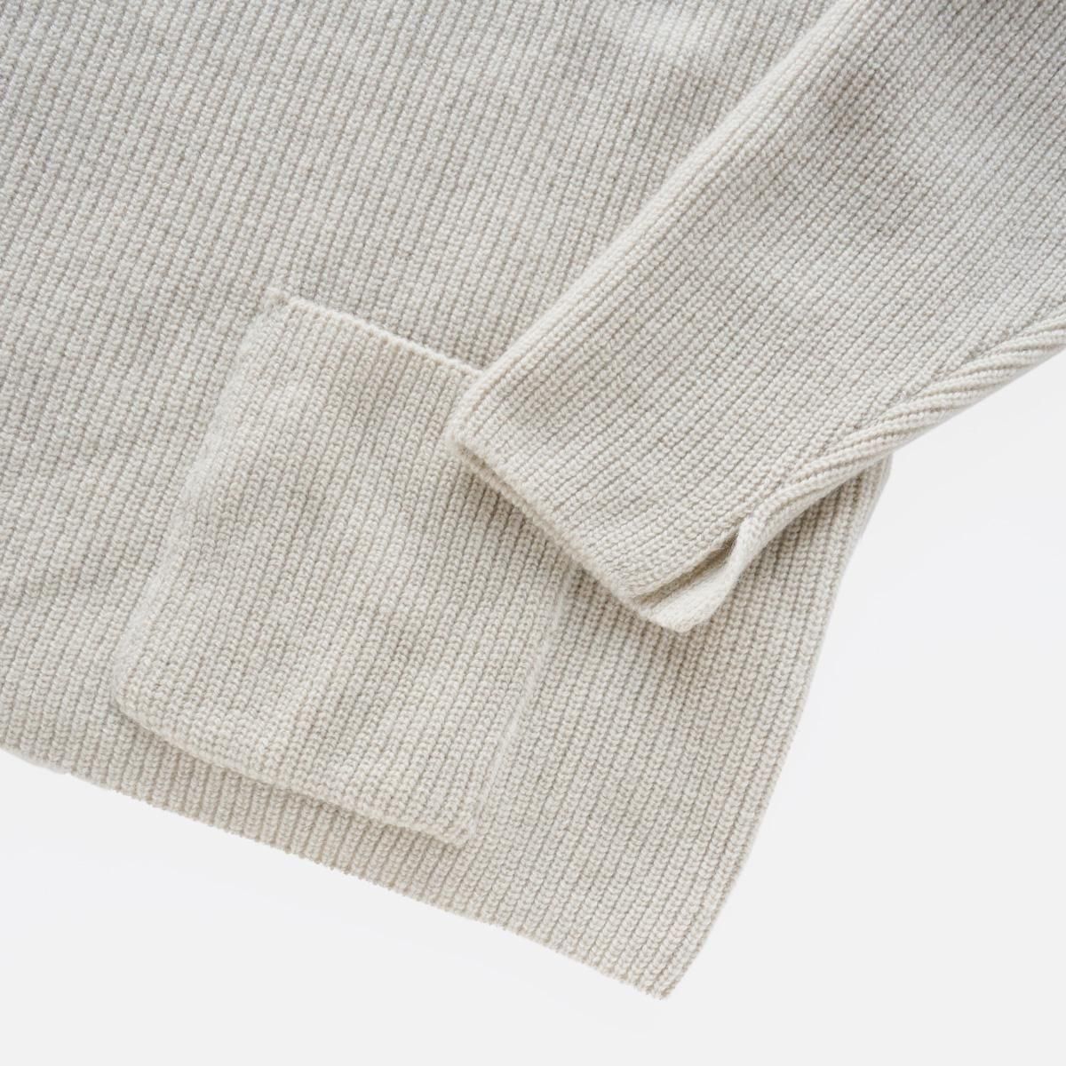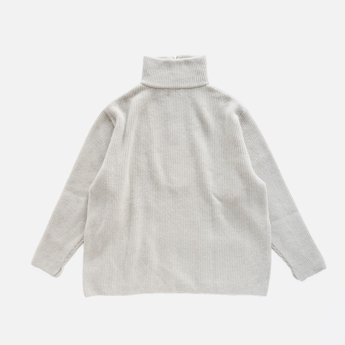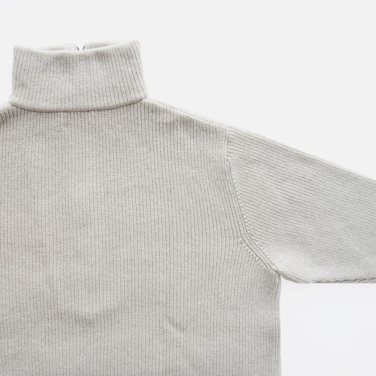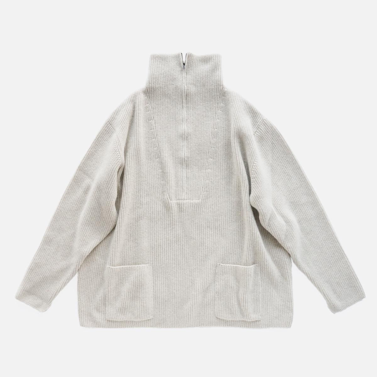 ヤクの糸にウールカシミヤの糸を撚糸することで、更に膨らみを増し、バルキーな編地で作成した着丈長めのハーフZIPプルオーバー。下目についているポケットにアンバランスさがポイントです。