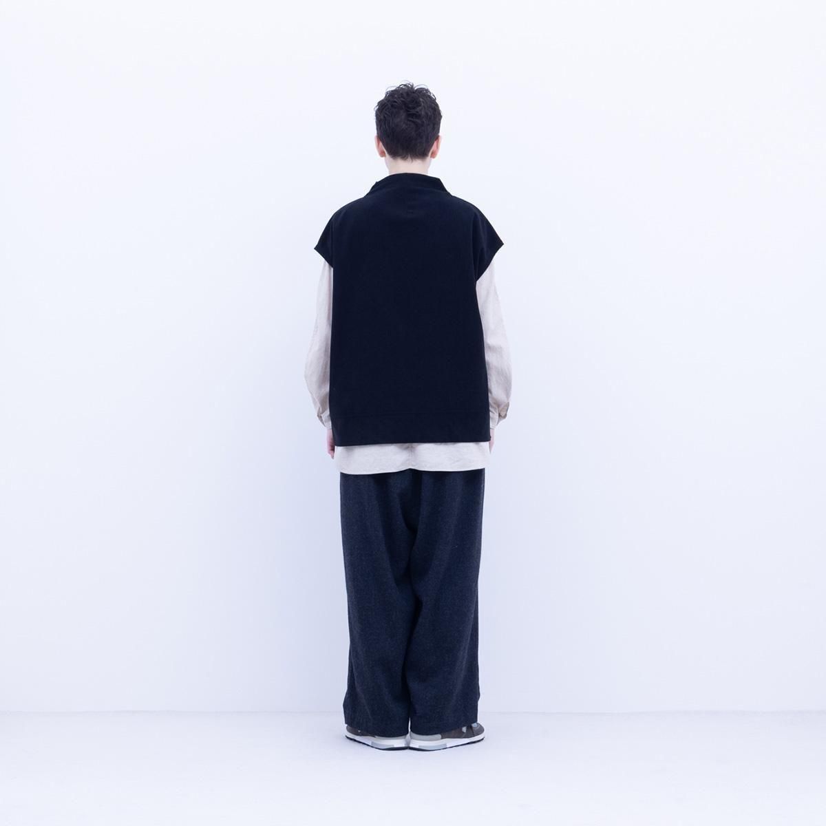 粗いざっくりとした古いウールの感じを出すために、反毛などを使用したウールの千鳥柄の平織り生地を使用した3タックパンツ。製品洗いとタンブラー乾燥をし揉み込むことで、ストレッチ性や風合いを出しています。ゆるいテーパードシルエット。※ご自宅でお洗濯をしていただくことも可能ですが、必ずウール洗い用の洗剤を使用し、水に浸す時間をできるだけ短く手洗いを行なってください。乾燥させる際は日陰で陰干しの上、必ず完全に乾燥したことを確認してから保管するようにしてください。