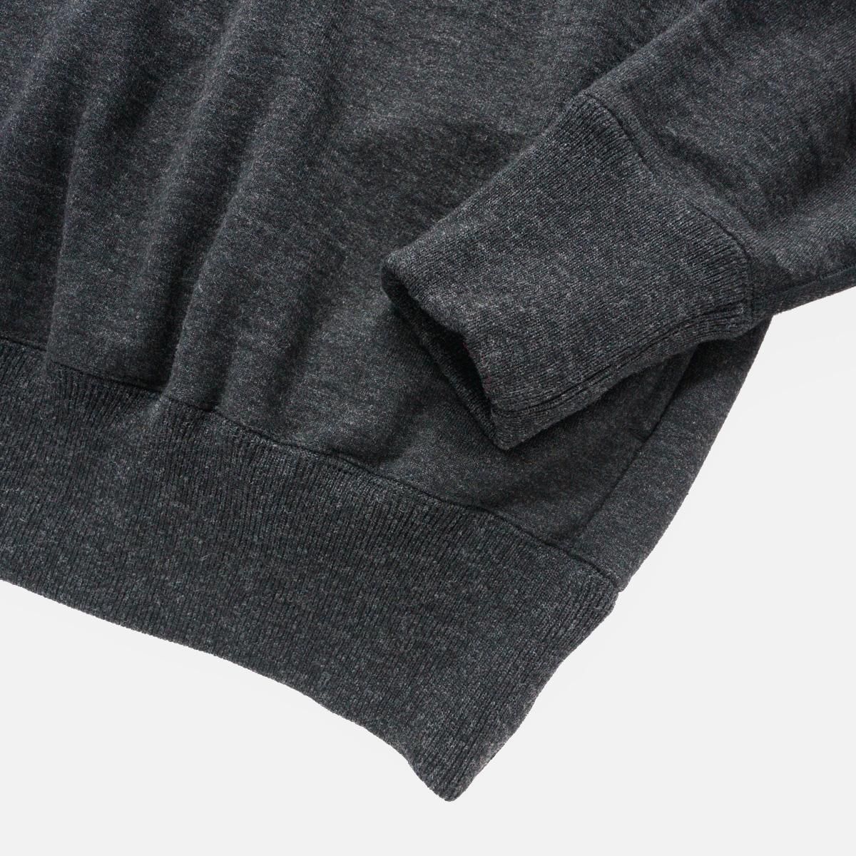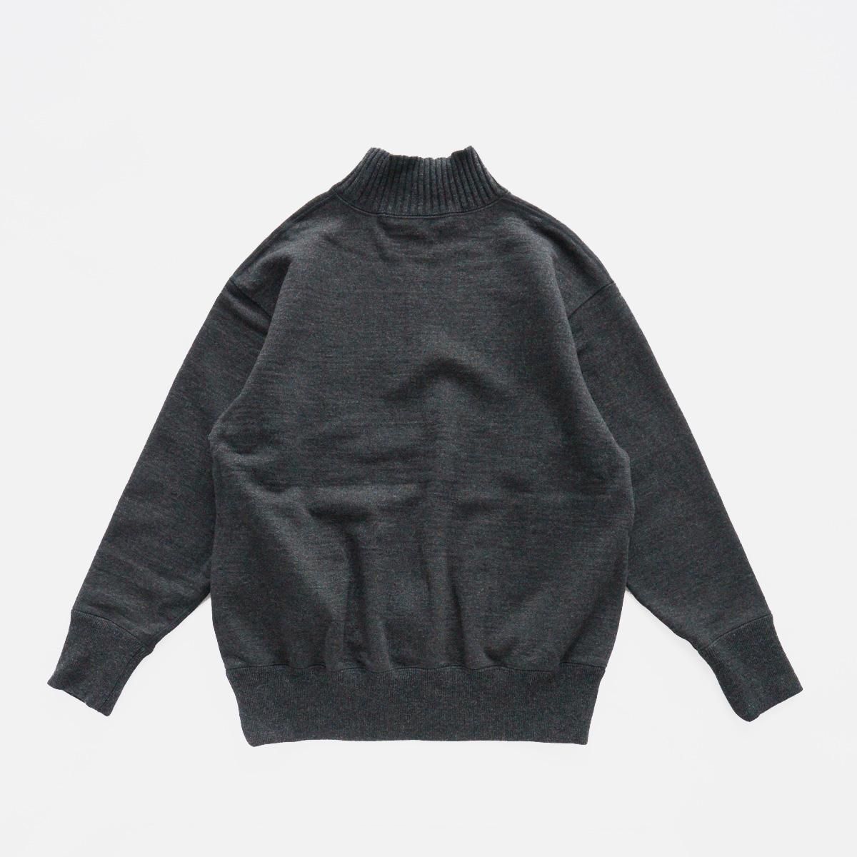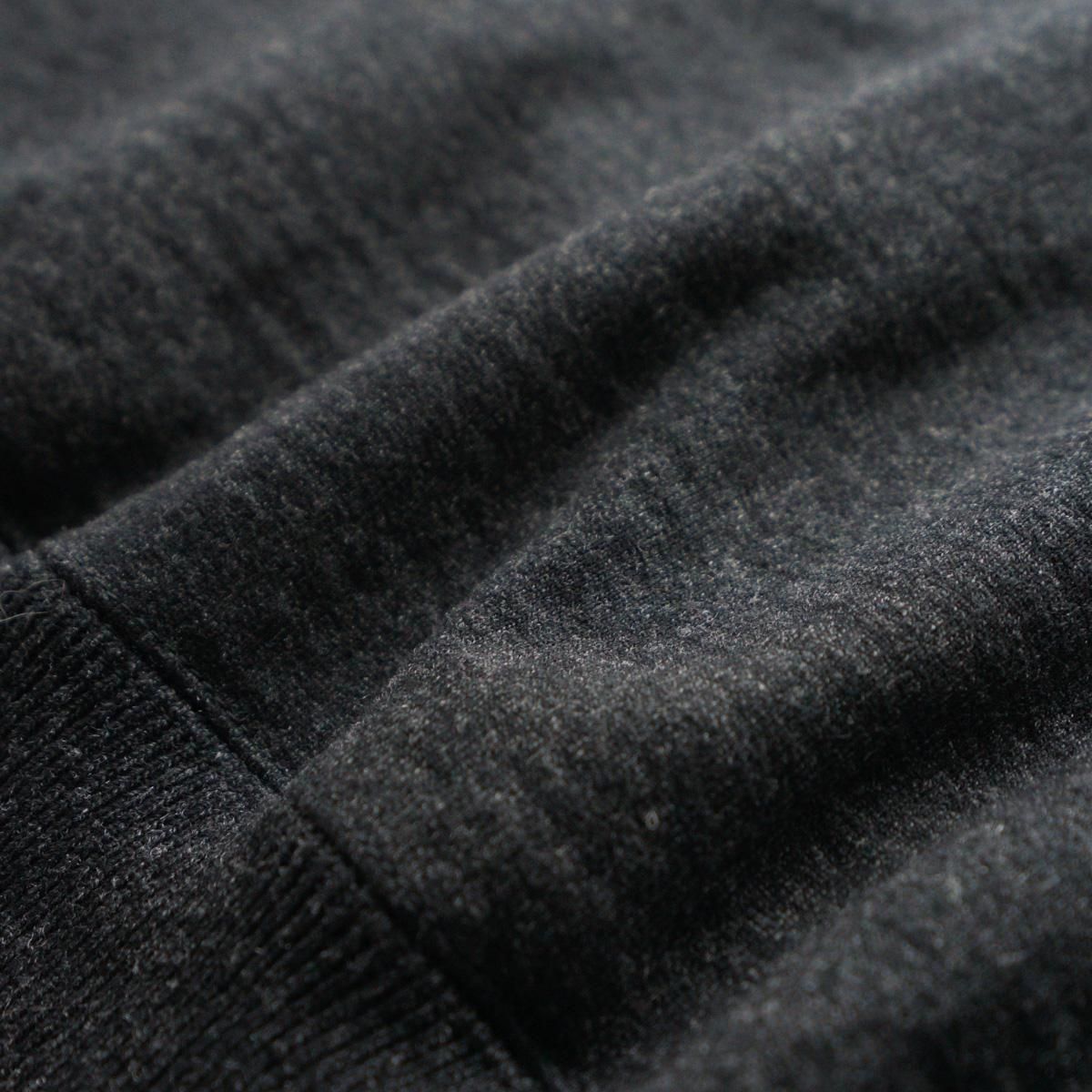 ヴィンテージの資料であったスウェットシャツをイメージして作られたモデル。網立てを生かし襟の網み組織を変えたリブで、セーターのようなニュアンスに仕上がっています。脇下にマチを入れることで、機能性とゆったりとした着心地を実現。ポケットは少し前に脇線を振って、手の入れやすさにも配慮しています。生地は表面もパイル面もウォッシャブルの紡毛ウール素材で、がちっと度目を詰めて編まれています。そのため冷たい風を通さない暖かさとヘビーユーズしても大丈夫な頑丈さが特徴です。