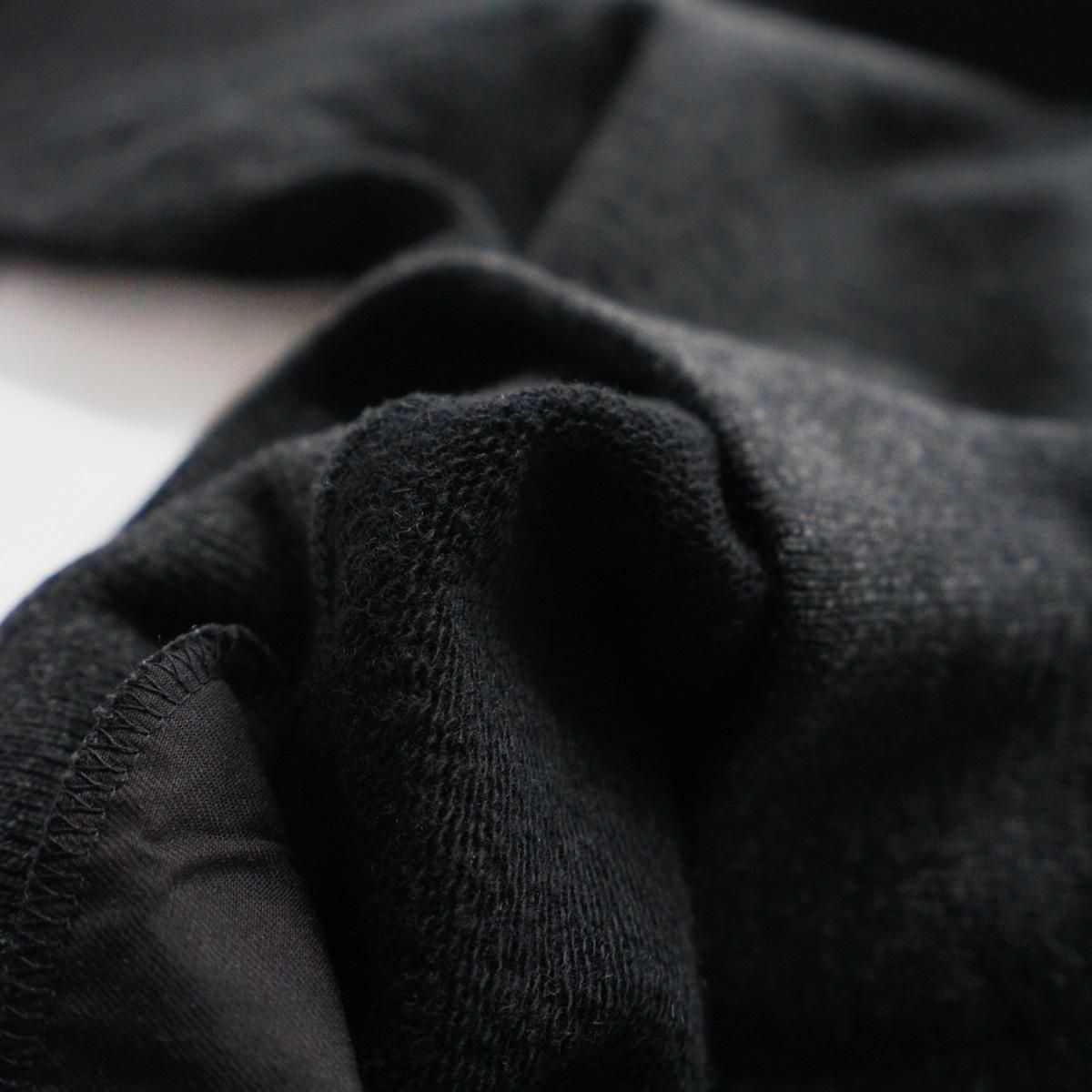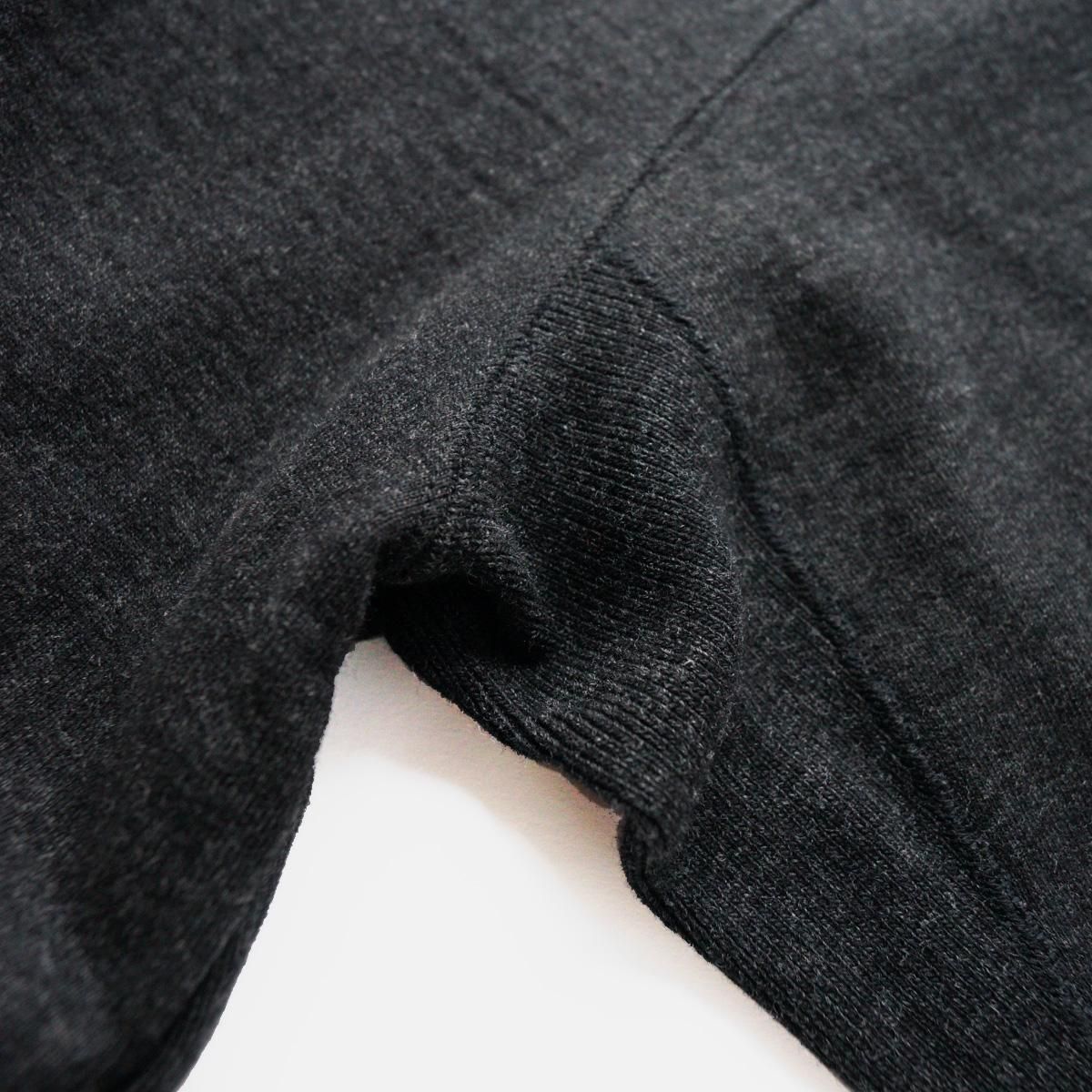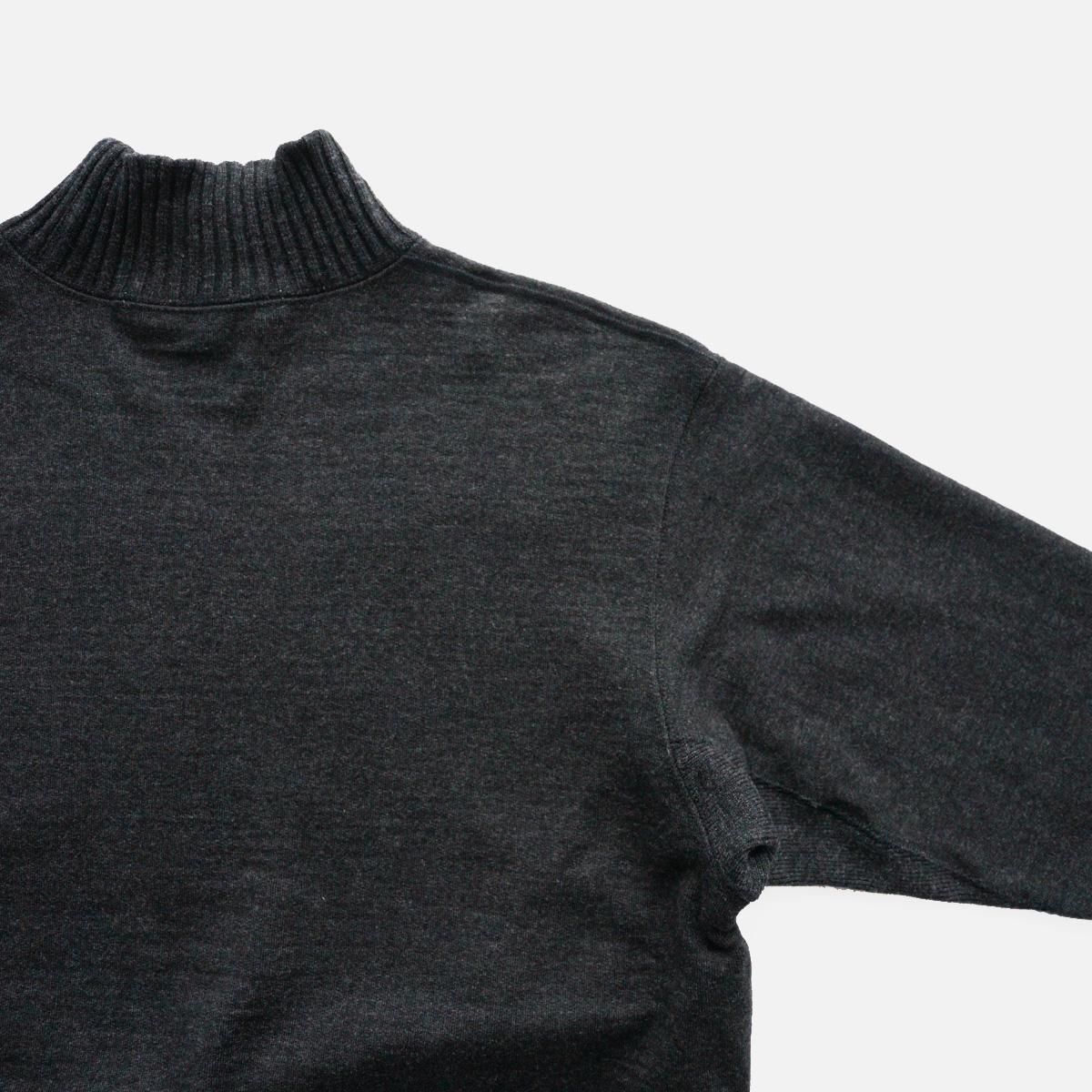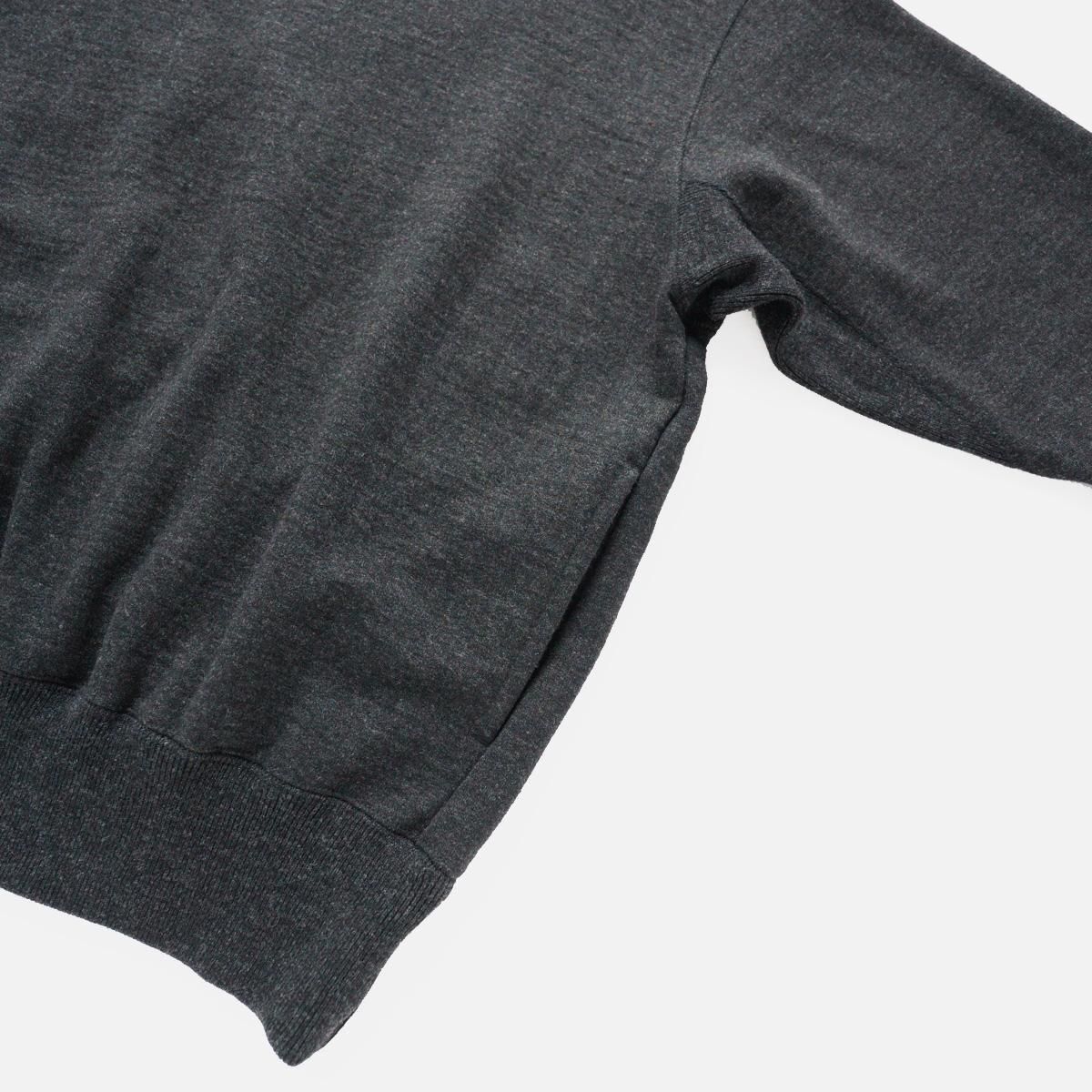 ヴィンテージの資料であったスウェットシャツをイメージして作られたモデル。網立てを生かし襟の網み組織を変えたリブで、セーターのようなニュアンスに仕上がっています。脇下にマチを入れることで、機能性とゆったりとした着心地を実現。ポケットは少し前に脇線を振って、手の入れやすさにも配慮しています。生地は表面もパイル面もウォッシャブルの紡毛ウール素材で、がちっと度目を詰めて編まれています。そのため冷たい風を通さない暖かさとヘビーユーズしても大丈夫な頑丈さが特徴です。