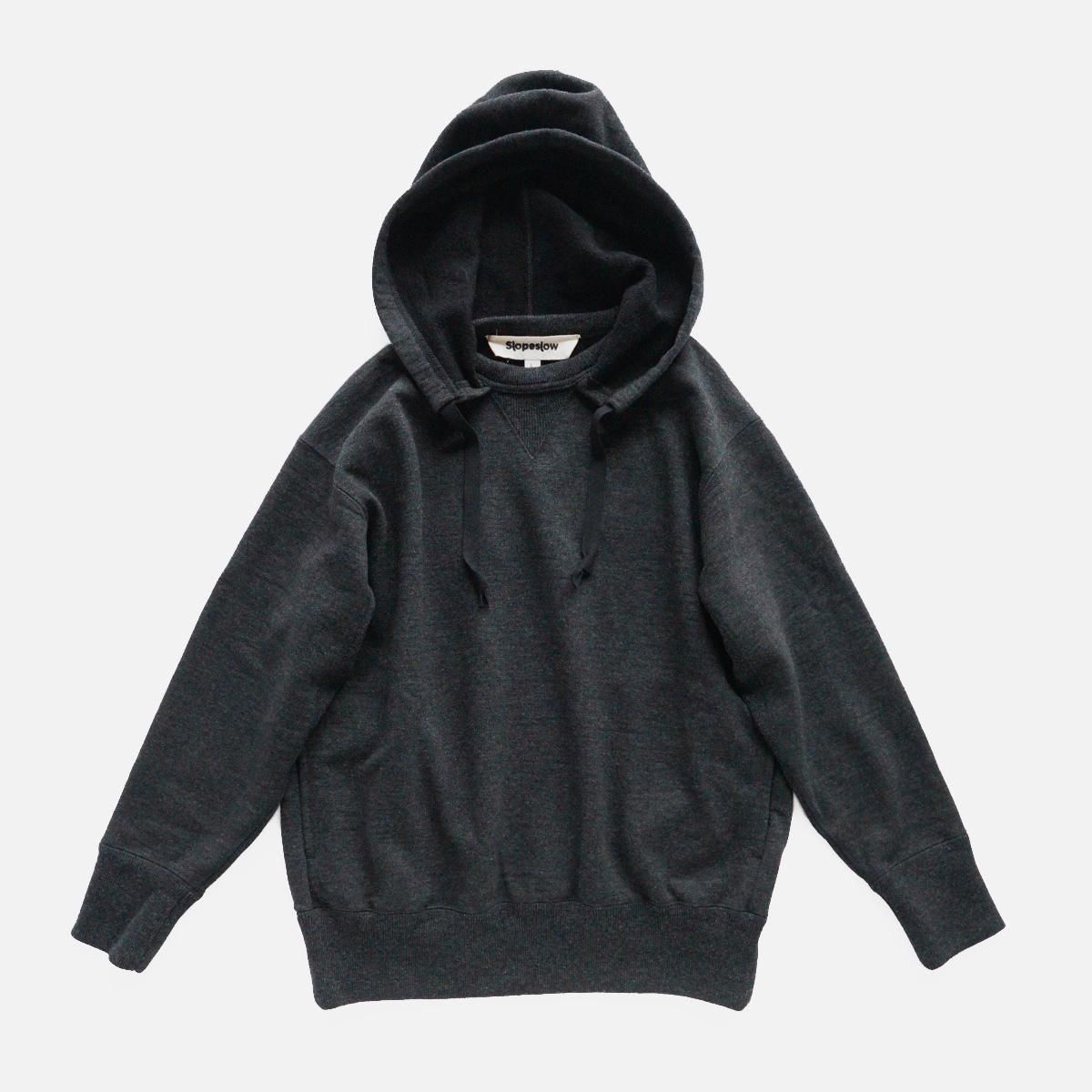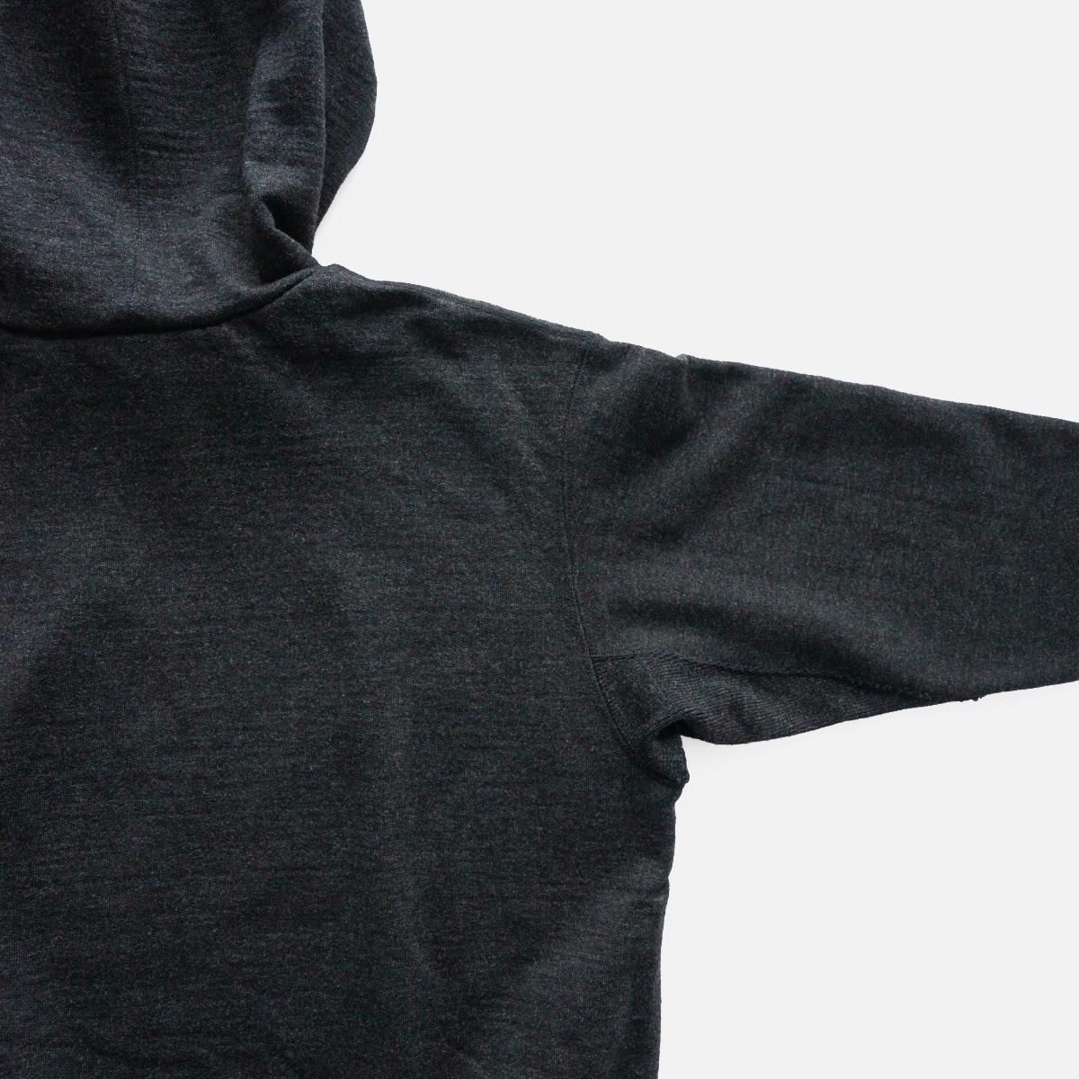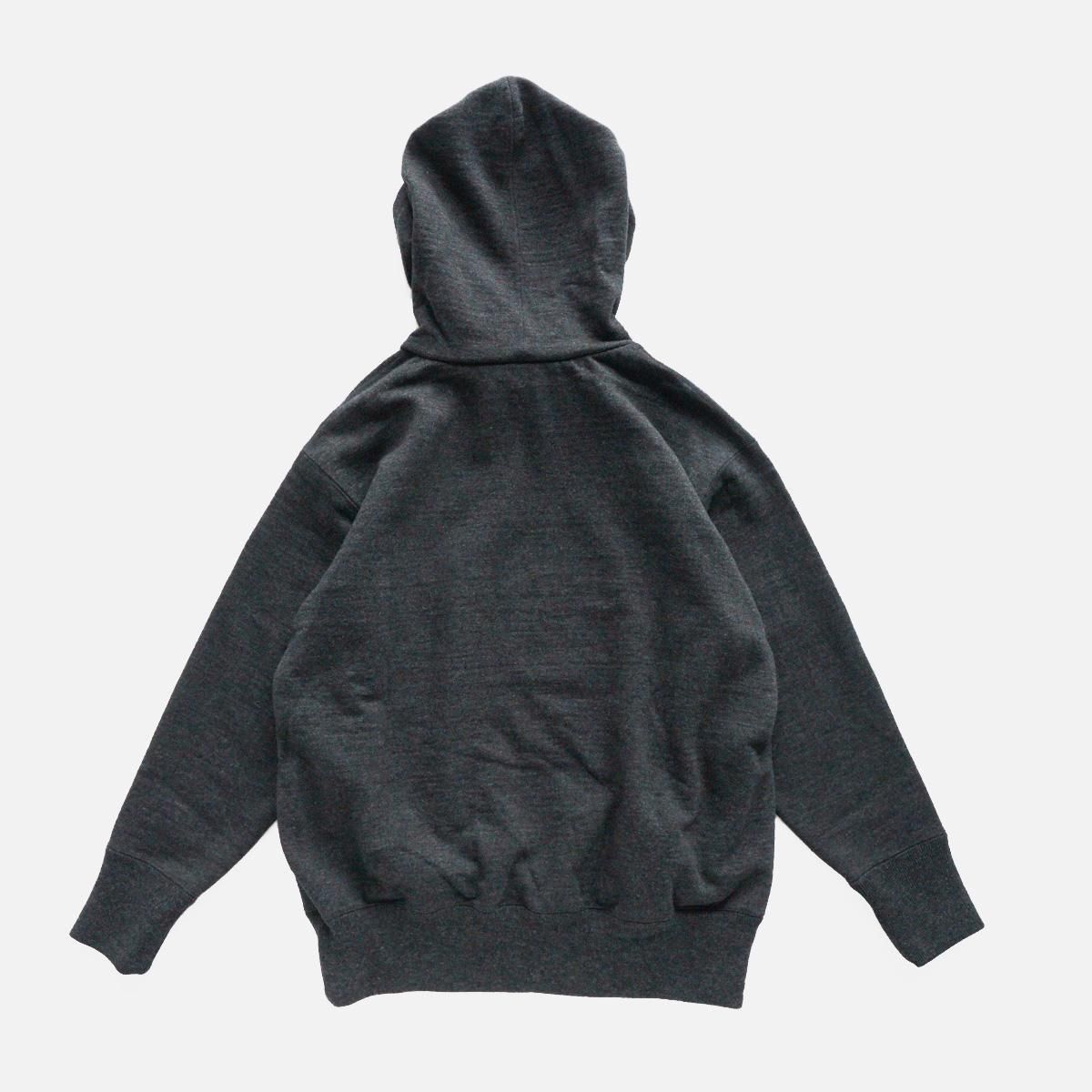 ヴィンテージ市場で人気の高い”後付けフーディー”をモデルにして作られたフーディー。モダンな印象で着られるよう、カンガルーポケットではなくポケットは脇に配置し、少し前に脇線を振ることで手の入れやすさにも配慮しています。さらに脇下にマチを入れることで、機能性とゆったりとした着心地を実現。生地は表面もパイル面もウォッシャブルの紡毛ウール素材で、がちっと度目を詰めて編まれています。そのため冷たい風を通さない暖かさとヘビーユーズしても大丈夫な頑丈さが特徴です。
