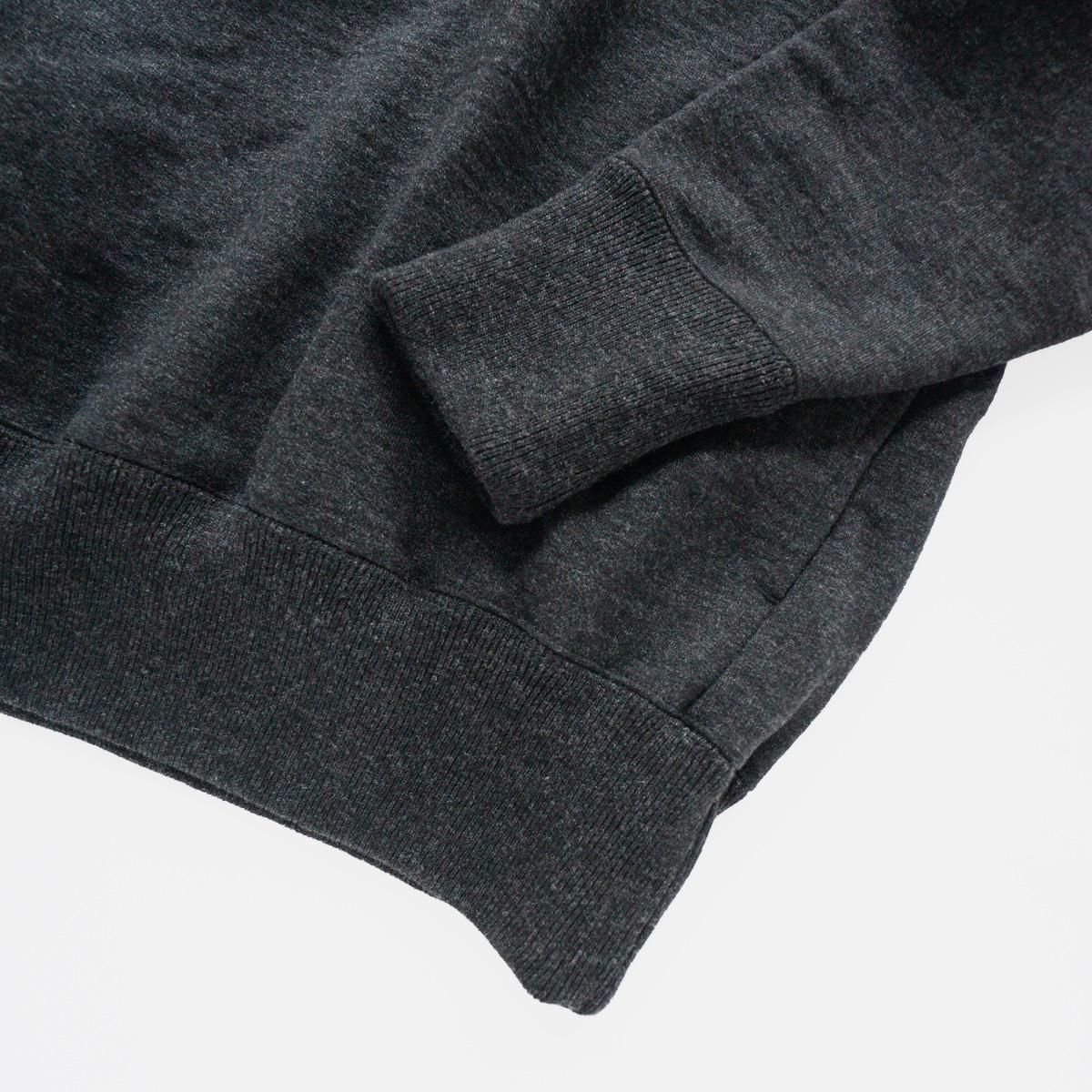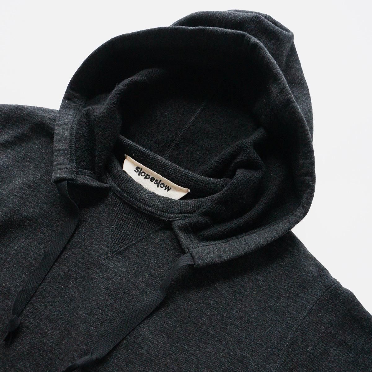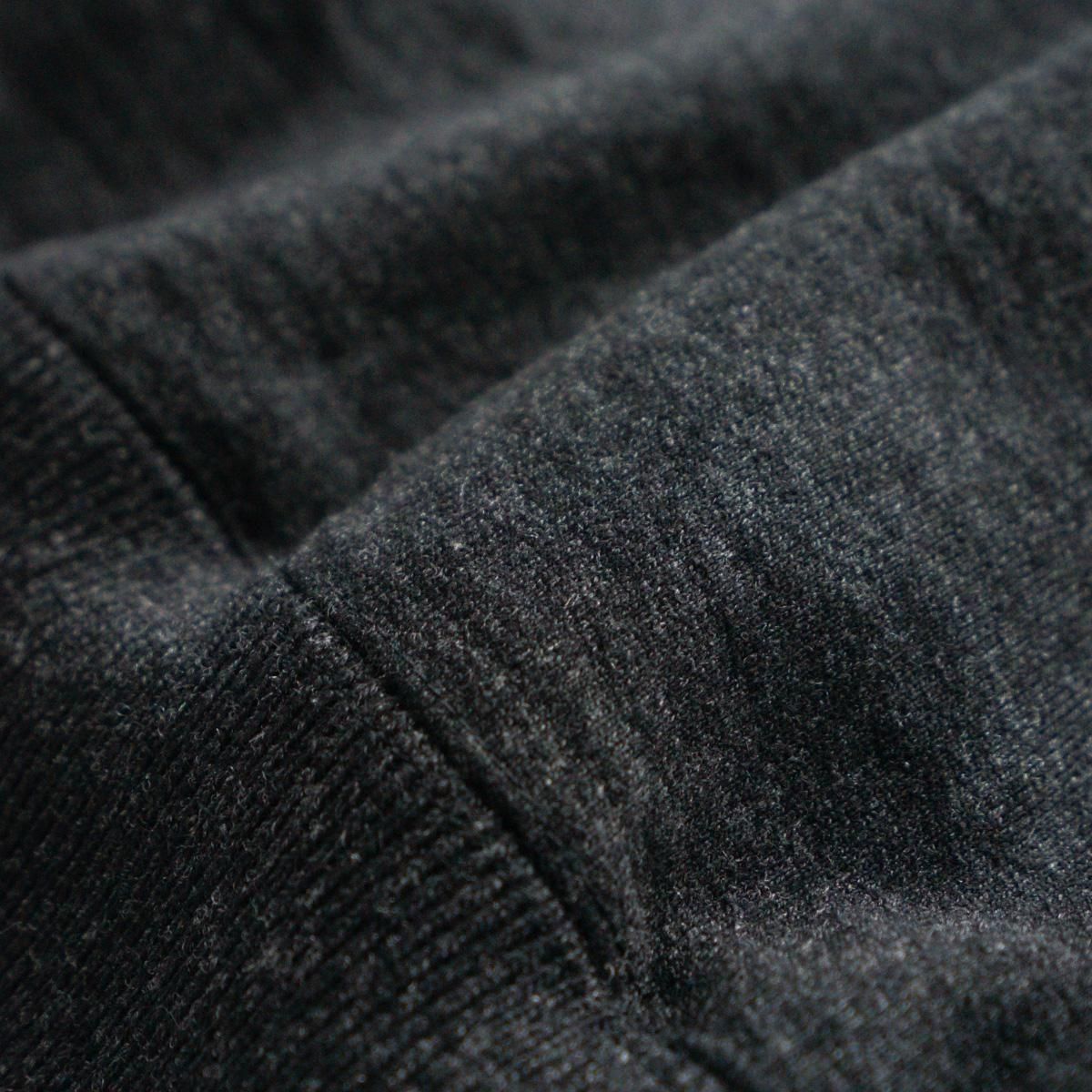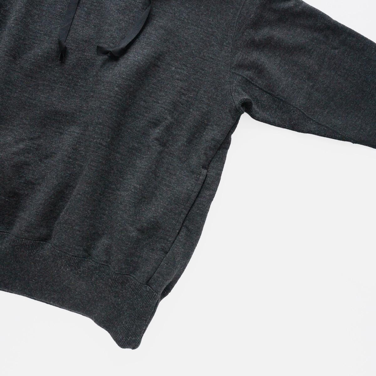 ヴィンテージ市場で人気の高い”後付けフーディー”をモデルにして作られたフーディー。モダンな印象で着られるよう、カンガルーポケットではなくポケットは脇に配置し、少し前に脇線を振ることで手の入れやすさにも配慮しています。さらに脇下にマチを入れることで、機能性とゆったりとした着心地を実現。生地は表面もパイル面もウォッシャブルの紡毛ウール素材で、がちっと度目を詰めて編まれています。そのため冷たい風を通さない暖かさとヘビーユーズしても大丈夫な頑丈さが特徴です。