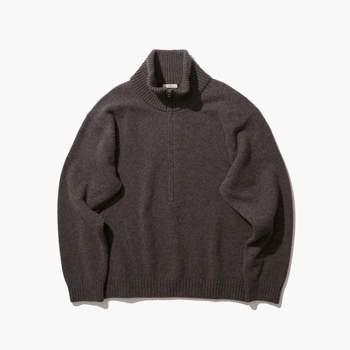 程良いリラックス感が特徴のハーフジップセーター。天竺7ゲージを採用し、適正度目で膨らみある着心地に仕上げました。衿は、リブダブル付けを採用しており、ボリュームある見た目です。裾のリブが締まりすぎておらず、カットソーのようなシルエットを採用しています。オーストラリア産の、光沢がありソフトで軽く、嵩高性に富んでいるラムウールを原料とした糸を強撚にしたニット素材です。原料の特性と編地の表情感がマッチした、非常に軽く、ソフトでスポンジッシュな素材です。