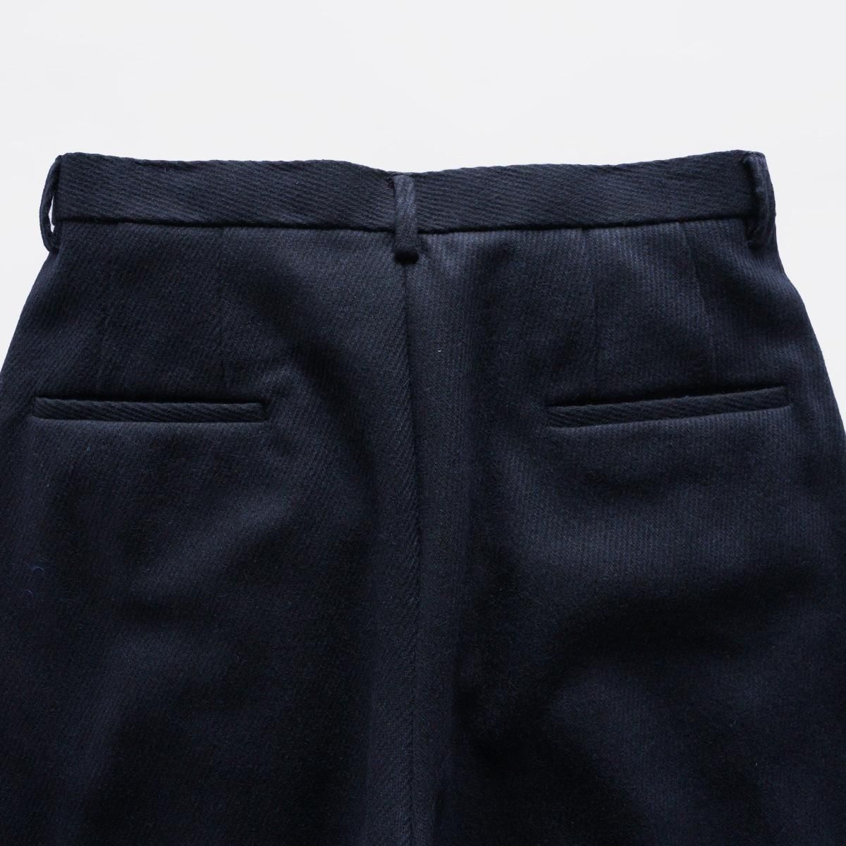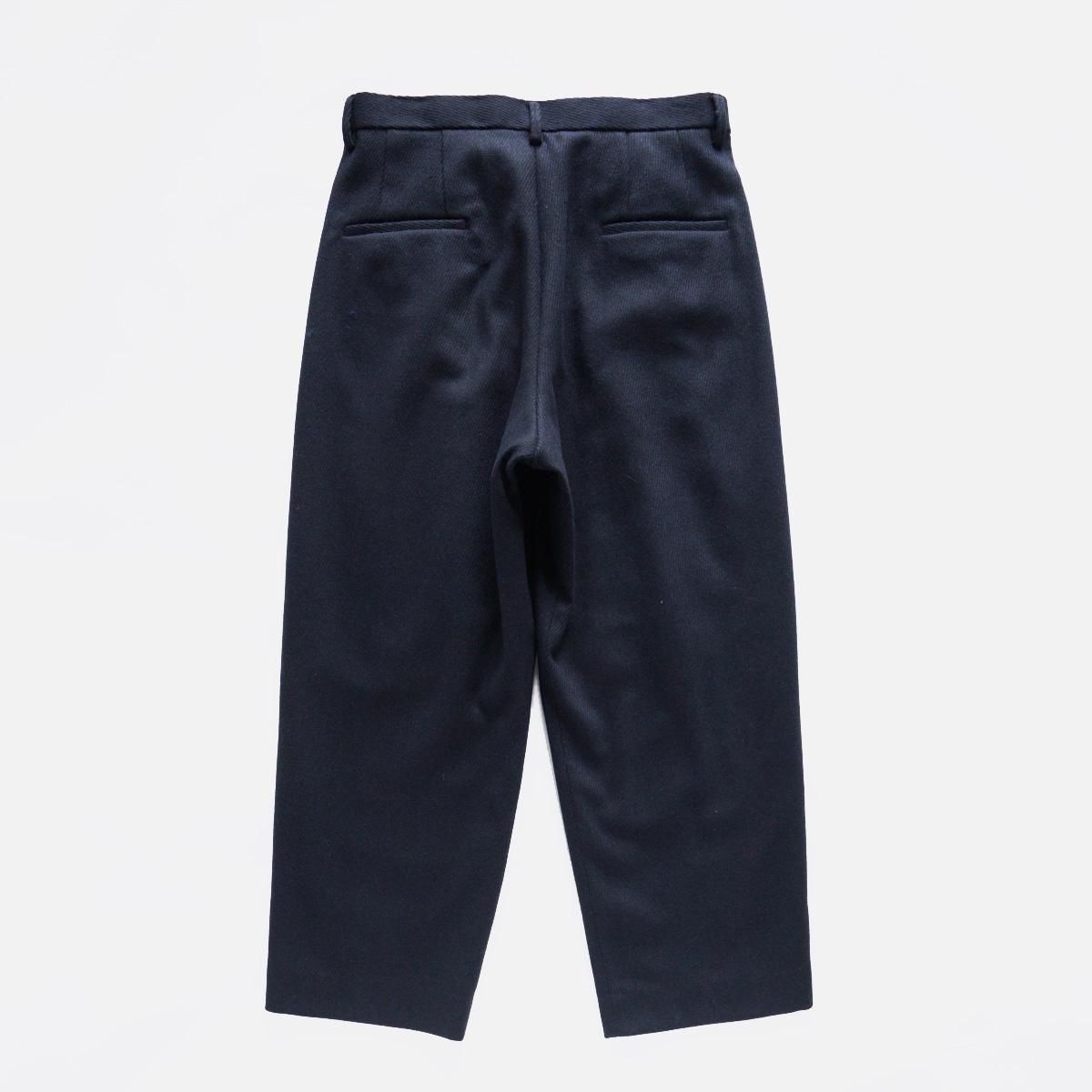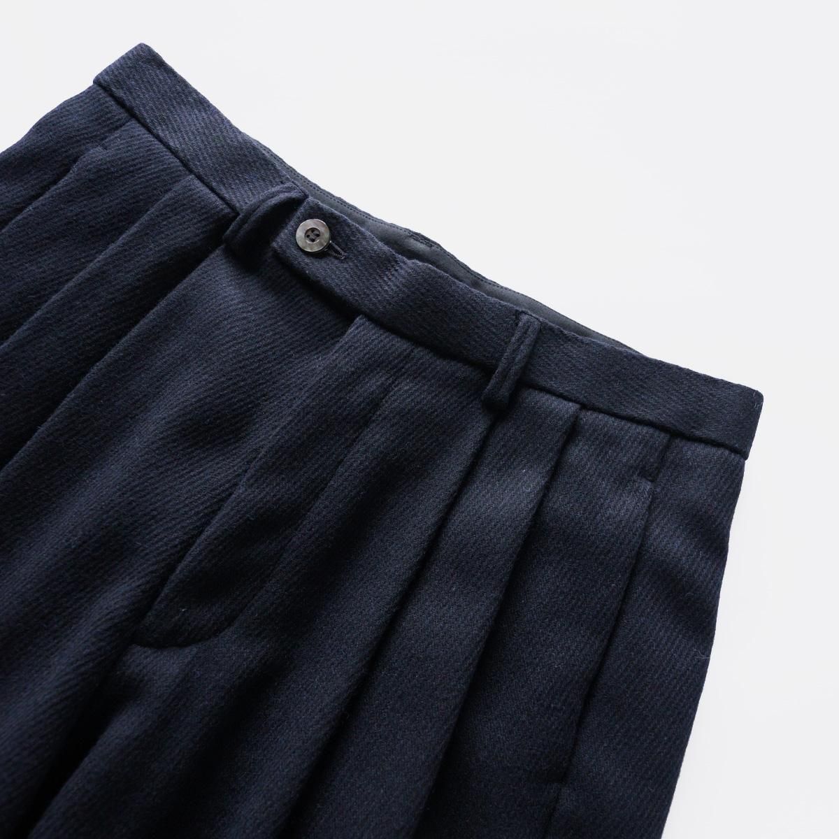 カシミヤ混のとろみとしなやかさがある生地を使用したスラックス。程よく広いすそ幅と2プリーツのデザインです。