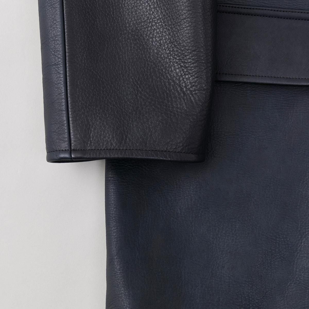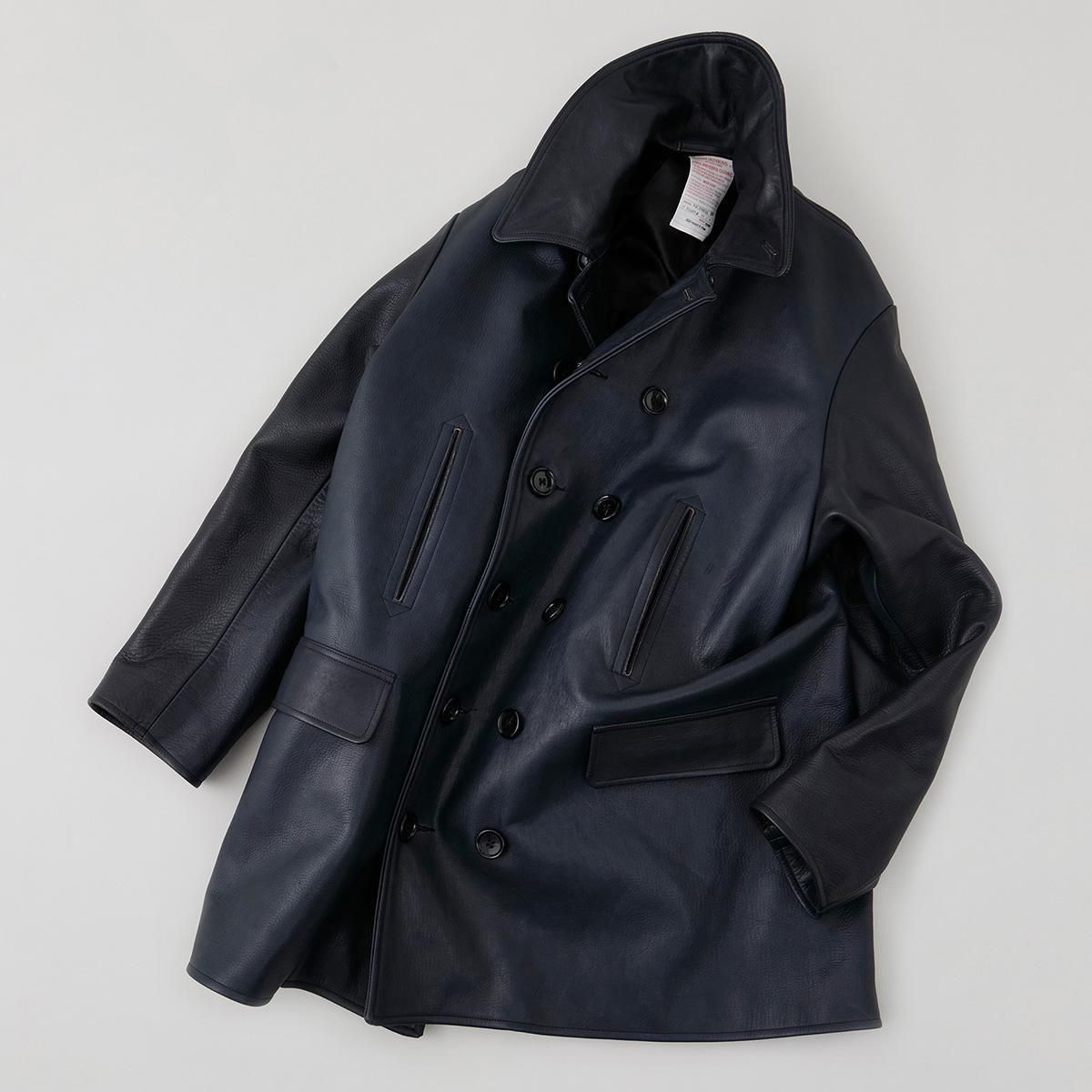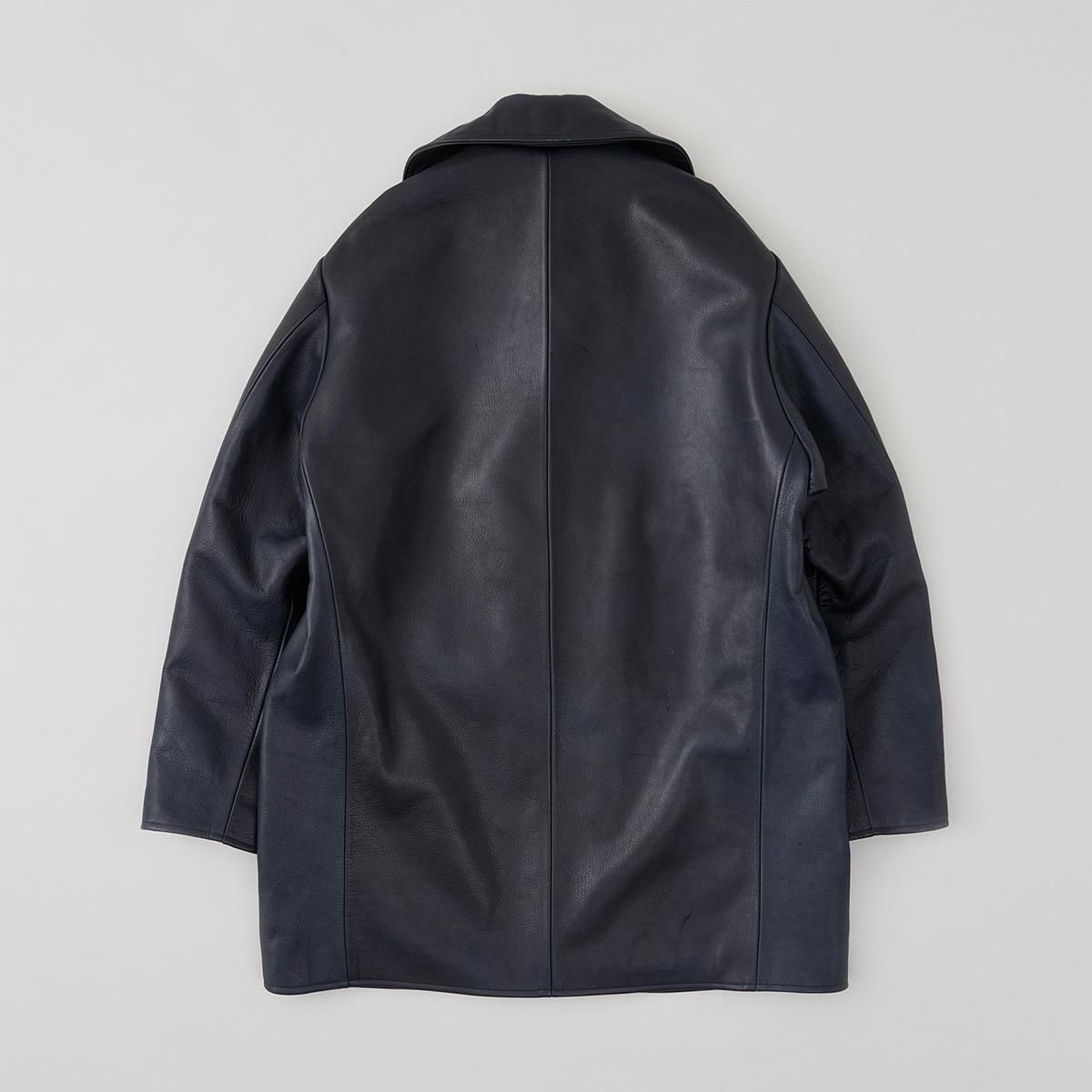 茶芯の牛革タンニンレザーを使用した13ボタンレザーピーコート。様々な国のピー コートの歴史を紐解き、それぞれの要素を厳選して現代的に再構築しました。革の奥 の繊維層に茶色を残し、表面層に深く濃いネイビーカラーを着色しています。奥行き のある、やわらかな色合いに仕上げました。革の表面にあたりや擦れが生じると少し づつ下地の茶色が表出し、ヴィンテージライクな表情へと変化します。縫製はレザー 職人に依頼し、細部のディテールをアクセントにしました。