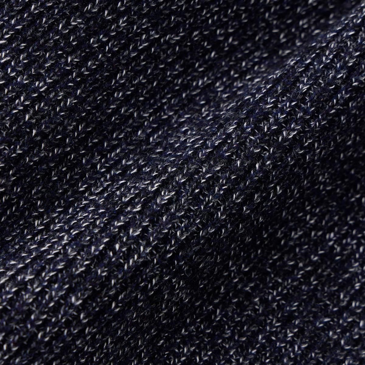 英国羊毛と南米ウールをブレンドした糸で編み立てたシャンブレービーチニットジャ ケット。1930〜1960年代のUSビーチジャケットにインスピレーションを受け、現代 の生活に合わせラフに羽織れるようにデザインしています。バルキー性とハリ感のあ る糸をベースに甘撚り糸をアクセントにし、細かな杢の見え方になるよう設計。ニッ ト成型後に別工場のレザー職人に依頼し、負荷のかかる箇所には全て牛革で縫製を加 え、ニットに見えない上質なビーチジャケットに仕立てています。